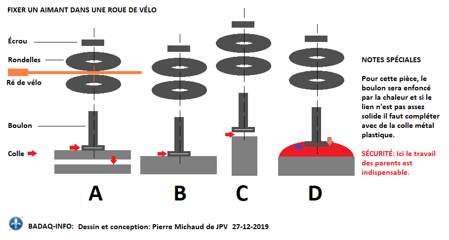 magnétisé. MV: Il est temps d'une petite pause avant la suite! (Cliquez ici). Dans cette partie de document il reste les points suivants à éclaicirs. (1) Ou prendre l'aimant et comment la fixé au vélo. (2) Le type de fil électrique à utiliser, sa grosseur (il faut qu'il soit de petit diamètre), et (3) le nombre de tour nécessaire pour produire l'électricité dont nous avons besoins pour notre lumière et les rondelles (4) ..en métal ou non... Tout ces éléments sont des inconnus faute d'avoir l'appareillage nécessaire à la mesure du champ magnétique d'un aimant. Nous allons donc développer une méthode de fabrication basée sur les essais erreurs. (1) Ou trouver et comment fixer des aimants ? Il existe de nombreuses façons d'obtenir des aimants. Les aimants pour tenir des notes sur les réfrigirateurs sont une des façons d'avoir un aimant. Chez Dollarama il est possible d'en obtenir plusieurs pour moins de 2.00$. Pi: C'est vrai j'ai vu ces aimants dans ce commerce mais il me semble que celles-ci ne sont pas très puissantes pour produire de l'électricité. PO: MV si je colle deux aimants ensembles le champ magnétique va t'il devenir plus fort ? MV: Oui PO, premièrement il faut coller ces aimants dans l'ordre ou elles s'attirent. Il existe des colles puissantes pour coller le métal et les parents savent comment se servir de ces colles en toute sécurité. Il existe un danger réelle pour les enfants et MV ne vous laissera jamais utiliser ce type de colle sans la supervison indispensable des parents. Il est possible aussi de trouver des aimants dans de nombreux dispositifs électroniques, (radio, haut-parleurs, haut-parleur sans fil, vieux ordinateurs, système d'alarme ..dispositif de portes.., petit moteurs de jouets, etc.). Toutes ce aimants n'ont pas la même puissance et une approche d'essais erreurs est indispensable pour notre montage à ce stade (expression qui veut dire à cette étape). Comment fixer les aimants au vélo ?