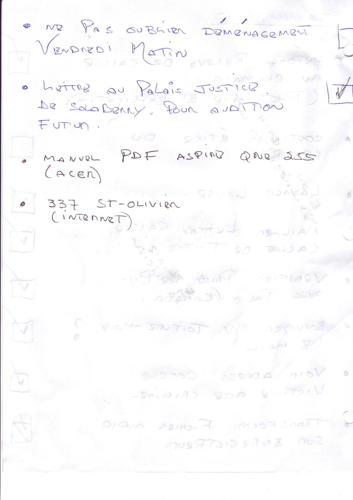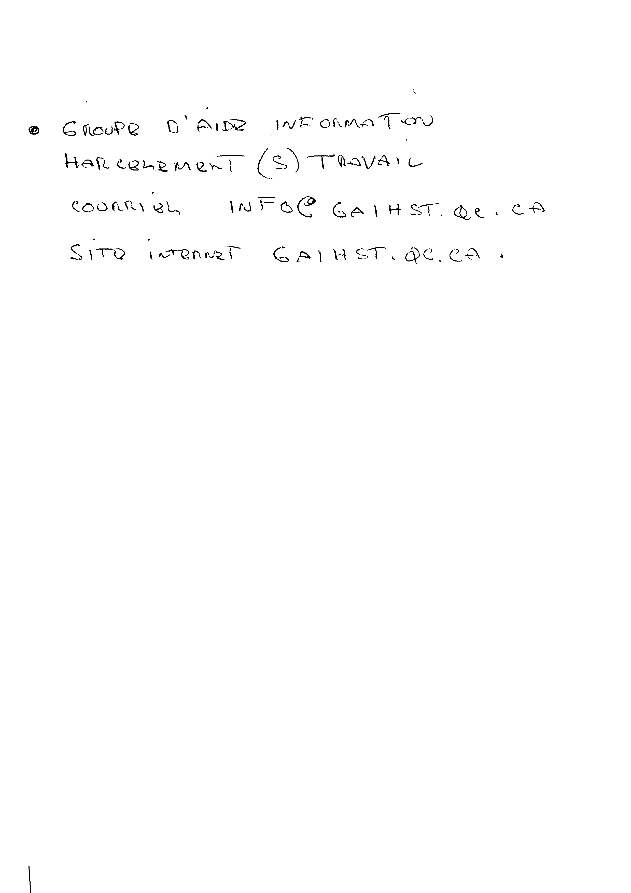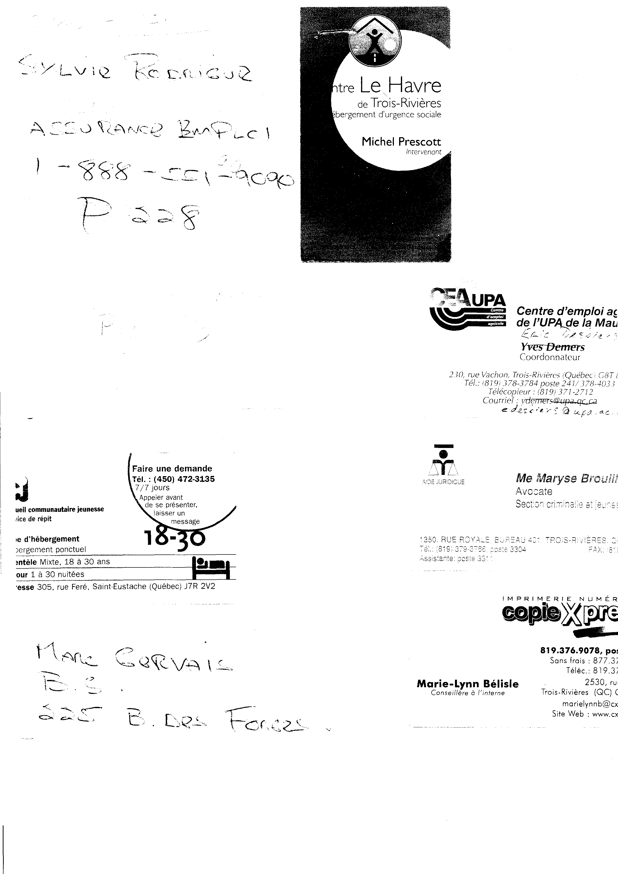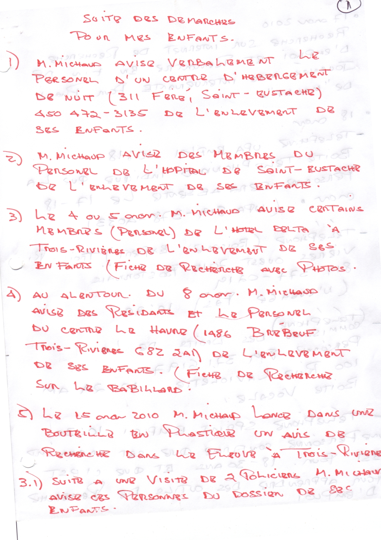 | 134 | Document avec des adresses fournies par le HAVRE de Trois-Rivières¸(1486 Brébeuf) ou j'ai été agressé physiquement (575 Laviolette Trois-Rivières) | TR133 |