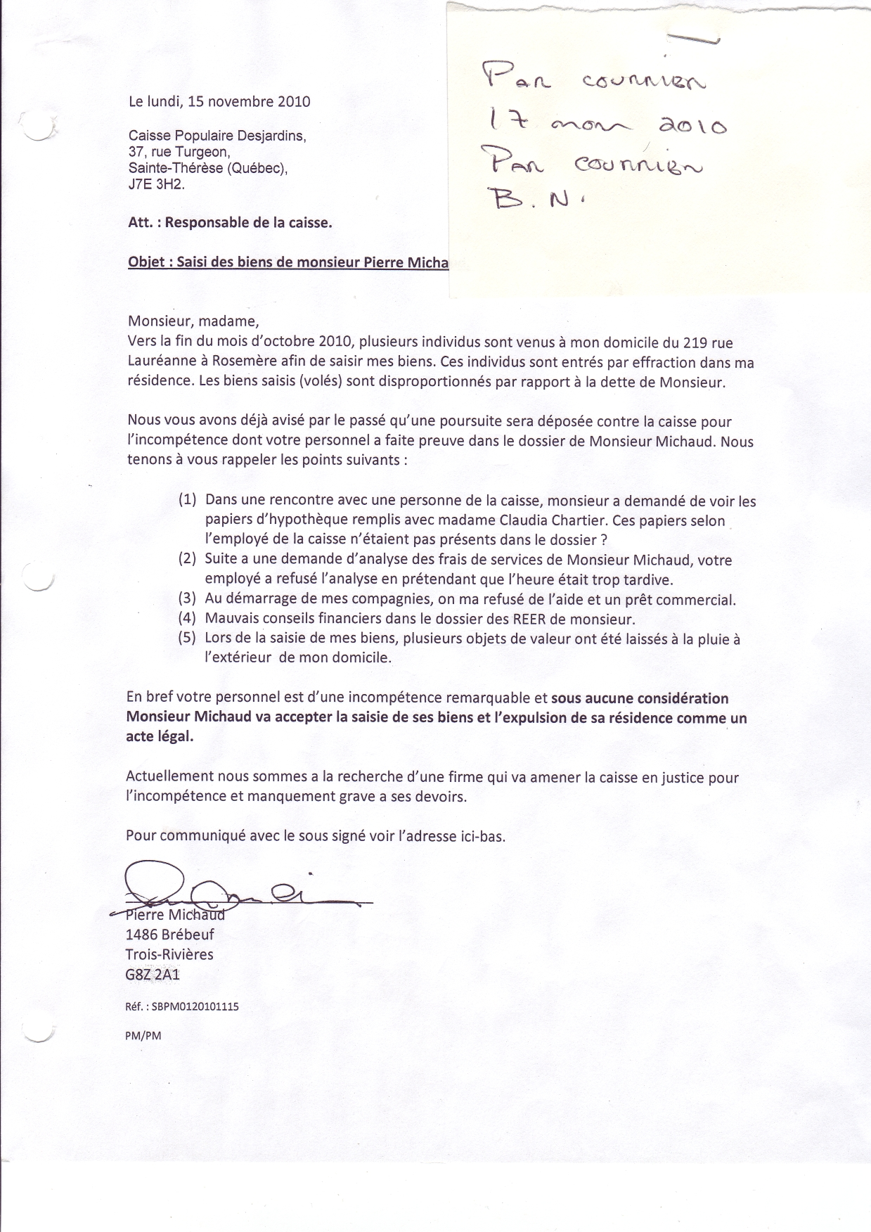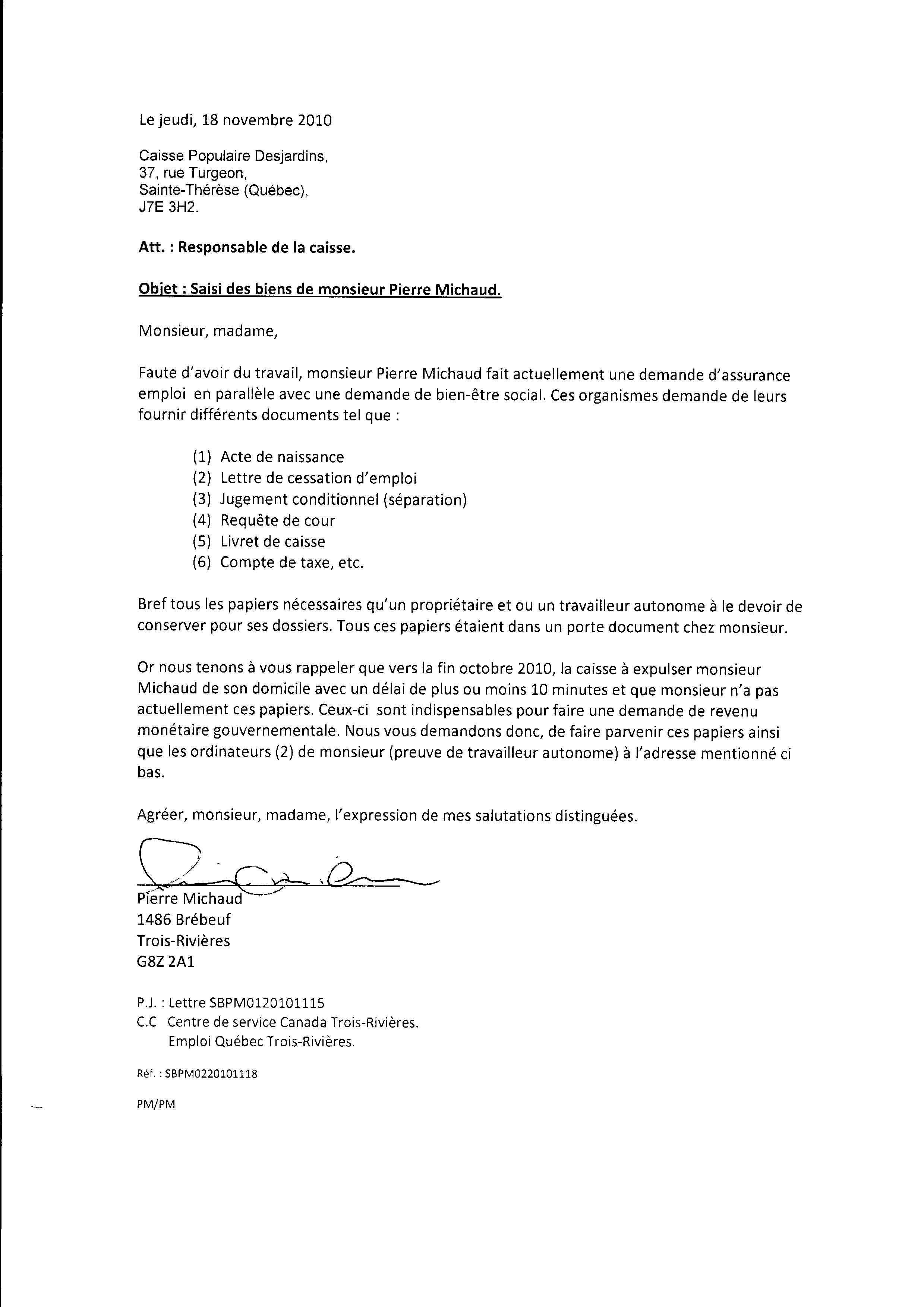 | 014 | Lettre du 18 novembre 2010 à la caisse populaire (saisi (vols) de biens de Pierre Michaud) | TR14 |