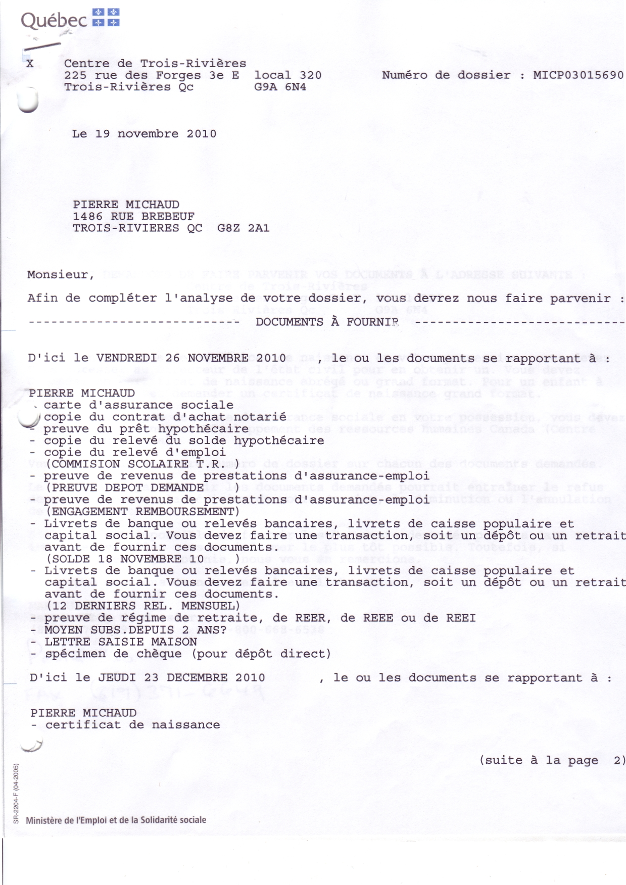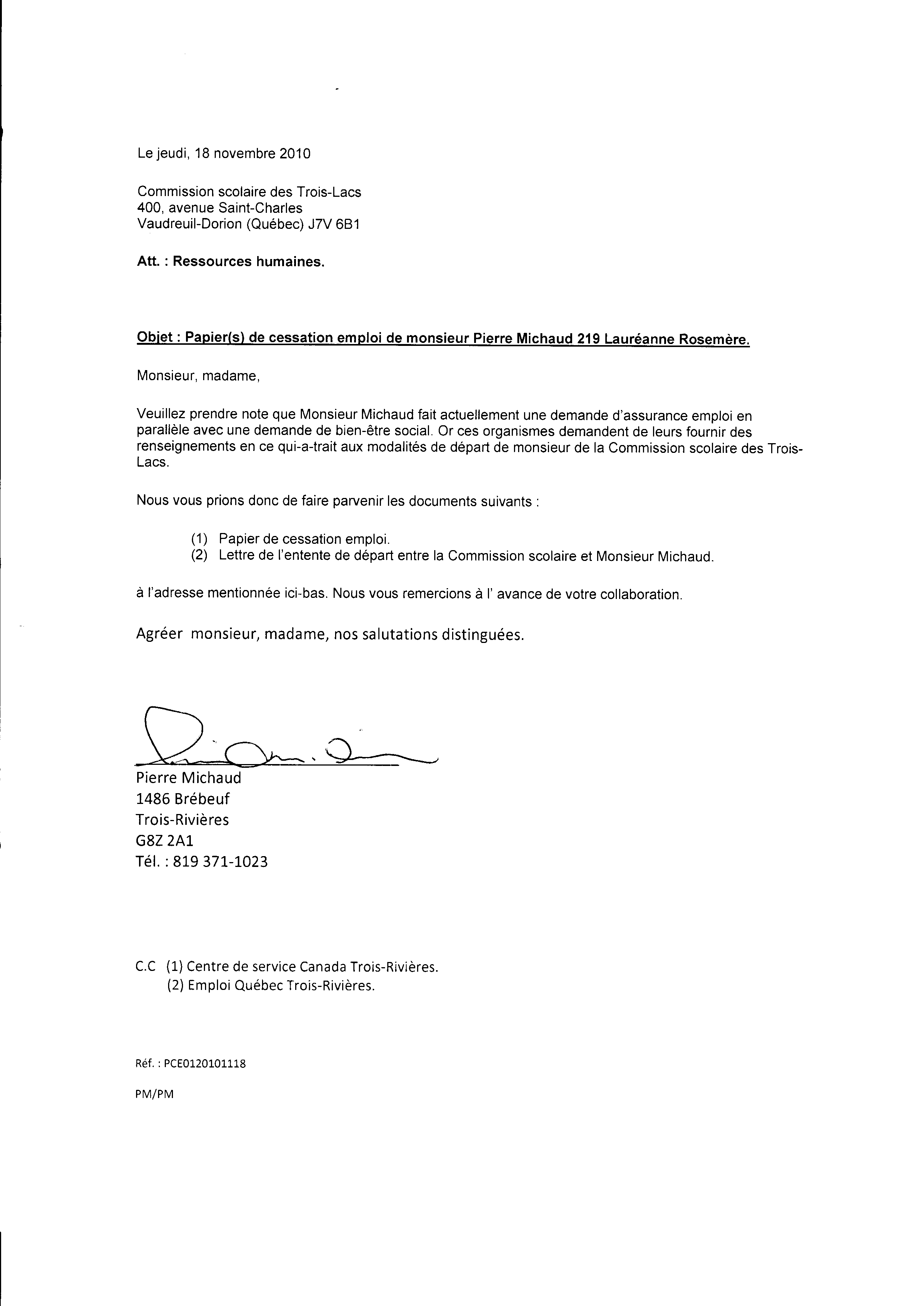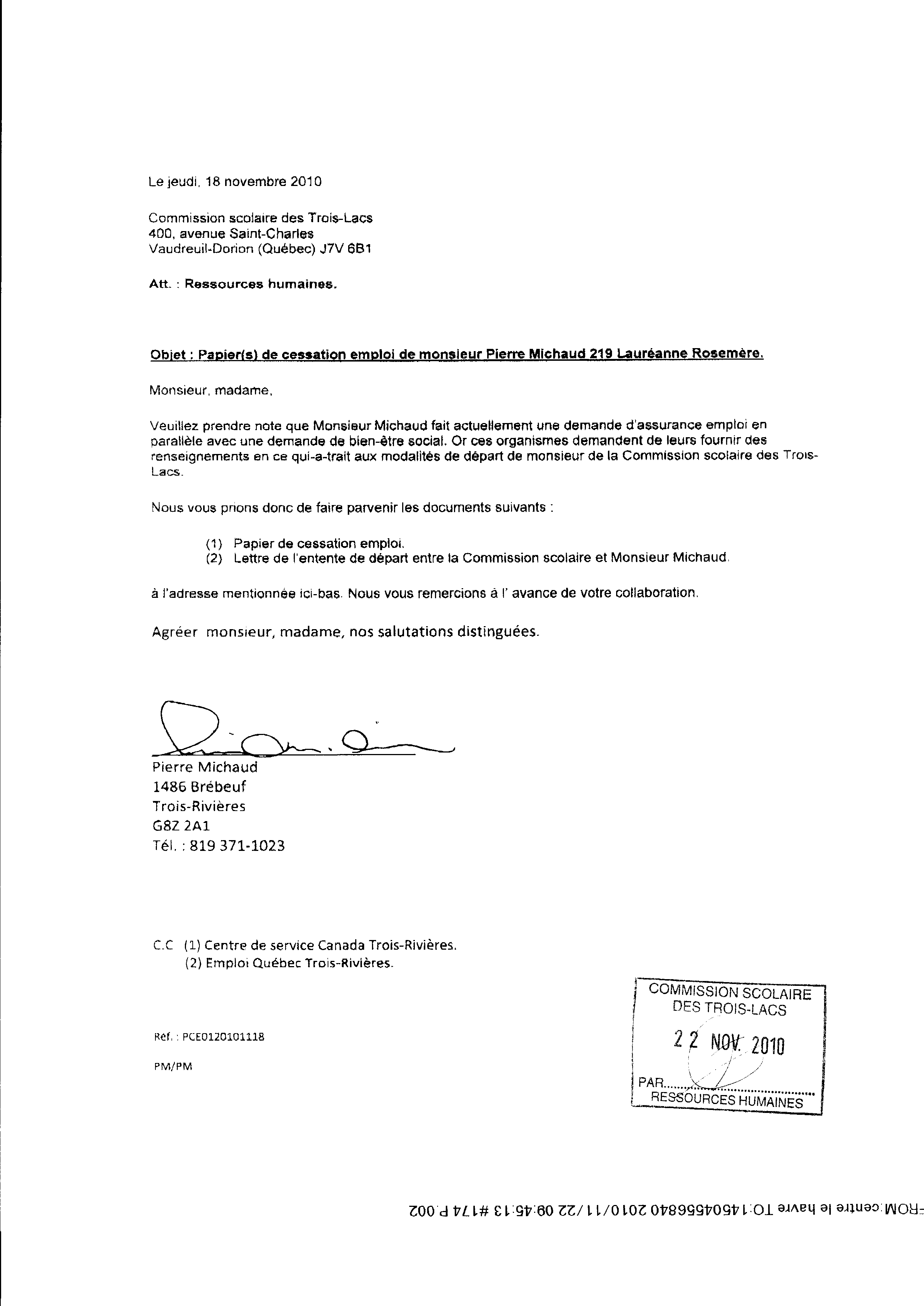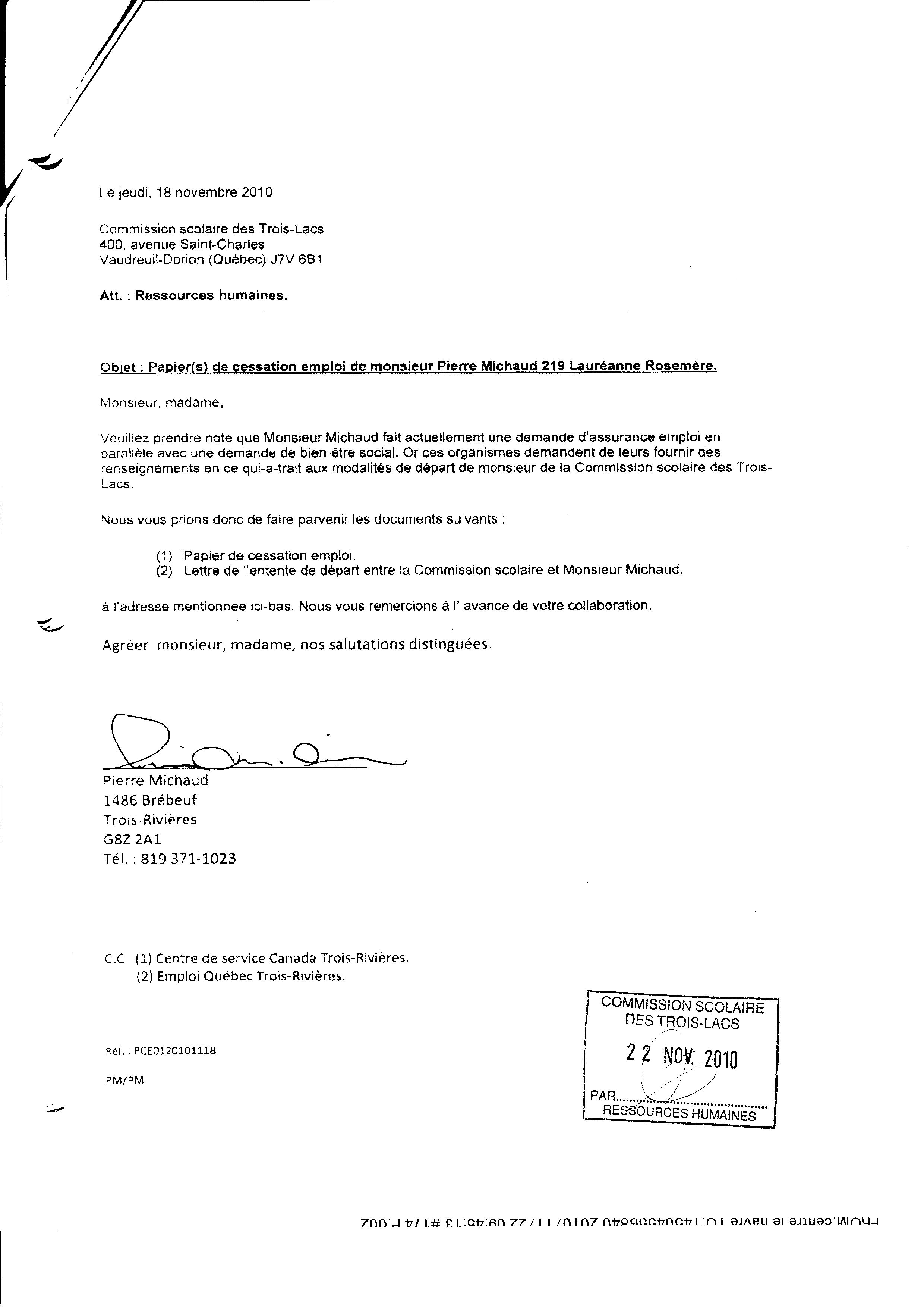 | 019 | Demande de documents du centre local d'emploi de Trois-Rivières daté du 19 novenbre 2010. Voir note de document de la référence 012 (page 2 de 2) | TR19 |