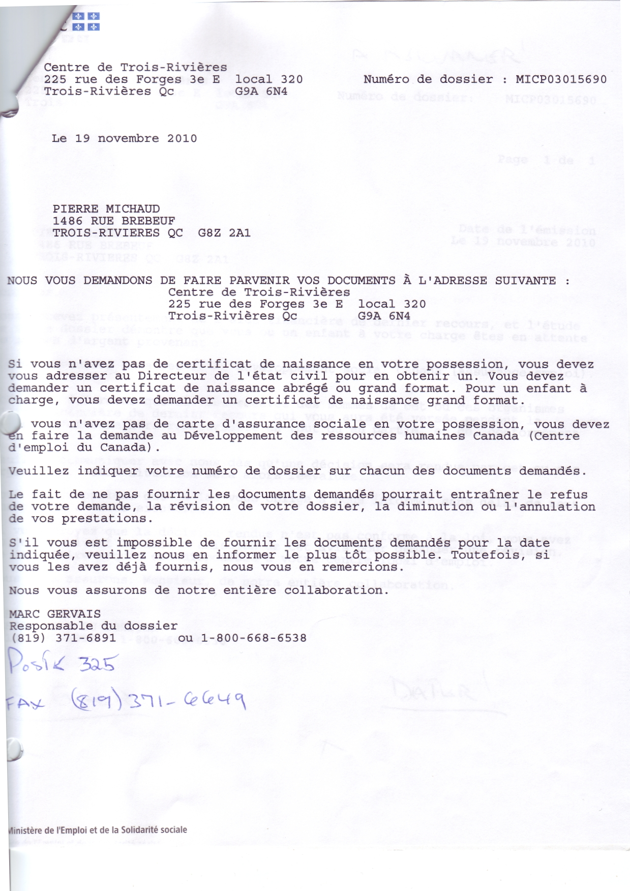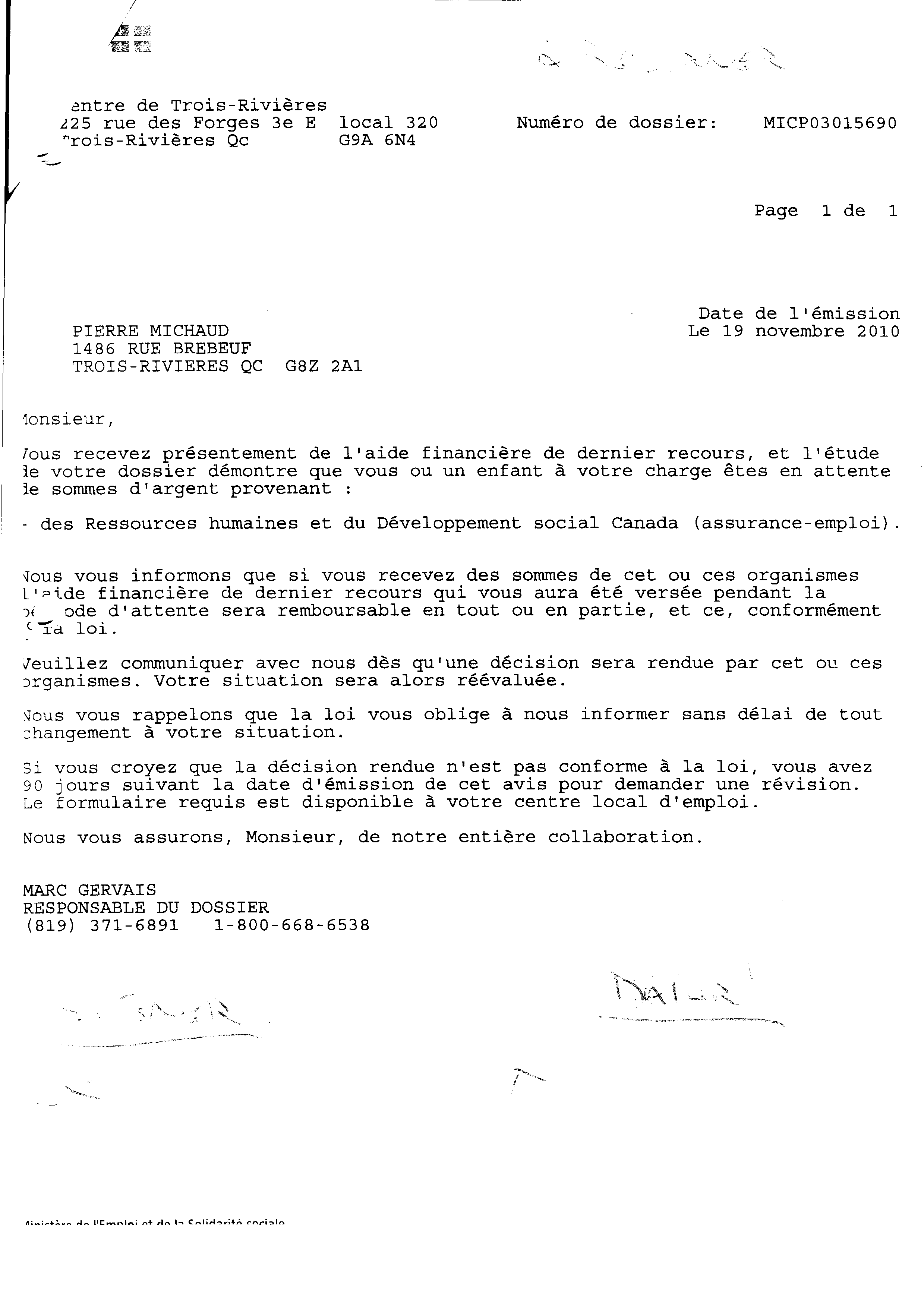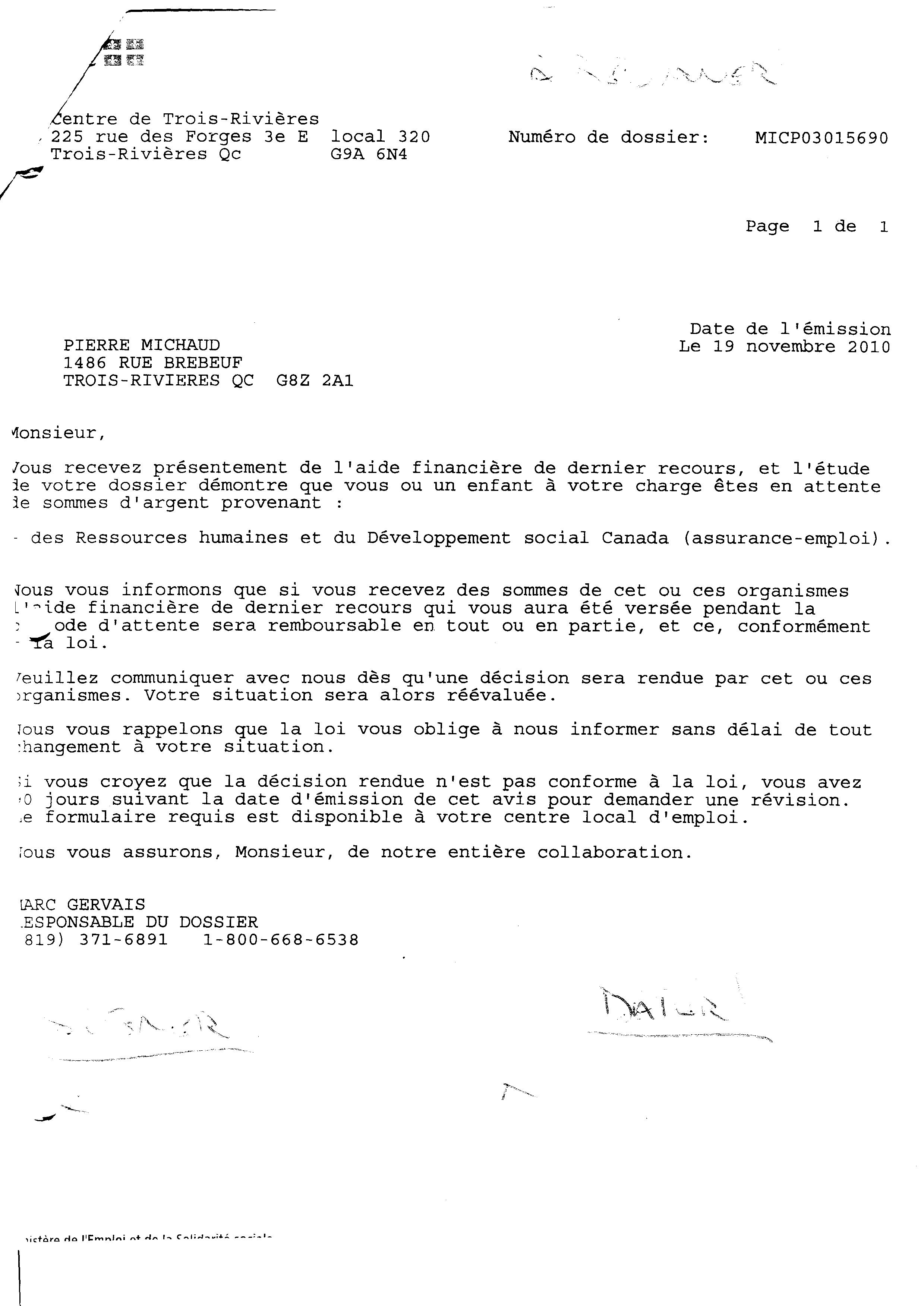 | 020 | Indormations au prestataire du centre local d'emploi de Trois-Rivières daté du 19 novenbre 2010. | TR20 |