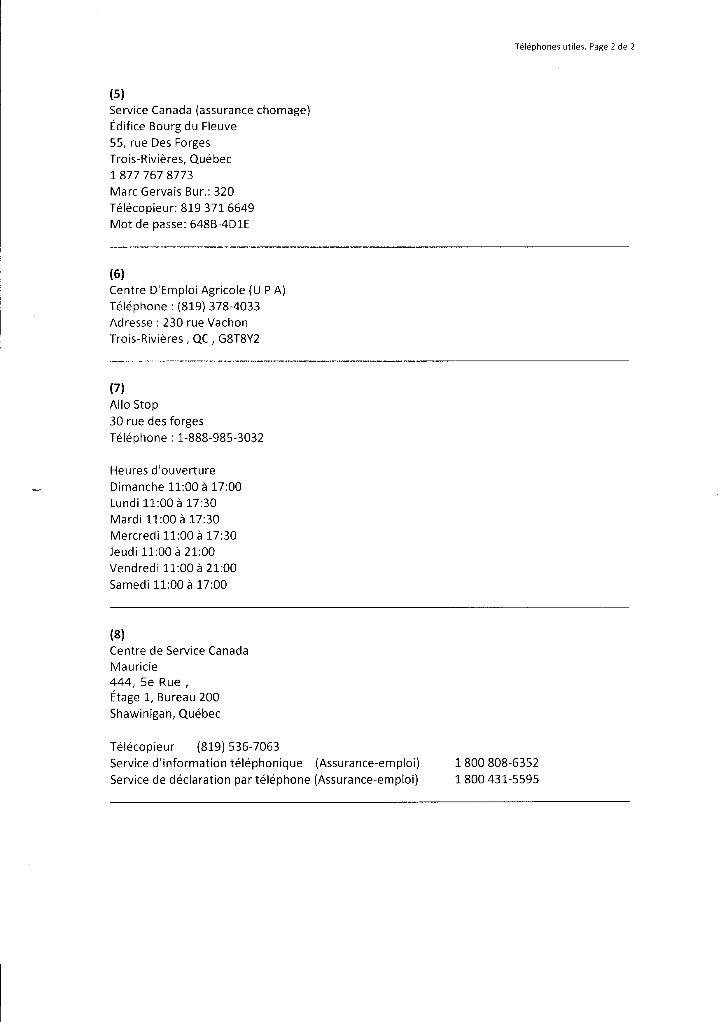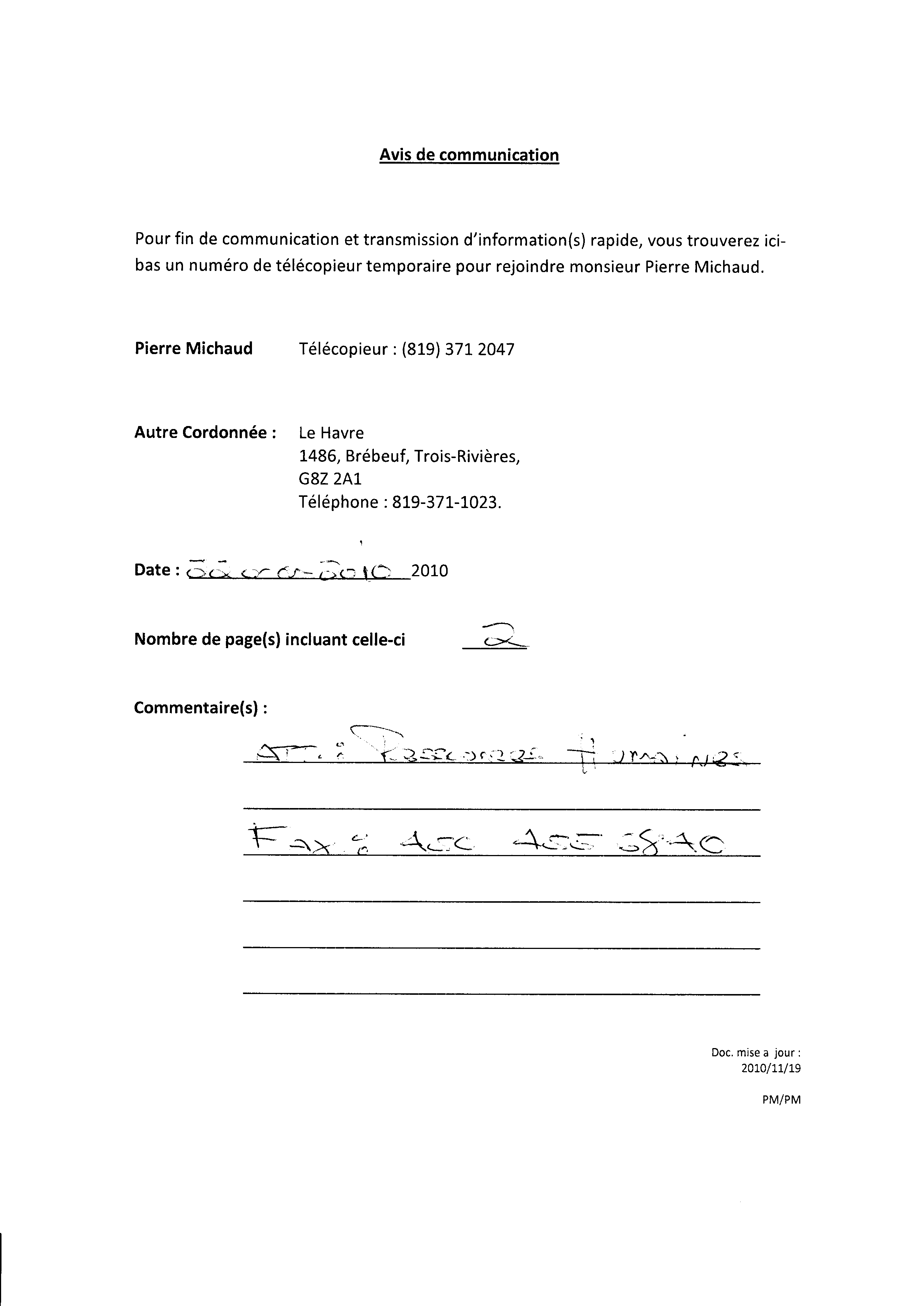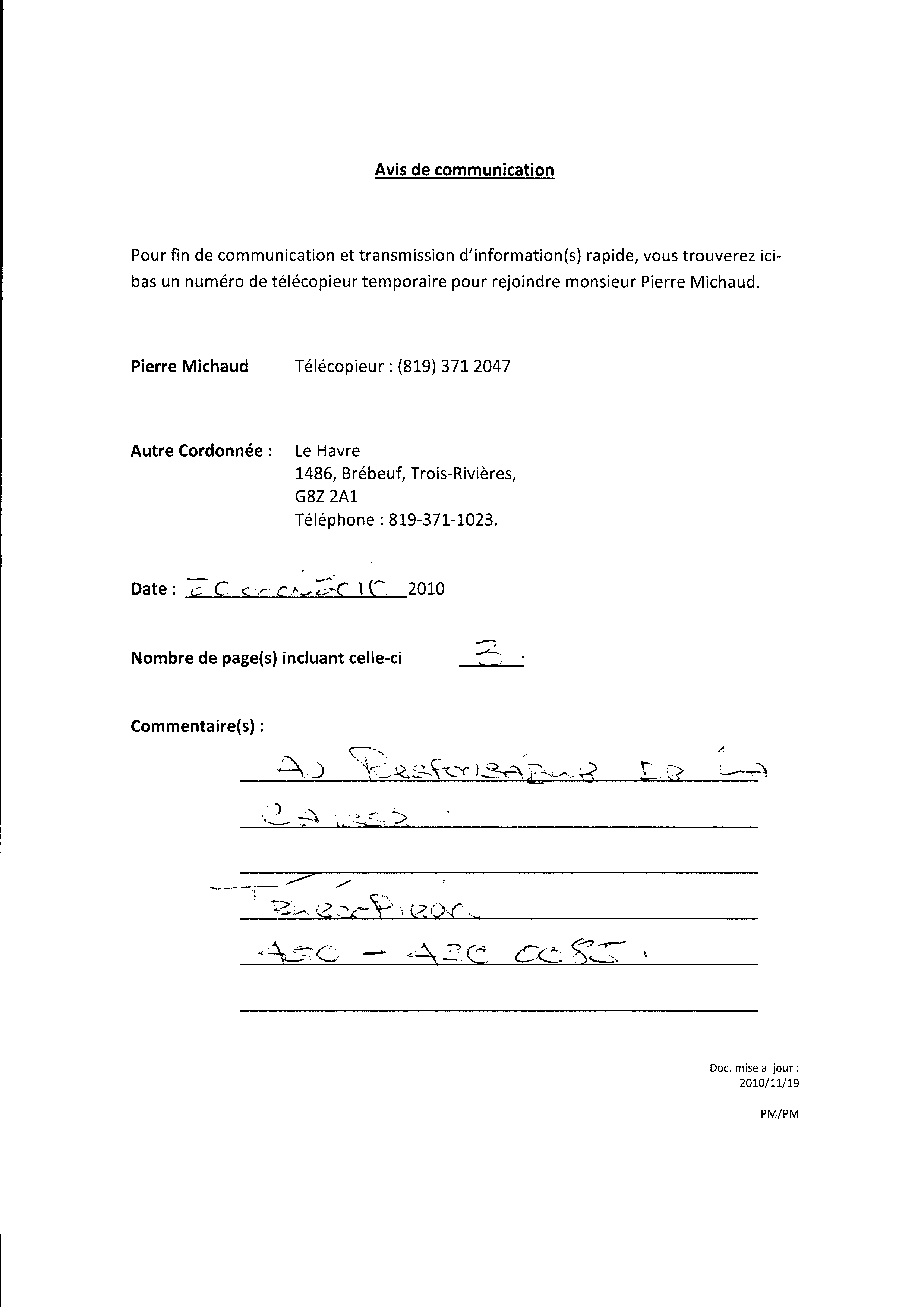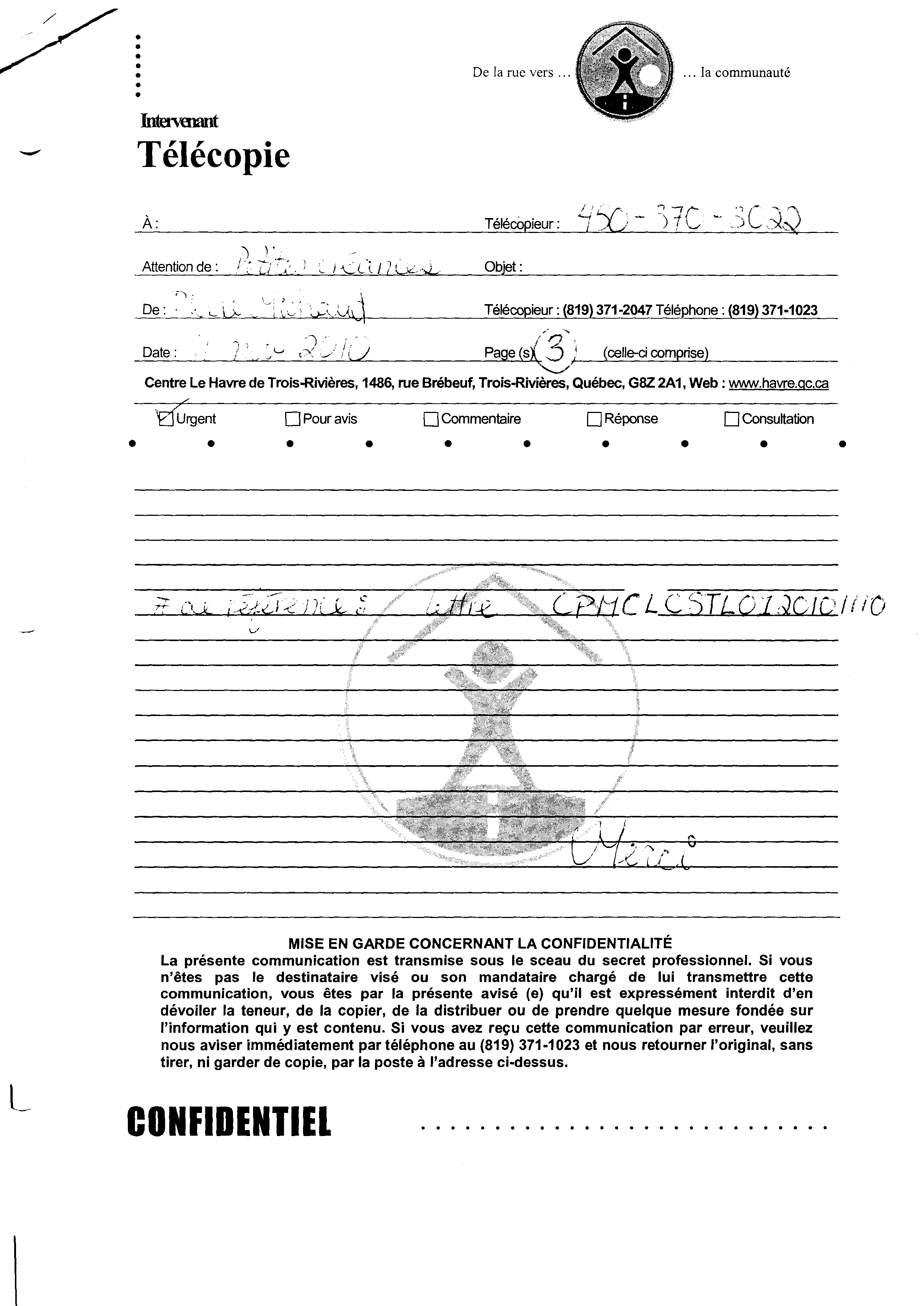 | 020 | Indormations au prestataire du centre local d'emploi de Trois-Rivières daté du 19 novenbre 2010. | TR20 |