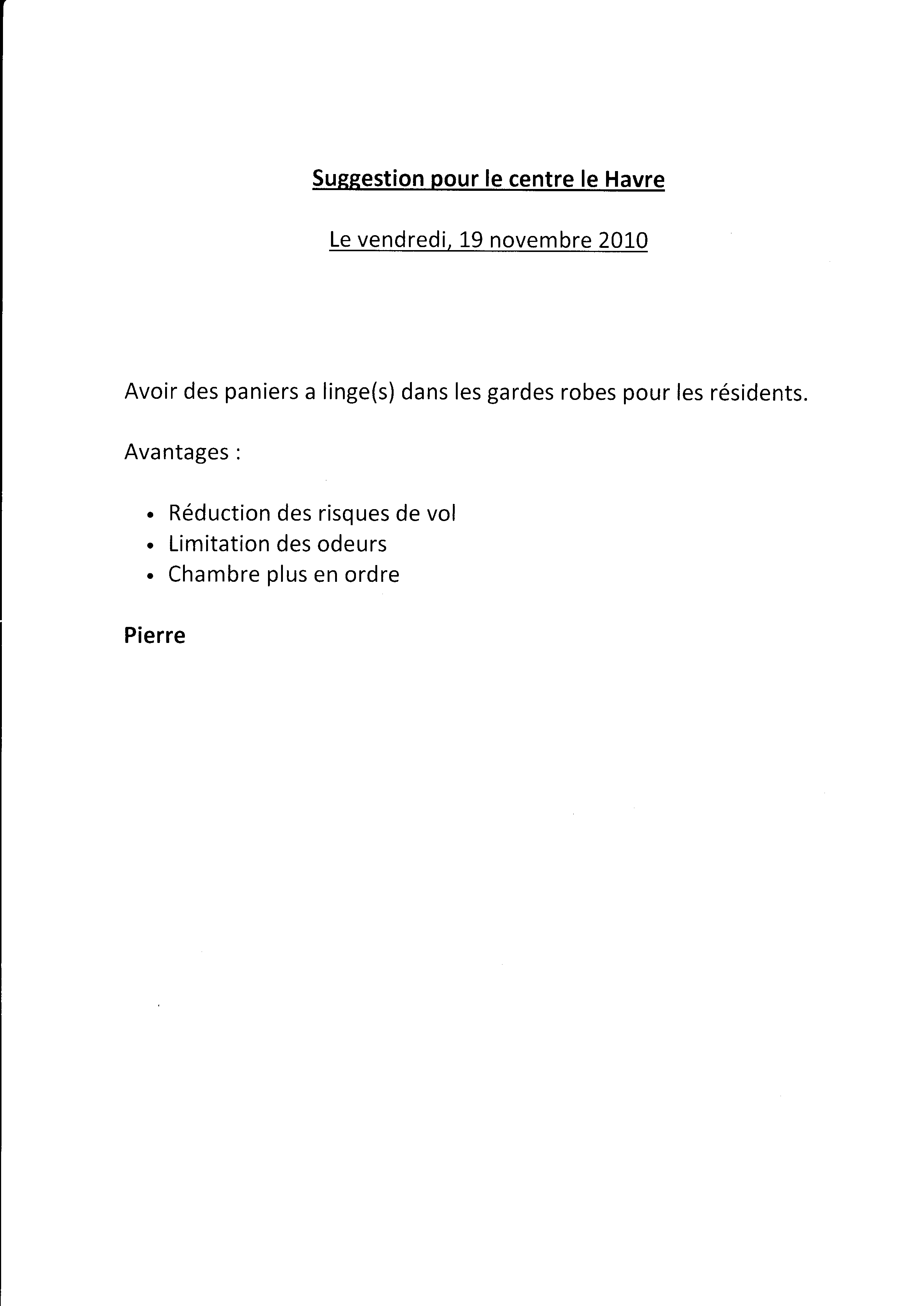 | 015 | Suggestion pour le centre d'hébergement le Havre de Trois-Rivières daté du 19 novembre 2010 | TR15 |