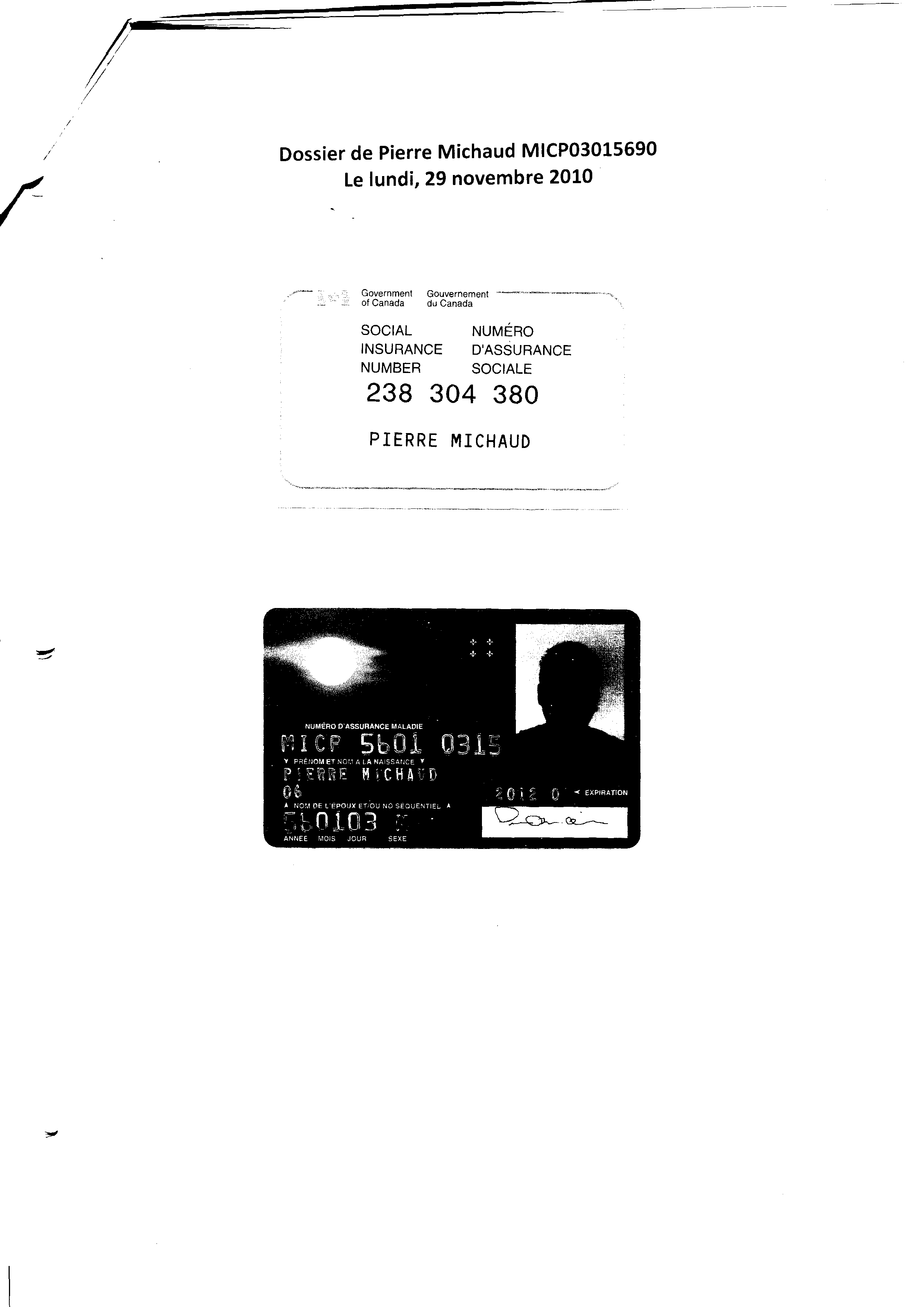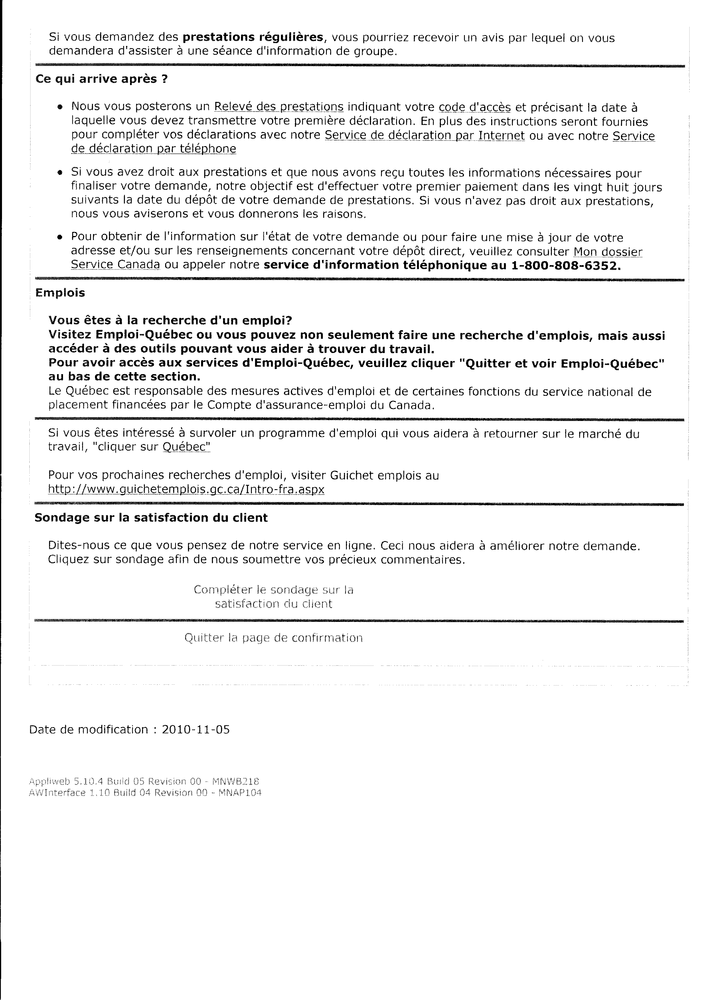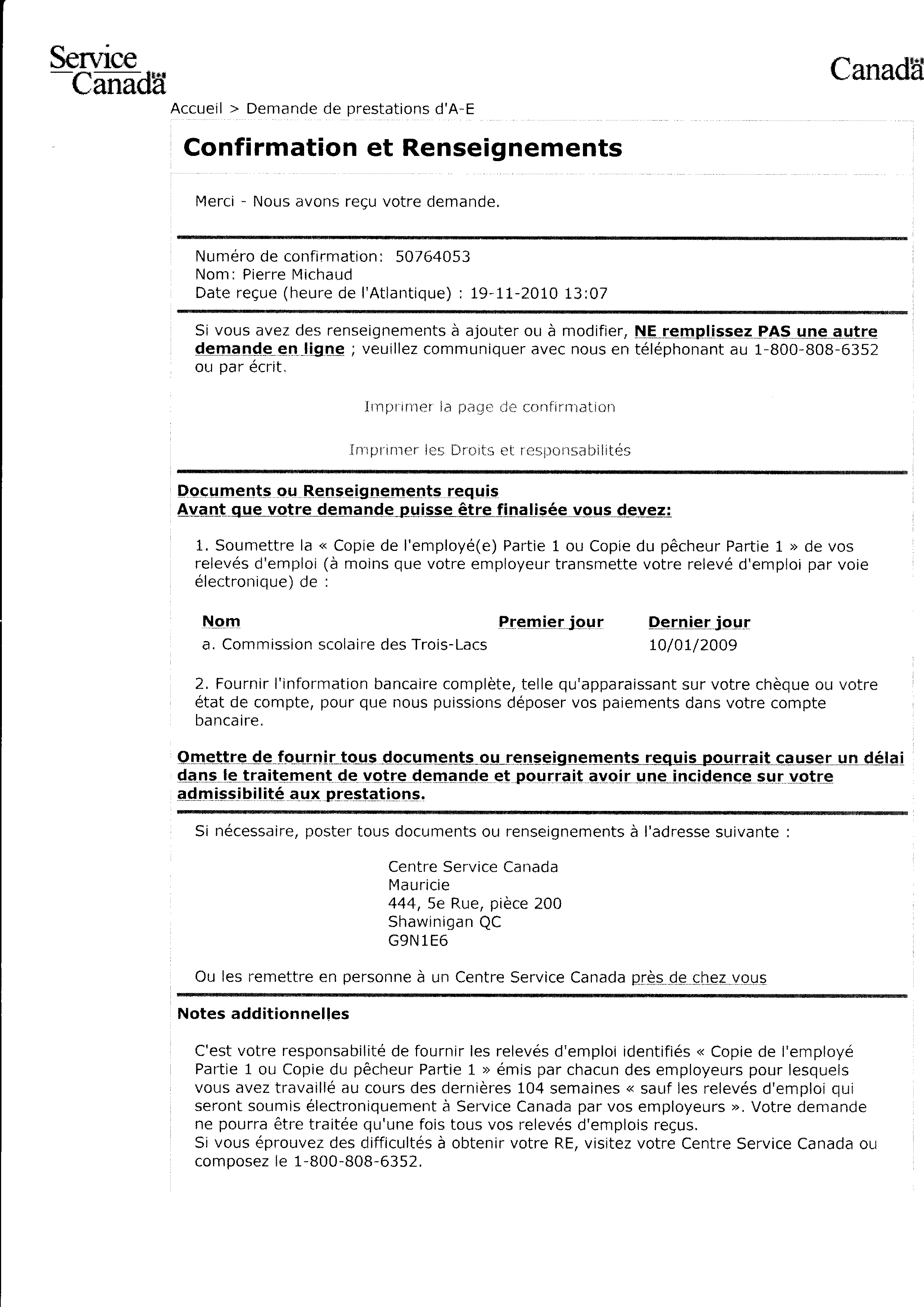 | 084 | Confirmation de la demande d'assurance chomage de Pierre Michaud auprès de Services Canada le 19 novembre 2010 | TR84 |