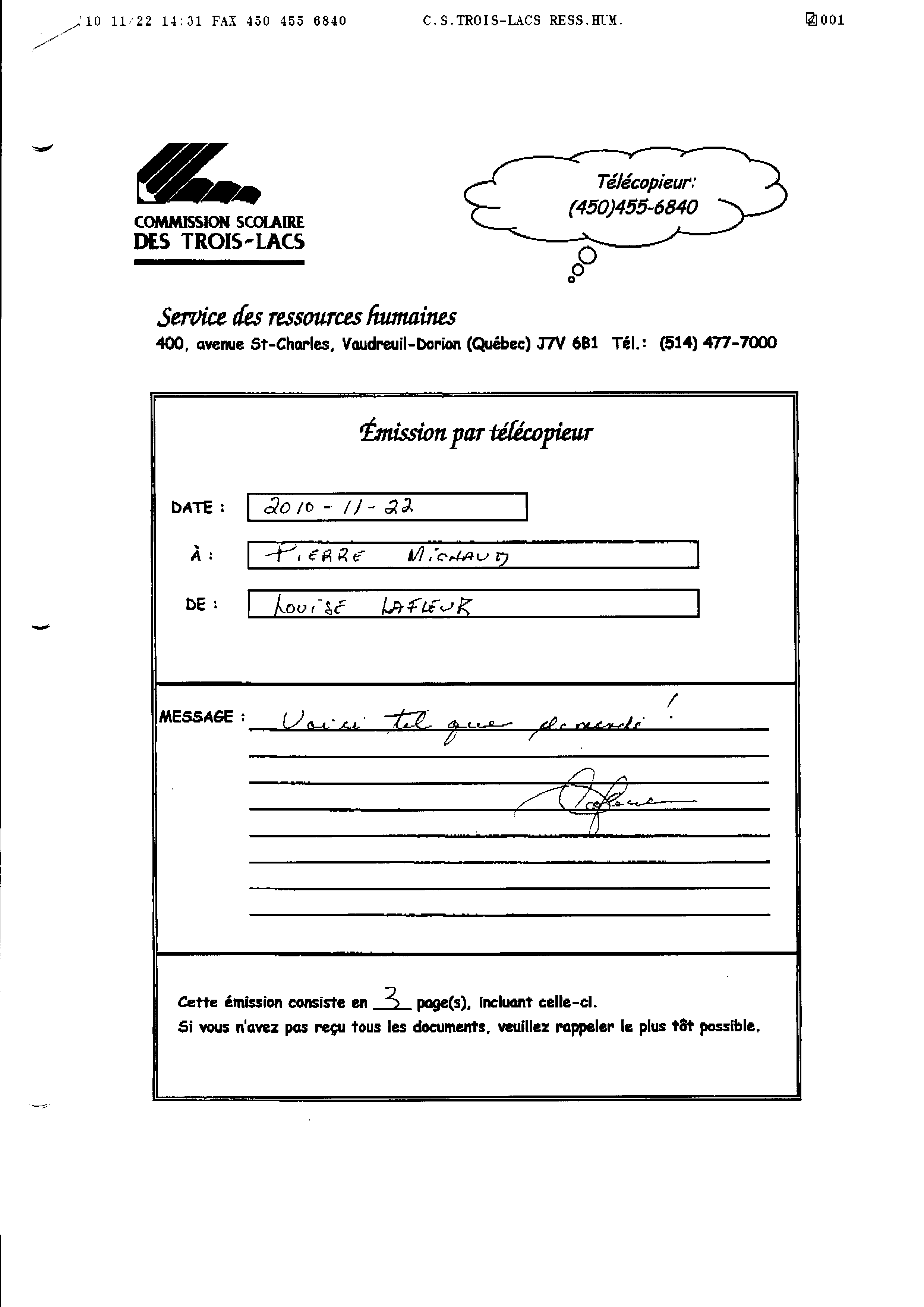 | 021 | Page de transmission de télécopie Commission Scolaire des Trois-Lacs 22 novembre 2010 | TR21 |