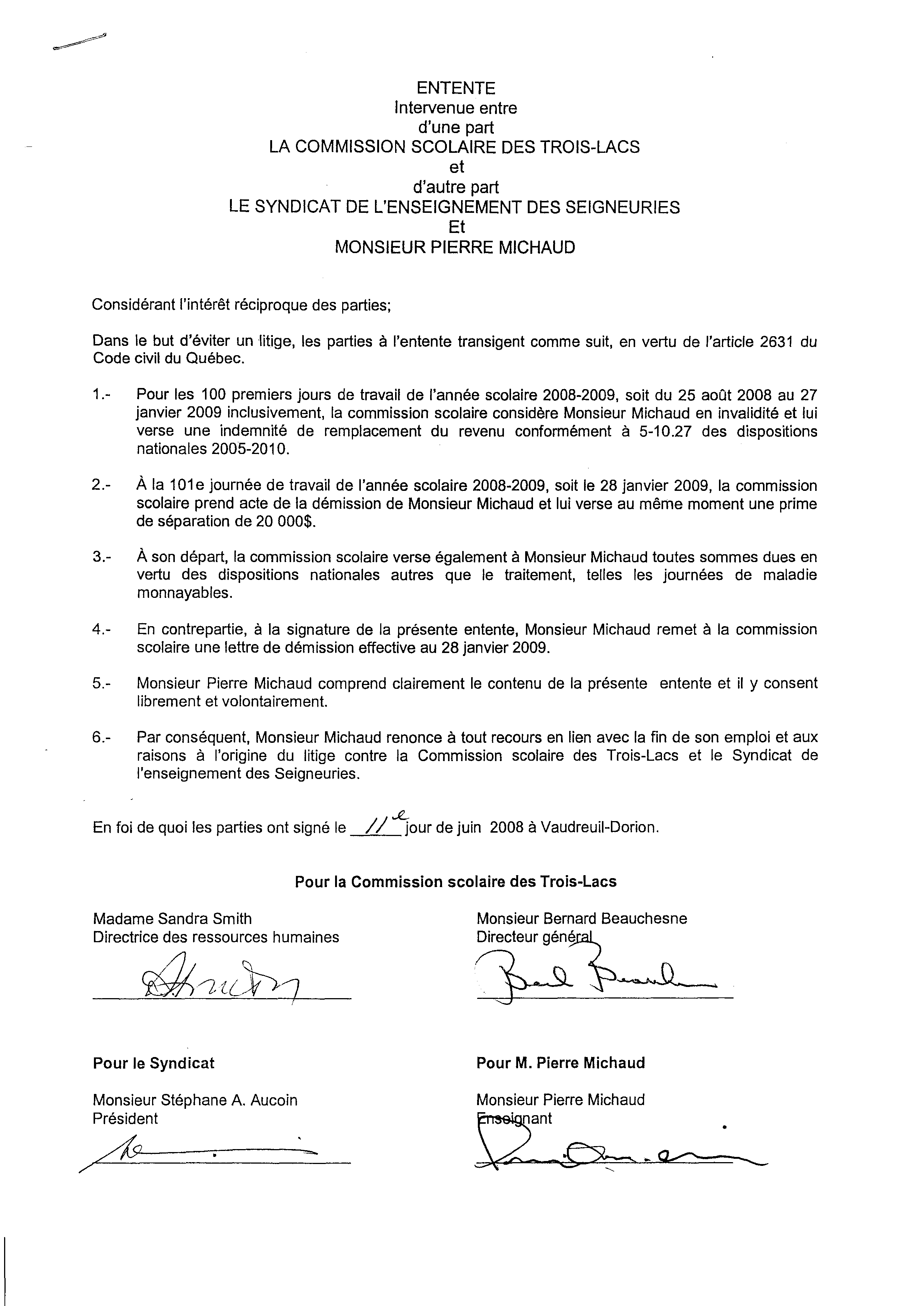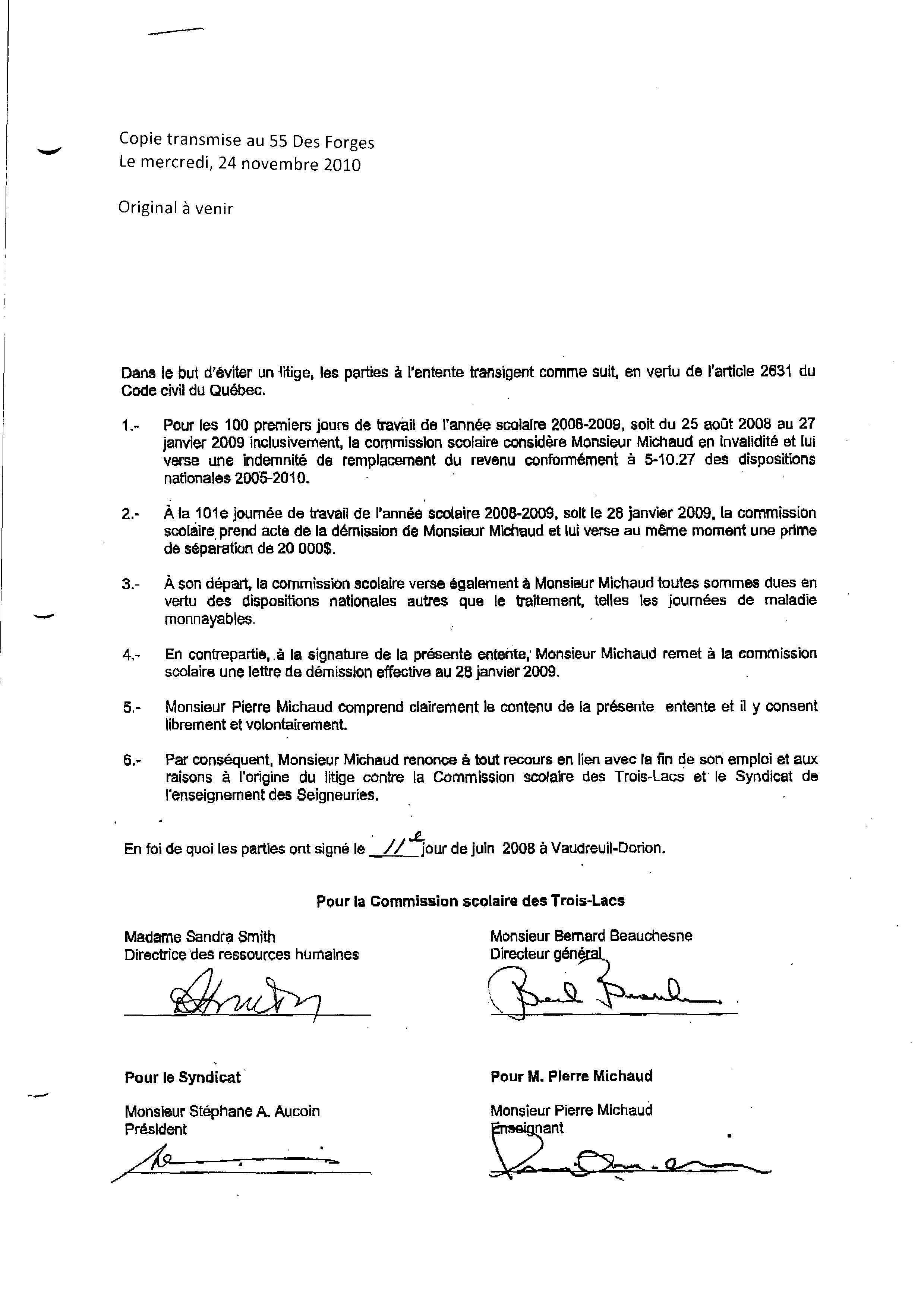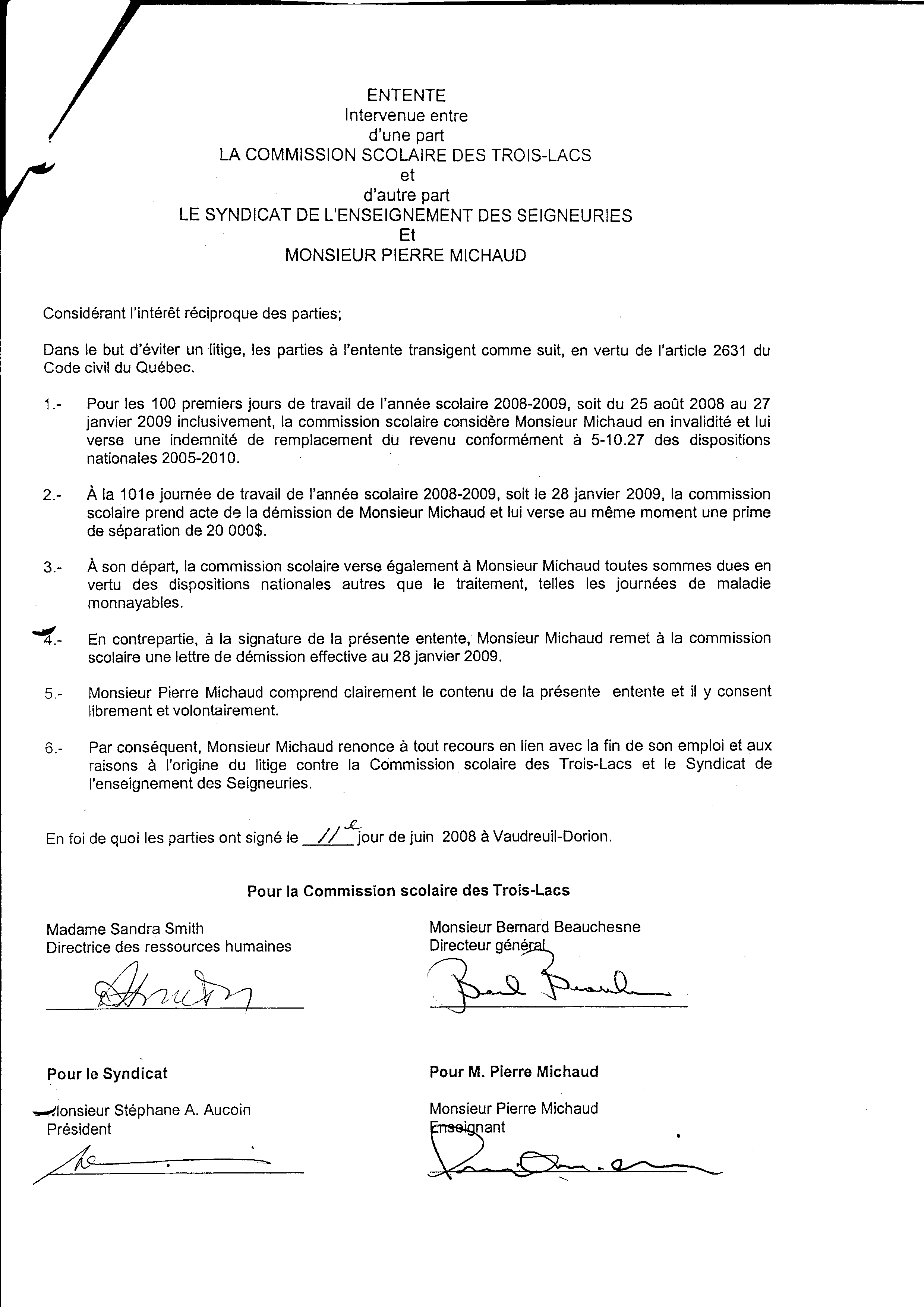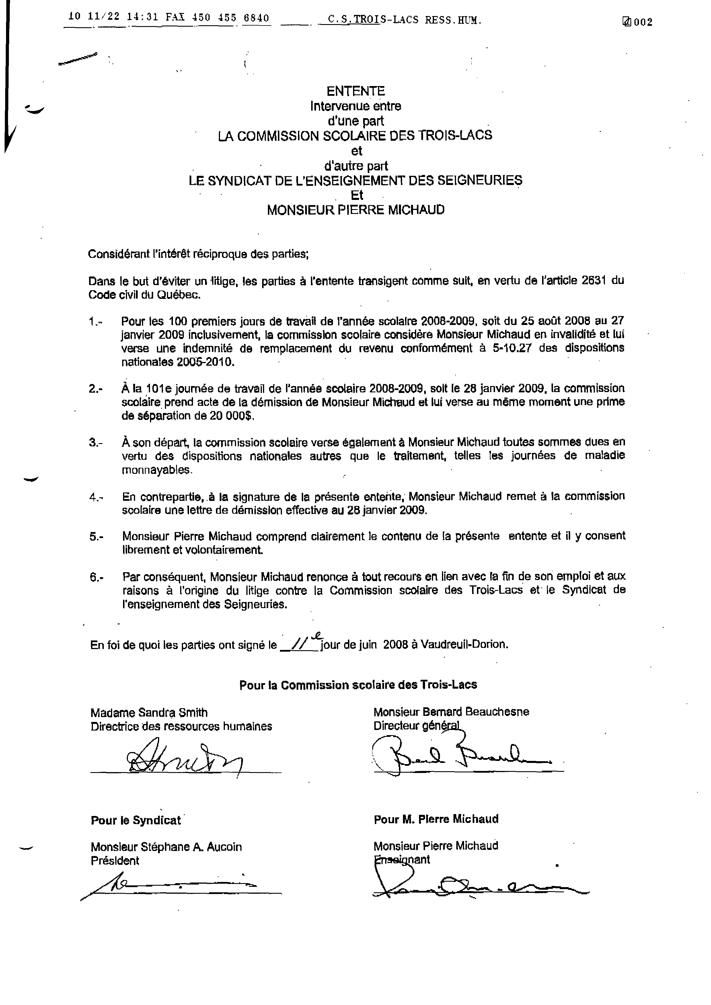 | 022 | Entente non respecté de la commission scolaire daté du 11 juin 2008 | TR22 |
