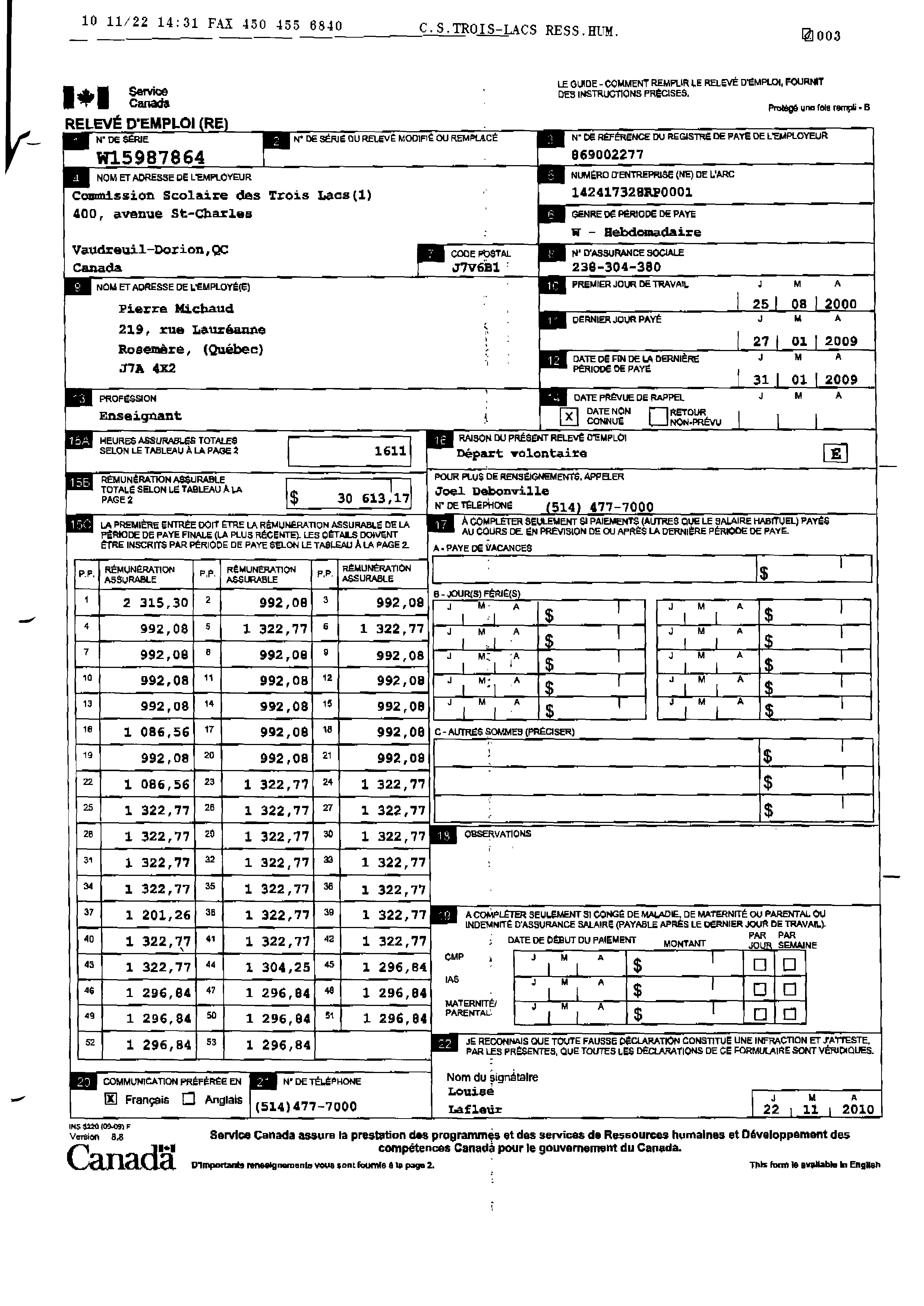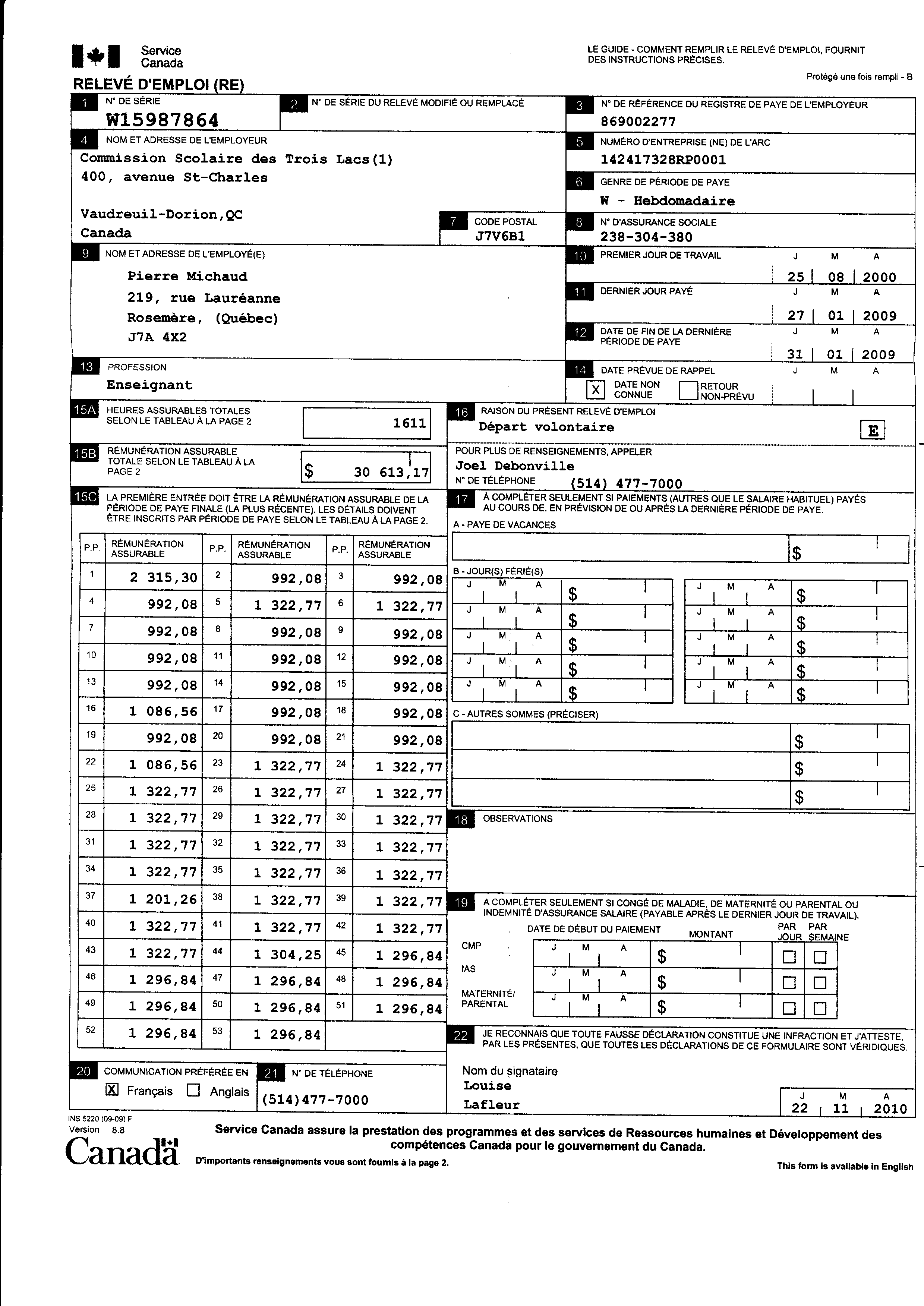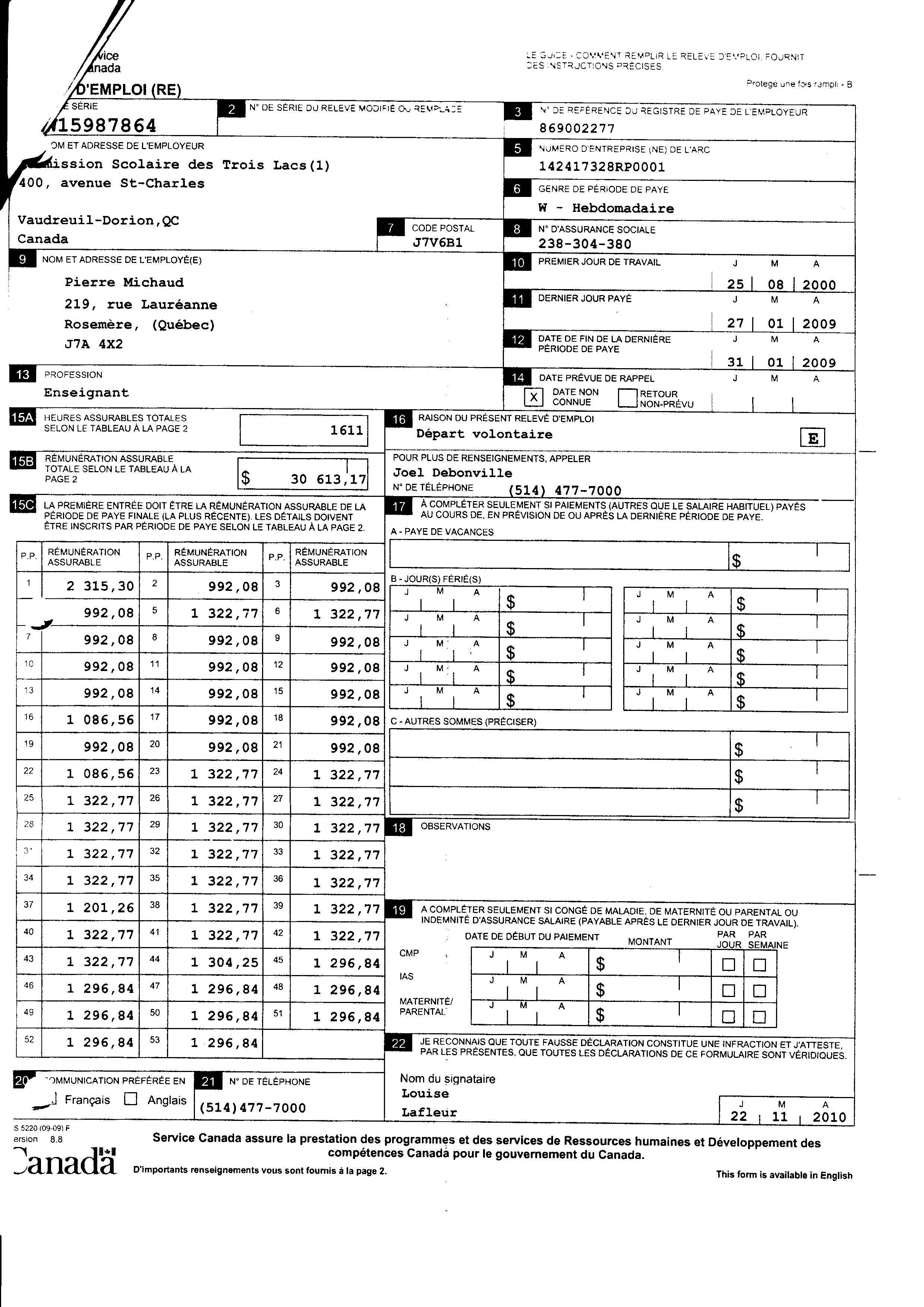 | 023 | Relevé d'emploi de Pierre Michaud Commision Scolaire des Trois-Lacs | TR23 |