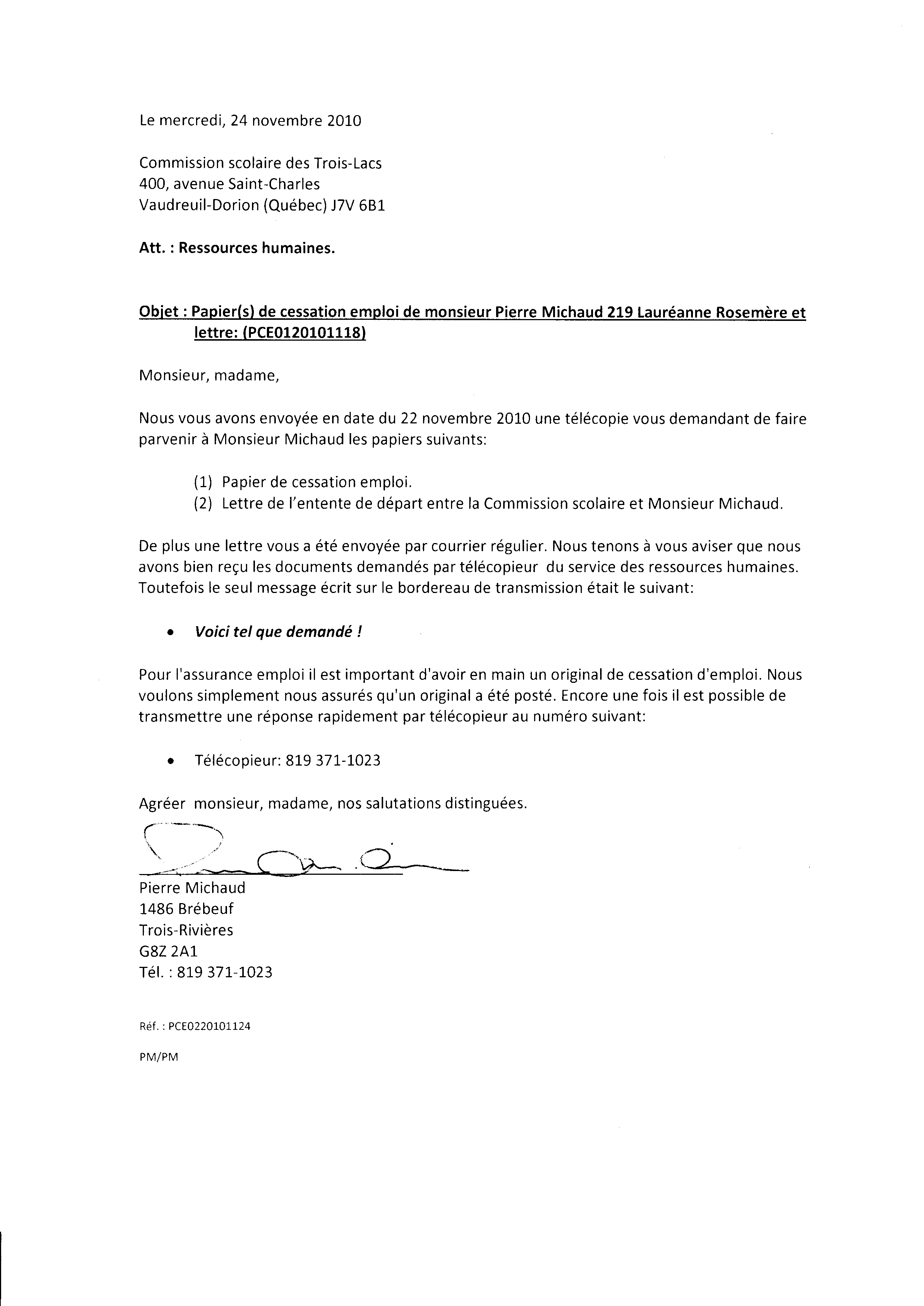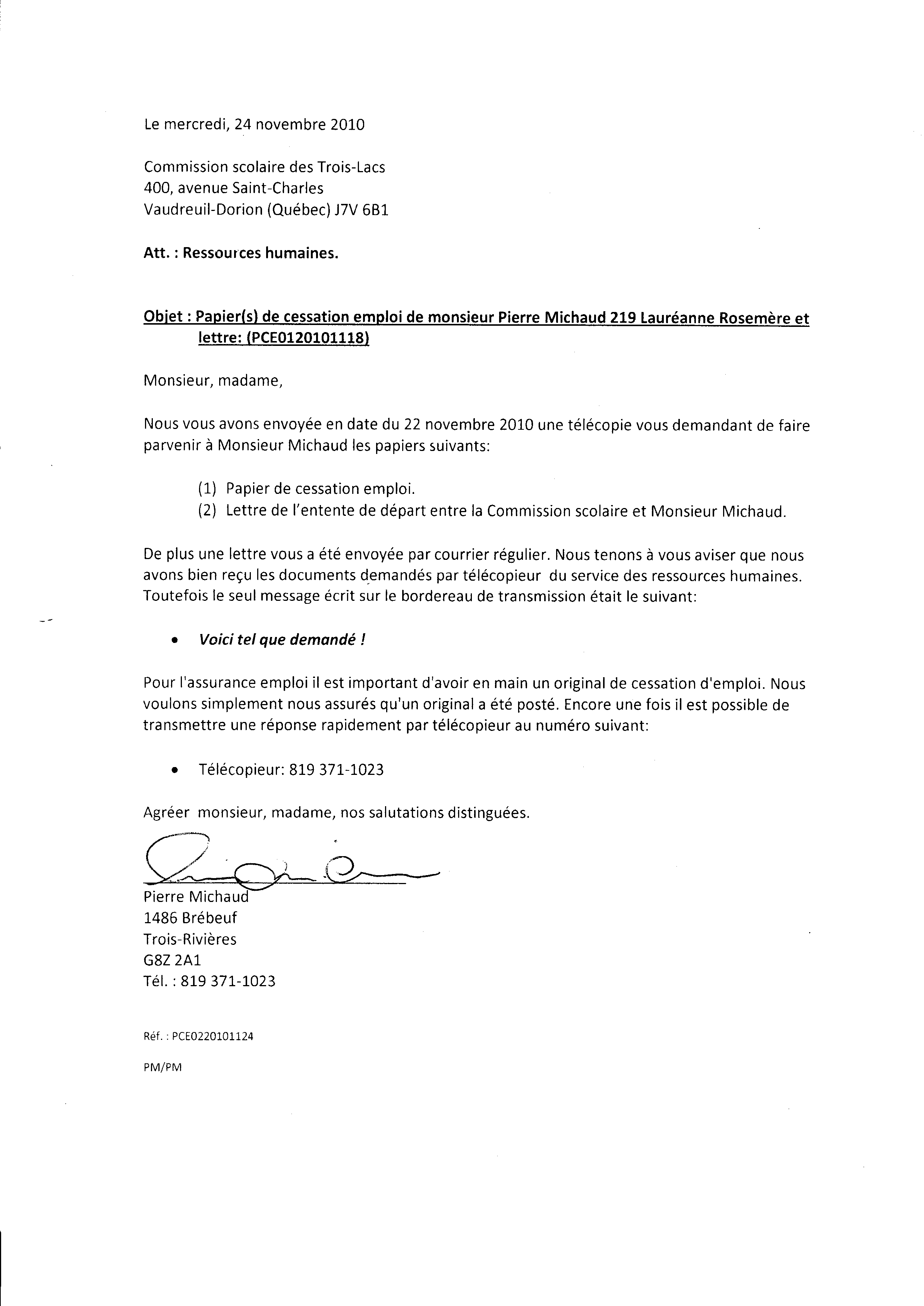 | 011 | Demande d'envoi de remplacement des documents volés suite à l'expulsion de Monsieur Michaud adressé à la Comission Scolaire des Trois-Lacs. | TR11 |