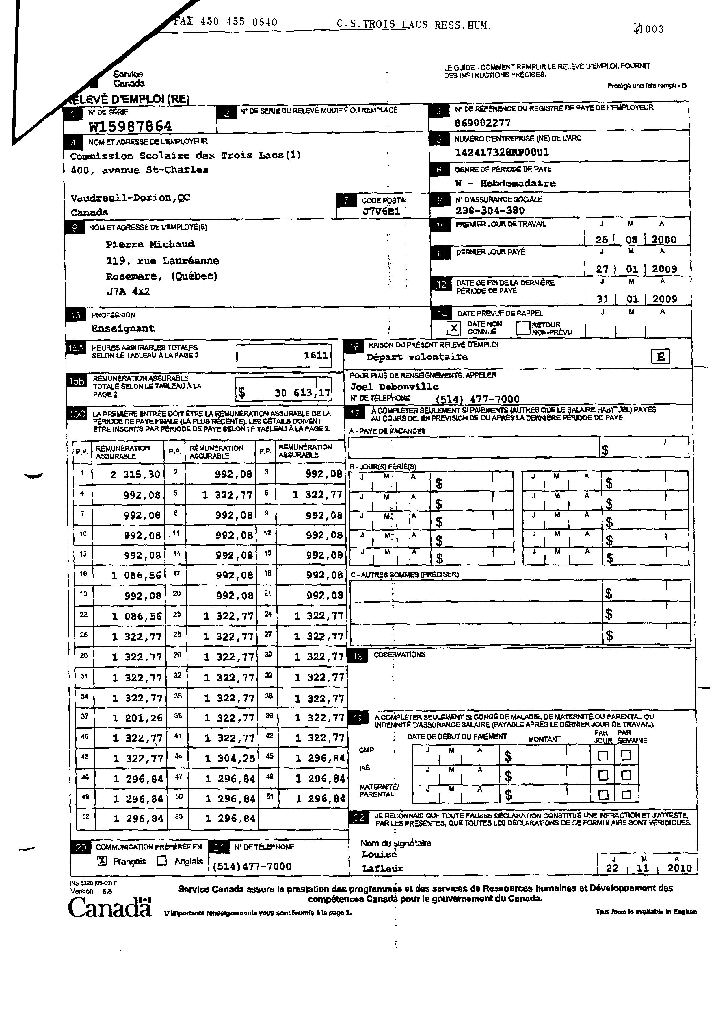 | 038 | Duplicata Relevé d'emploi de Pierre Michaud Commision Scolaire des Trois-Lacs | TR38 |