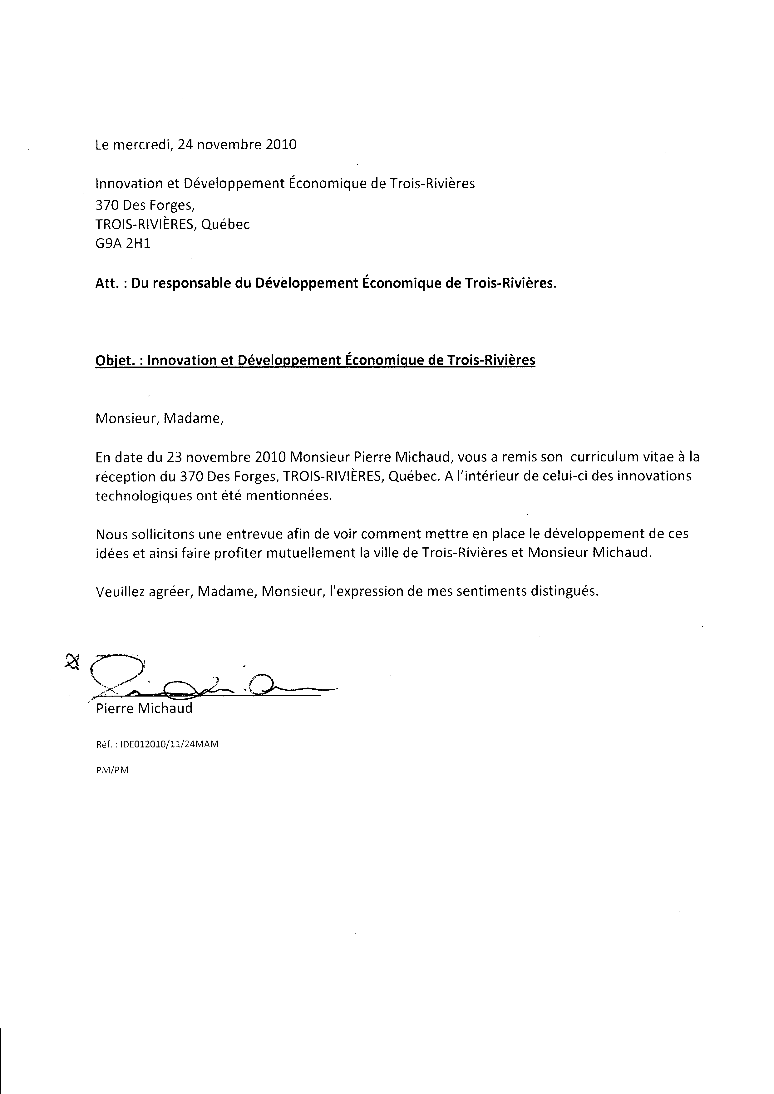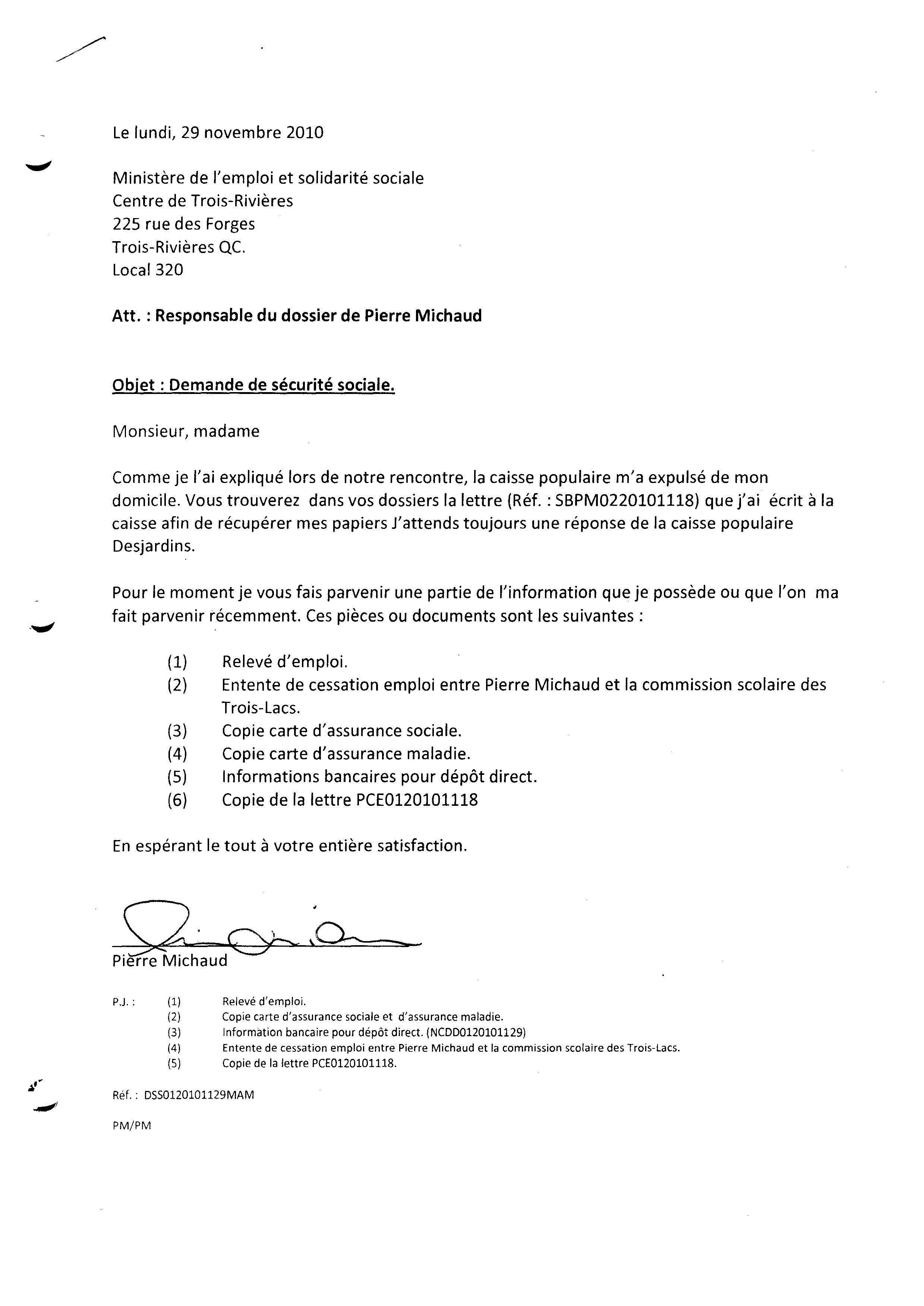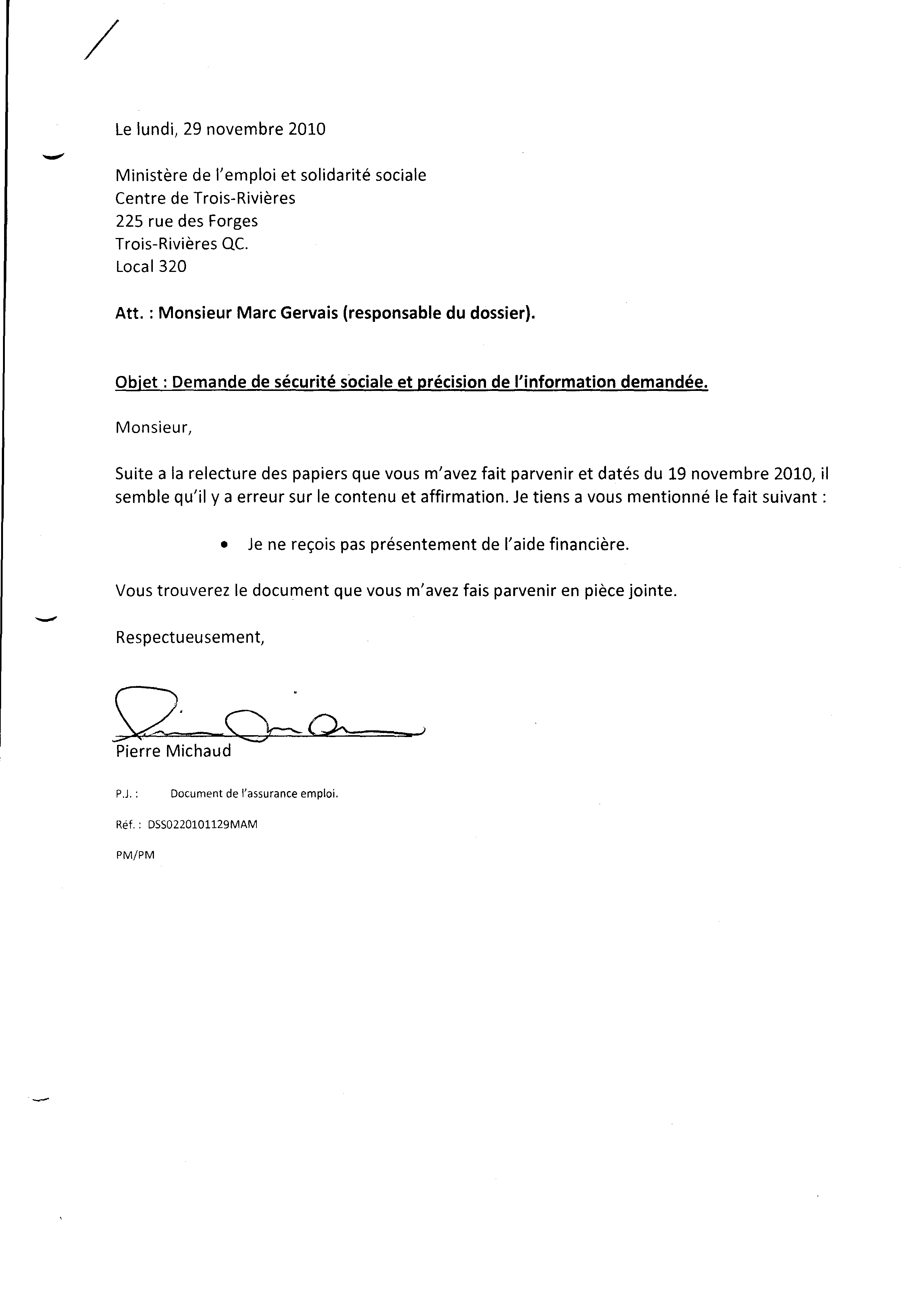 | 048 | Lettre de correction d'informations de l'aide social de Trois-Rivières émis par Pierre Michaud le 29 novembre 2010. | TR48 |