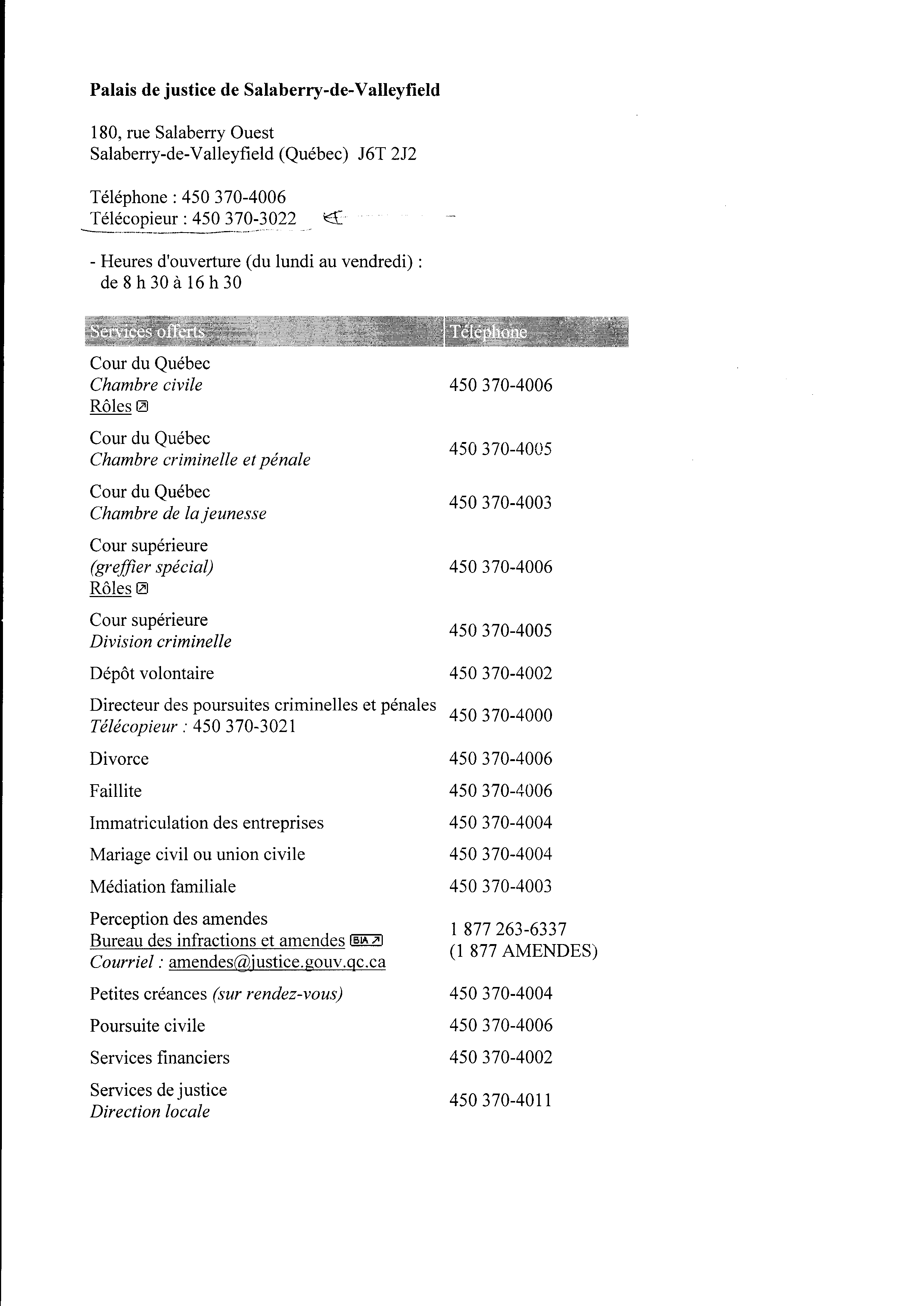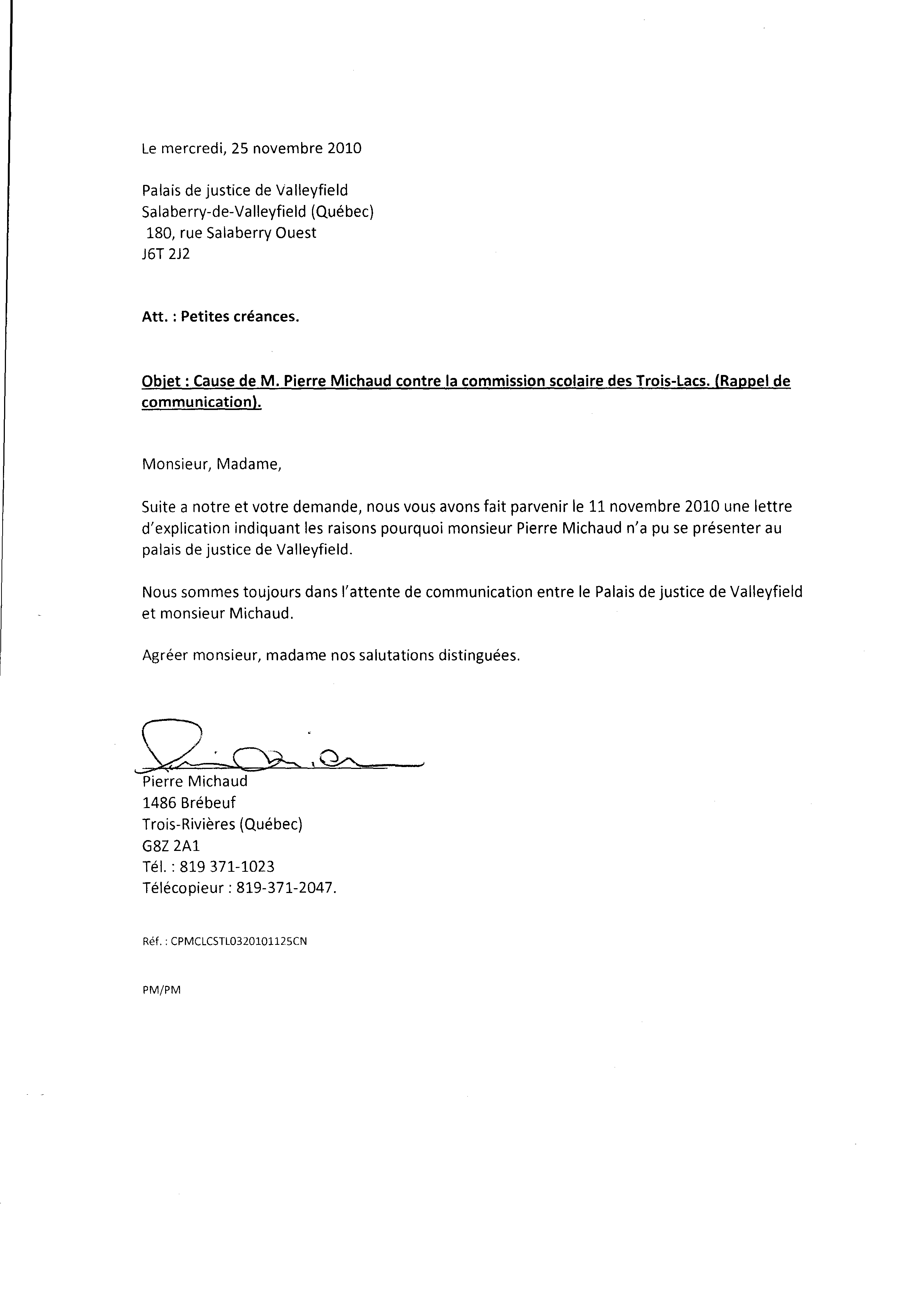 | 080 | Lettre au Palais de justice de Valleyfield pour fraude de la Commission Scolaire des Trois-Lacs le 03 décembre 2010 | TR80 |
