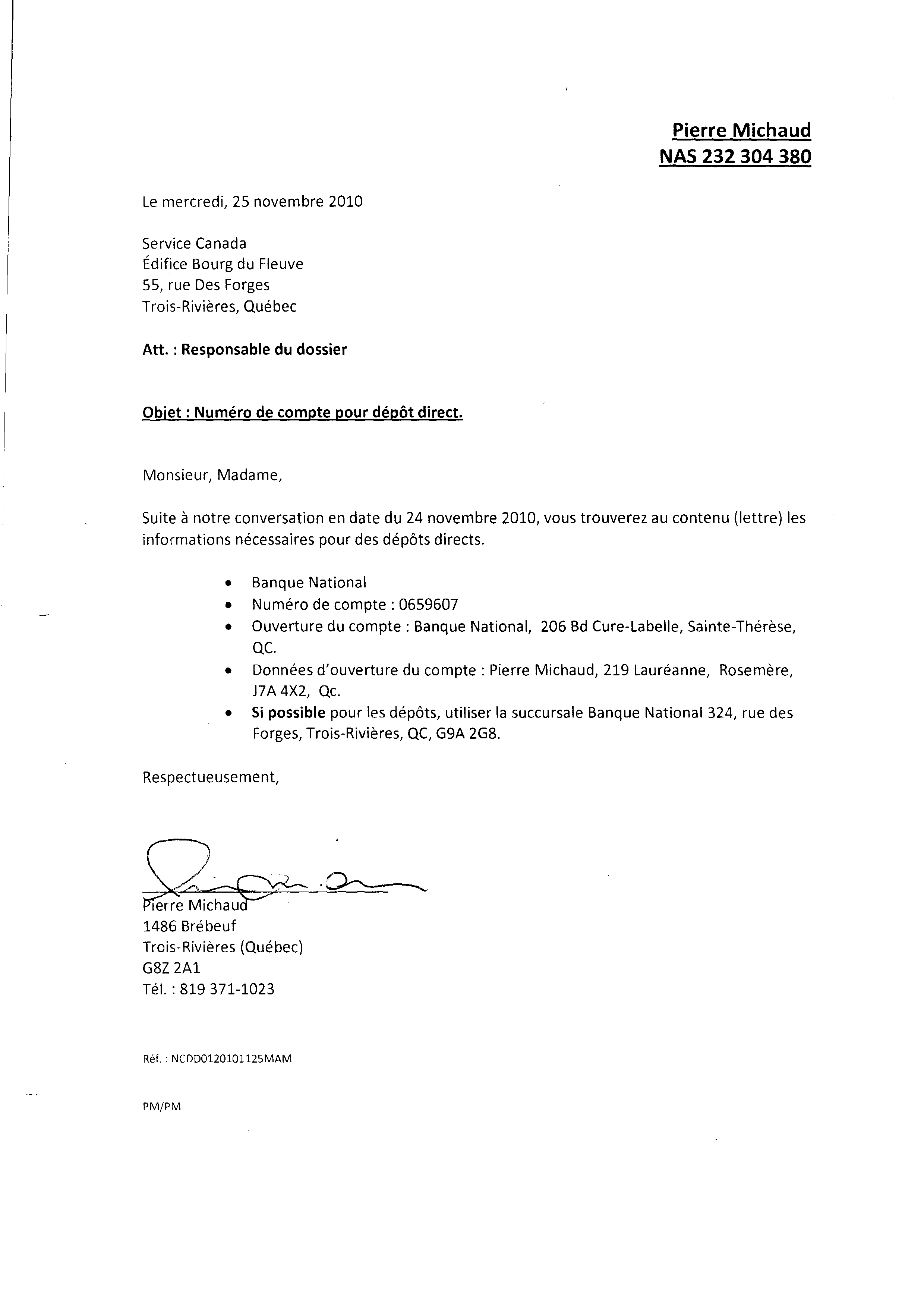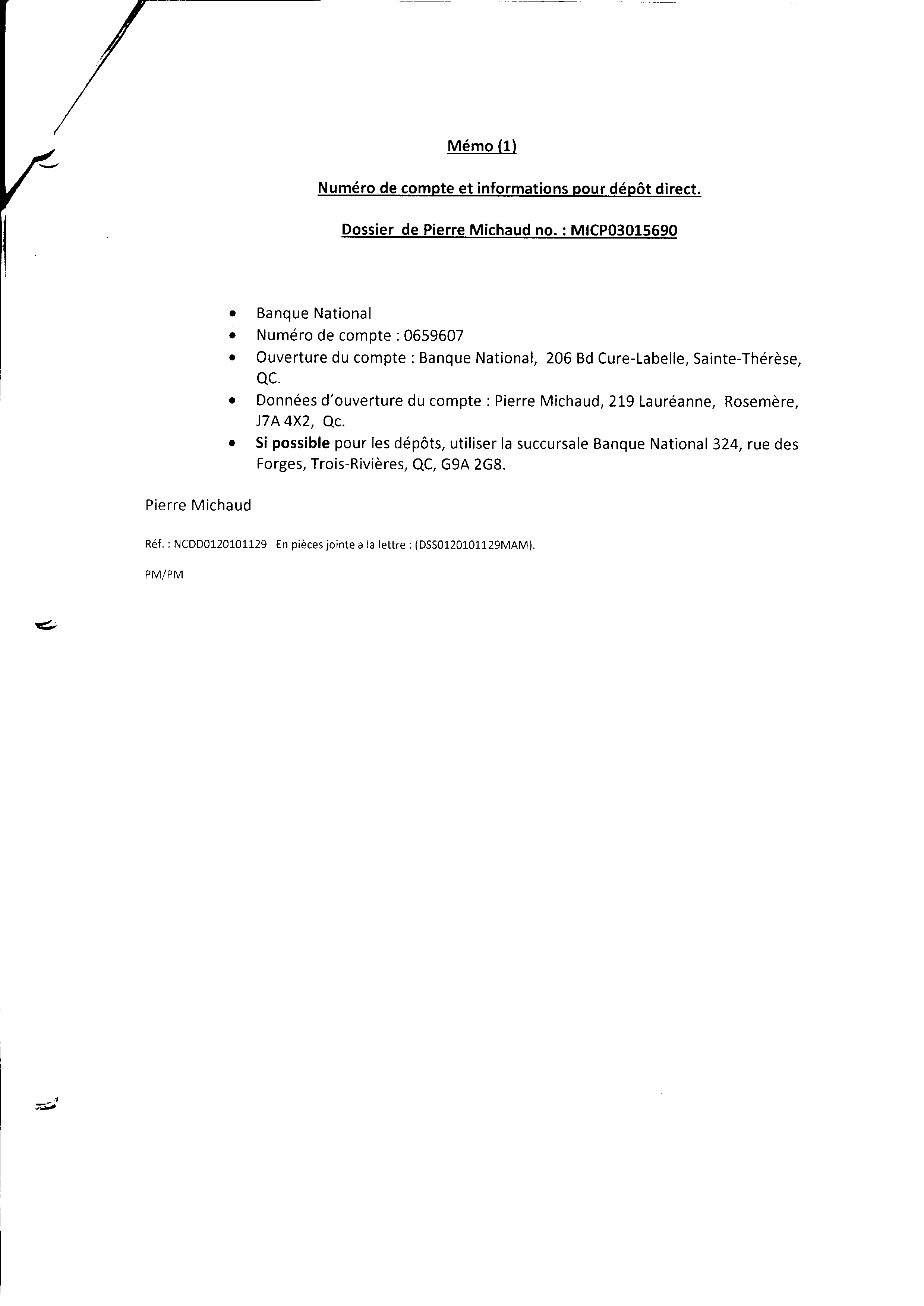 | 032 | Informations du compte de Pierre Michaud Banque National de Rosemère | TR32 |