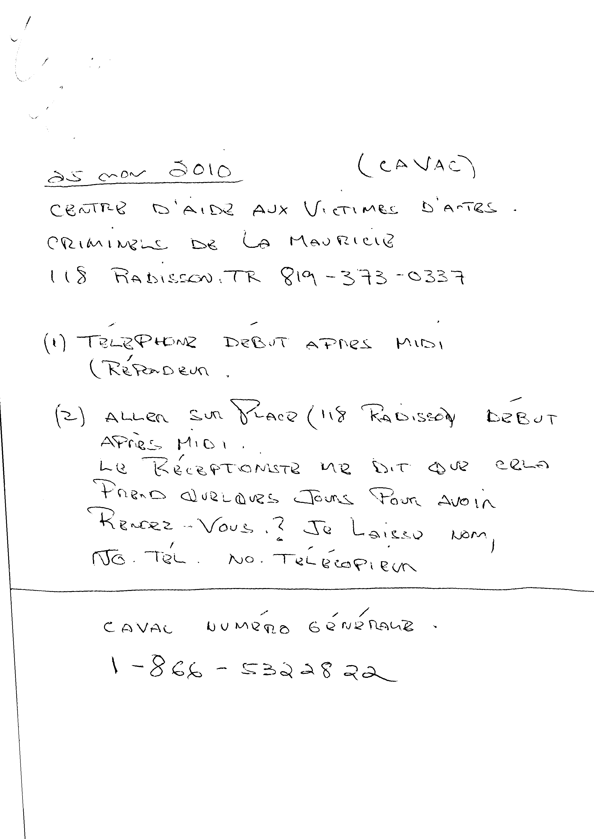| 119 | Informations pour l'aide juridique et avis de plainte contre M. Marc Gervais du CLE de Trois-Rivières le 10 décembre 2010 2 de 5 | TR119 |