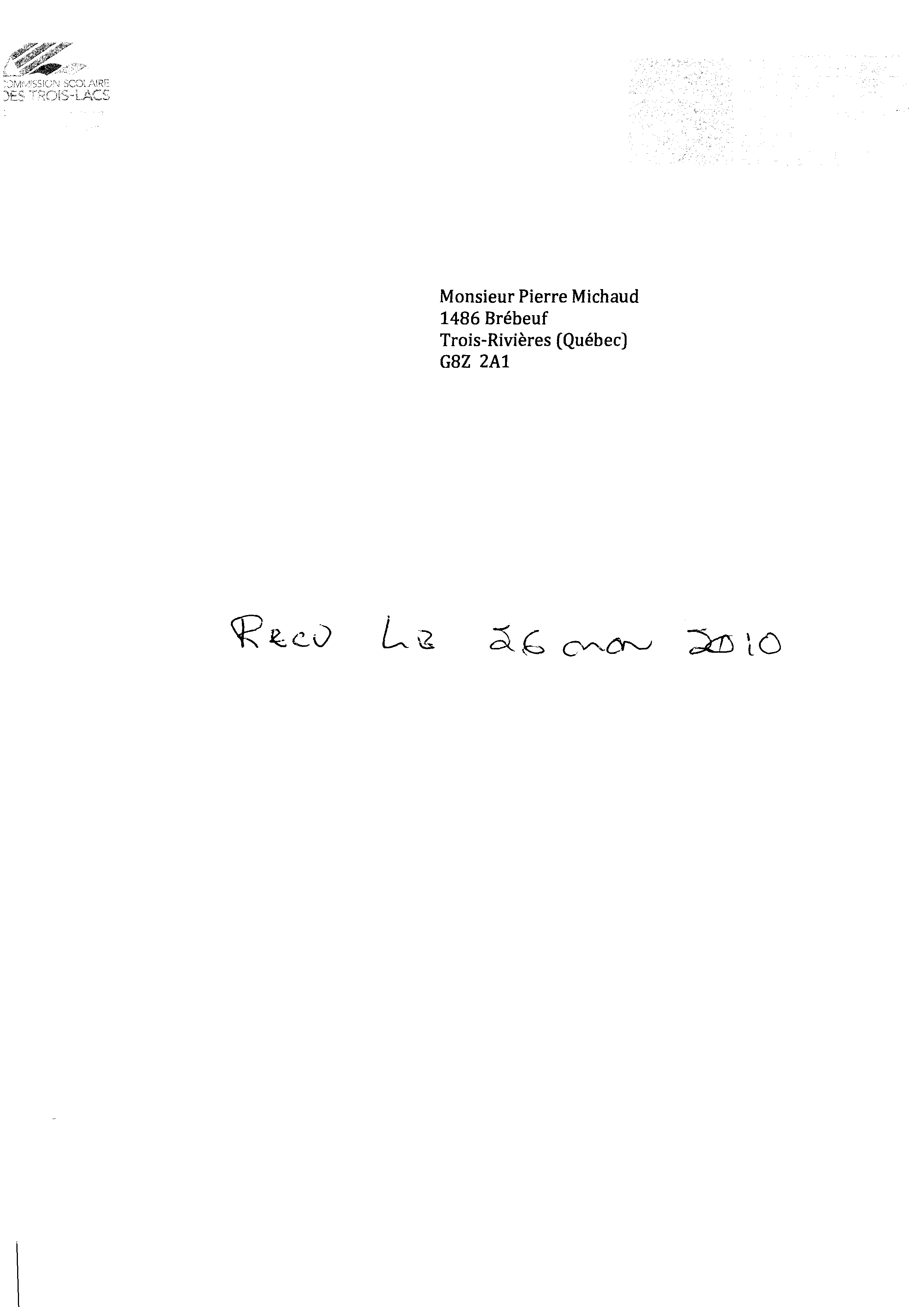 | 040 | Enveloppe de réception de document de la Commission Scolaire de Trois-Lacs datée du 26 novenbre 2010 | TR40 |
