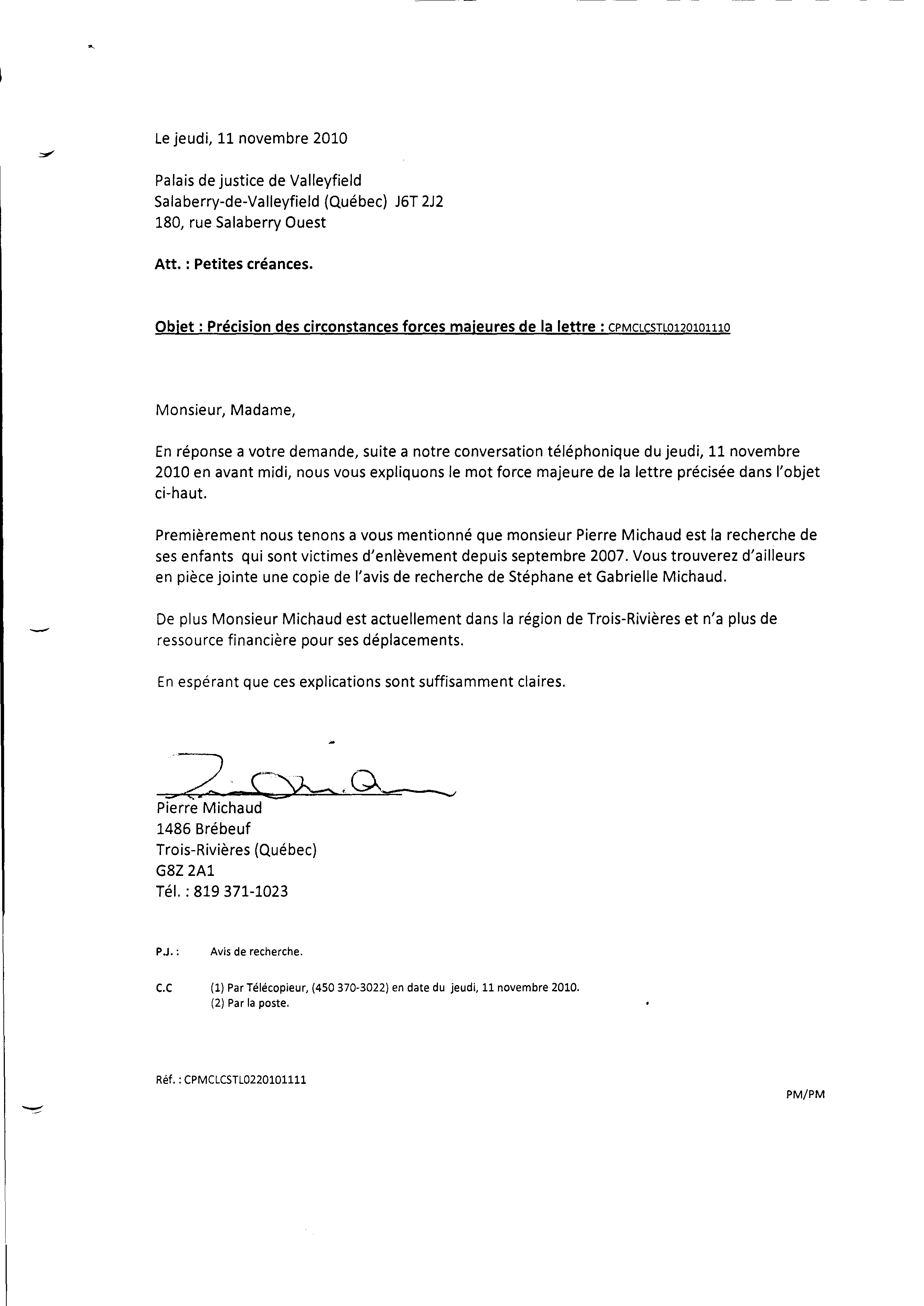 | 009 | Lettre de précision des circonstances ayant mené à l'absence de monsieur Michaud en cour de justice (force majeure). Un des dossiers de la Commission Scolaire des Trois-Lacs. | TR9 |