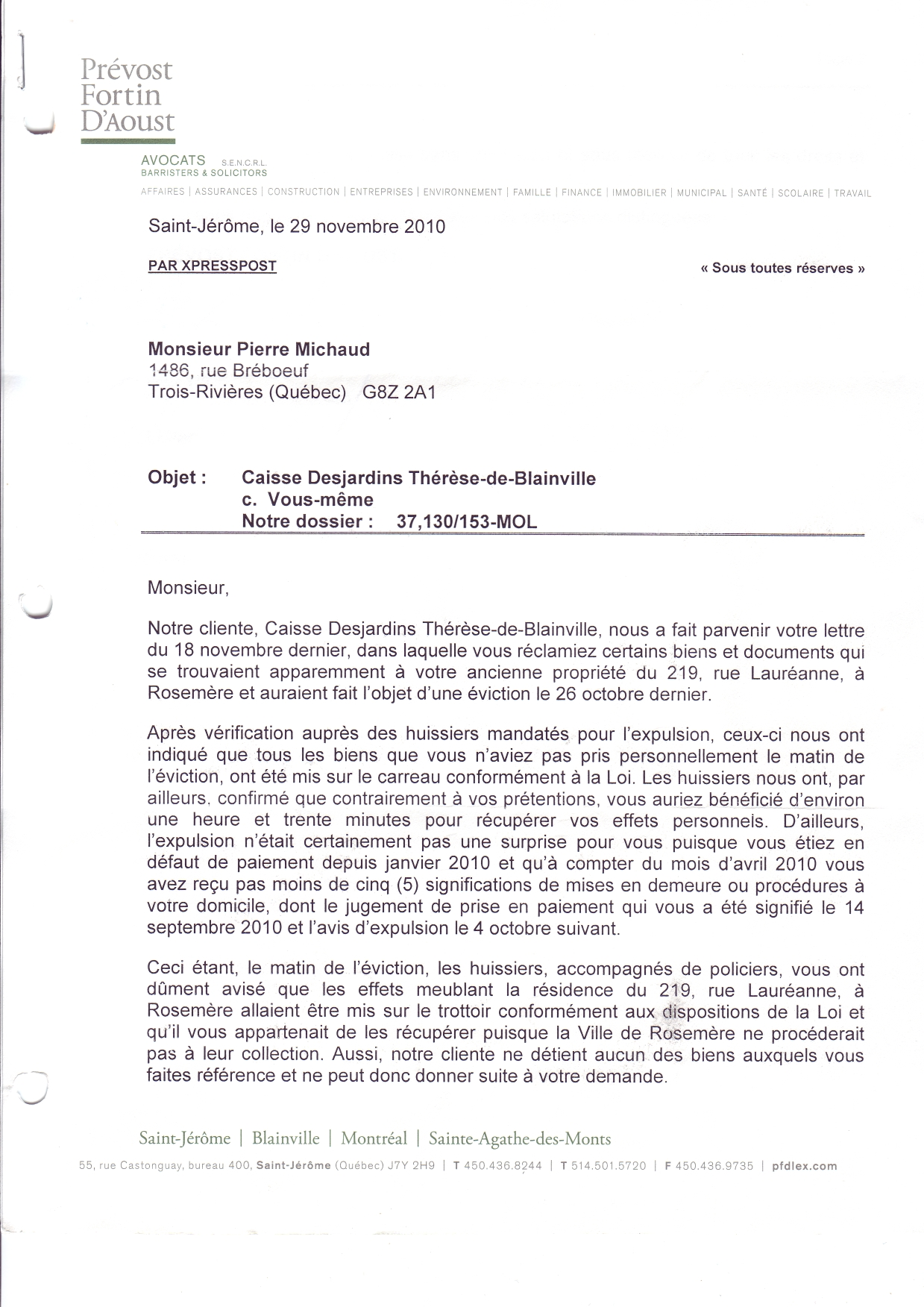 | 071 | Lettre avis de poursuite contre la caisse polulaire de Rosemère le 15 novembre 2010 (duplicata possible) | TR71 |