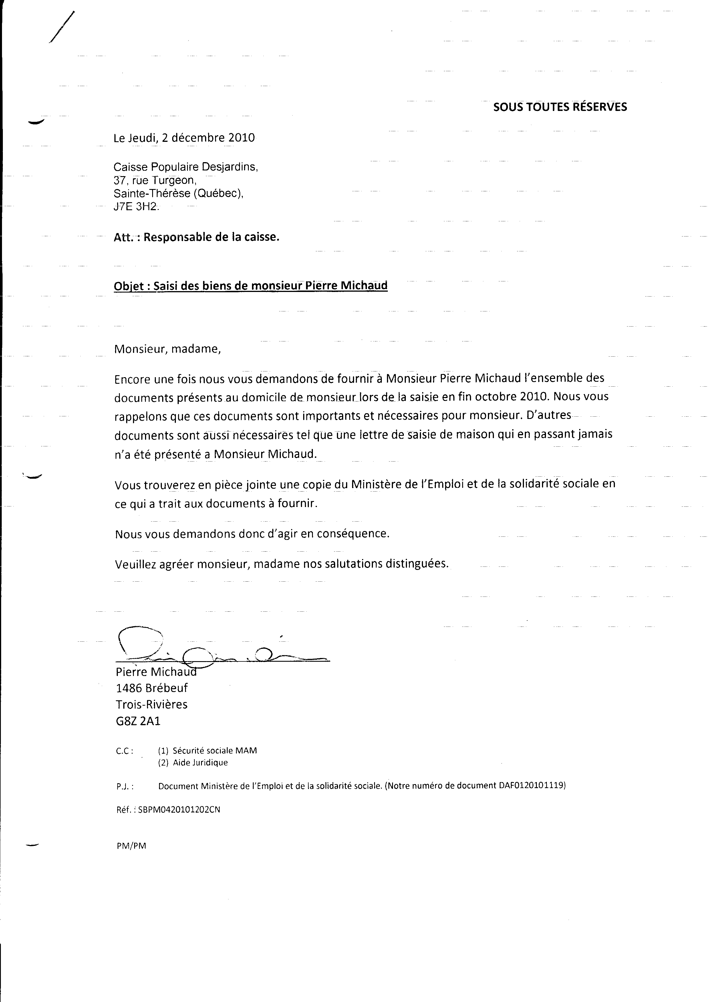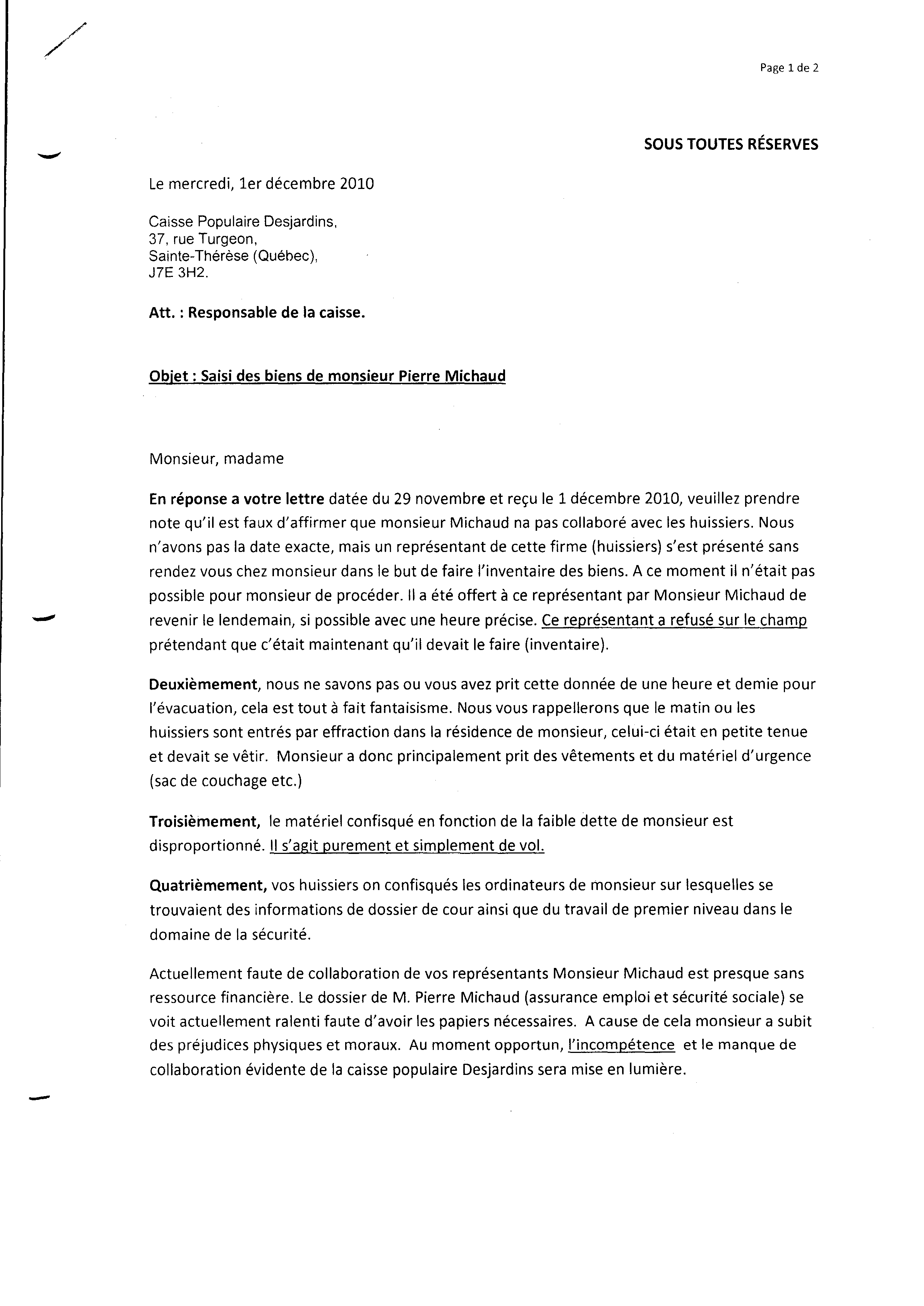 | 073 | Lettre de réponse a la lettre daté du 29 novembre 2010 de la caisse populaire le 01 décembre 2010 1 de 2 (saisie des biens) | TR73 |