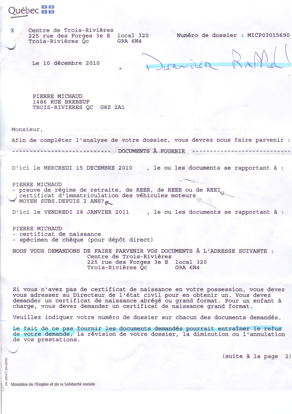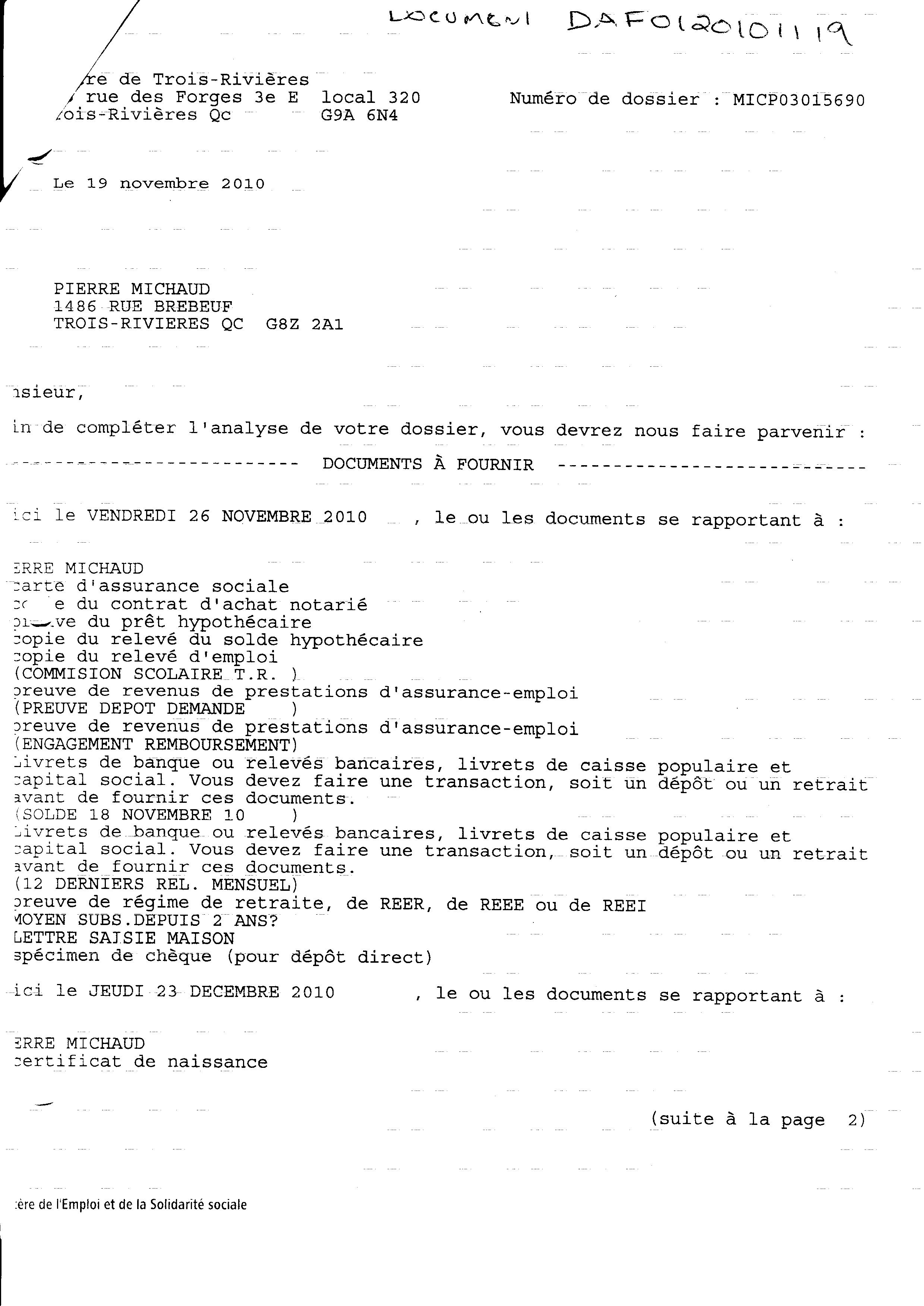 | 019 | Demande de documents du centre local d'emploi de Trois-Rivières daté du 19 novenbre 2010. Voir note de document de la référence 012 (page 2 de 2) | TR19 |