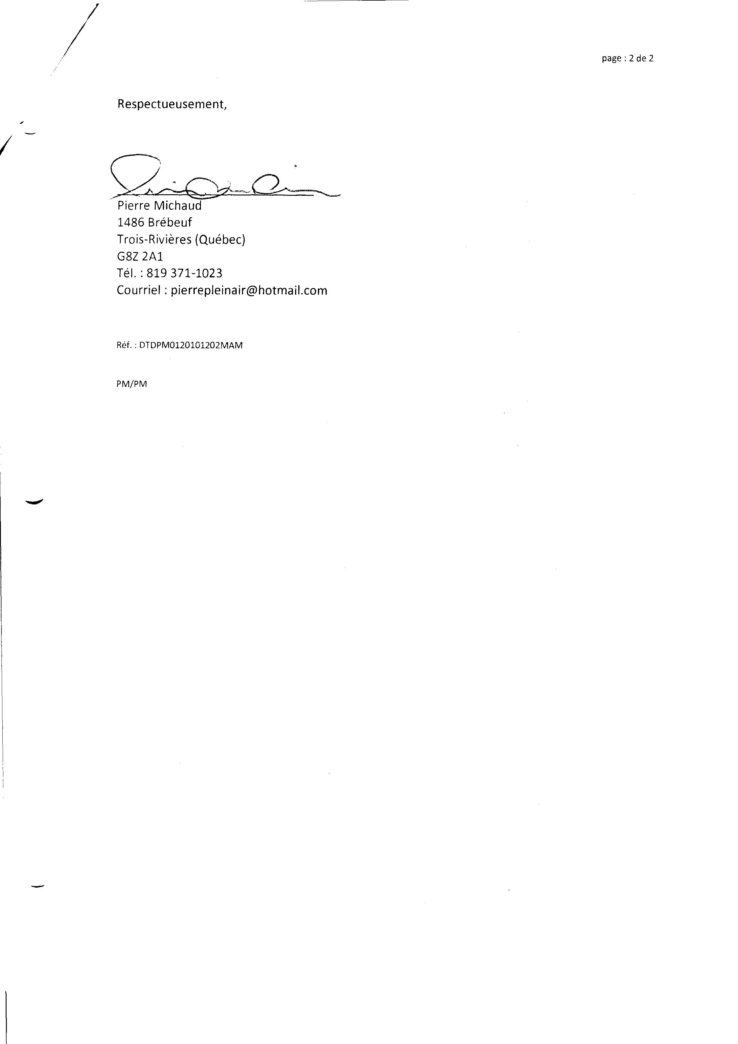 | 012 | Document preuve (adresse de correspondance) à complèter. Il nous est impossible de garantir que la banque de donné de M. Michaud n'a été modifié compte tenu des délais, entreposage, et vols de document de la banque de monsieur. | TR12 |