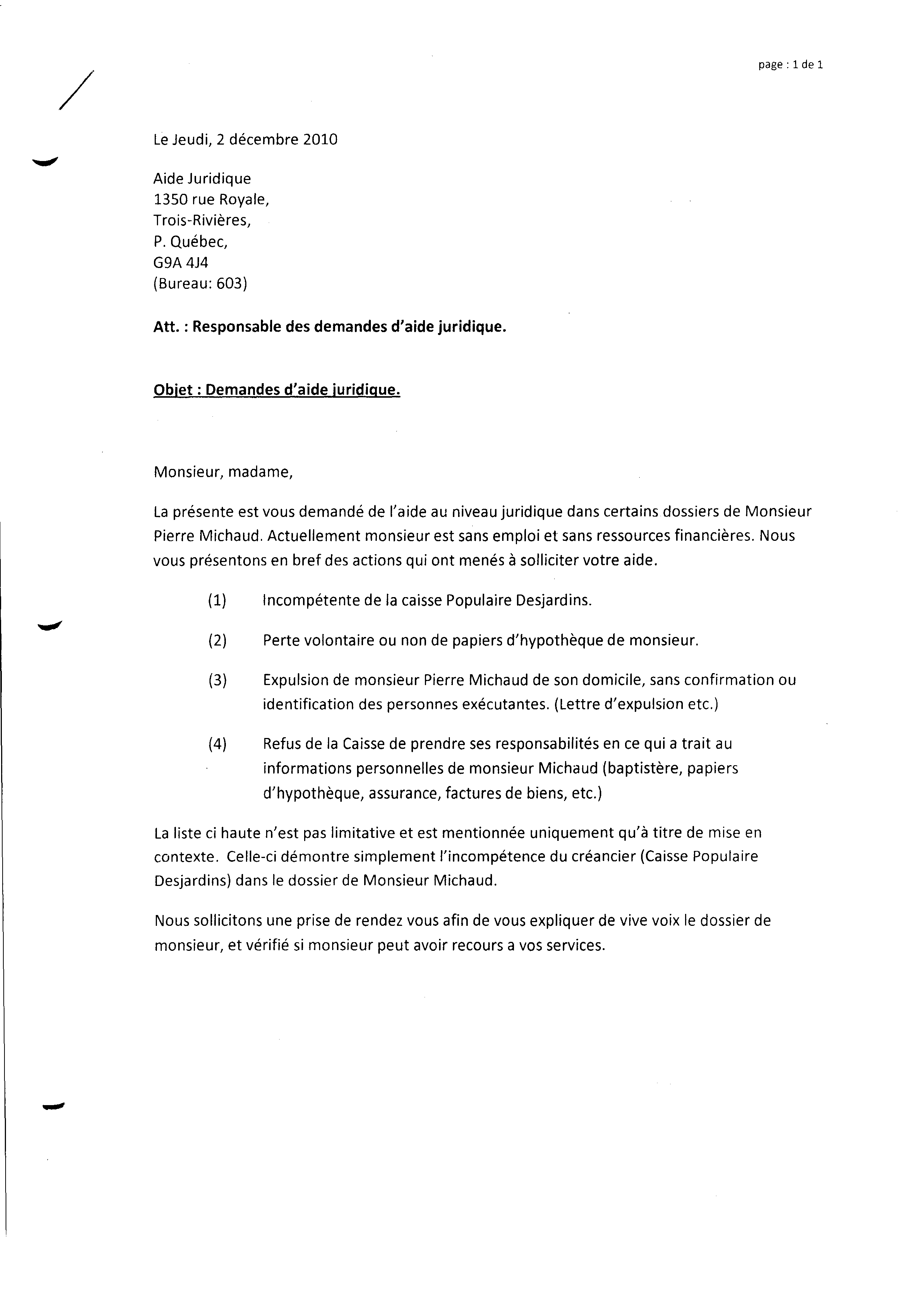 | 069 | Lettre de demande d'aide juridique au 1350 Royale Trois-Rivières le 2 décembre 2010 1 de 2 | TR69 |
