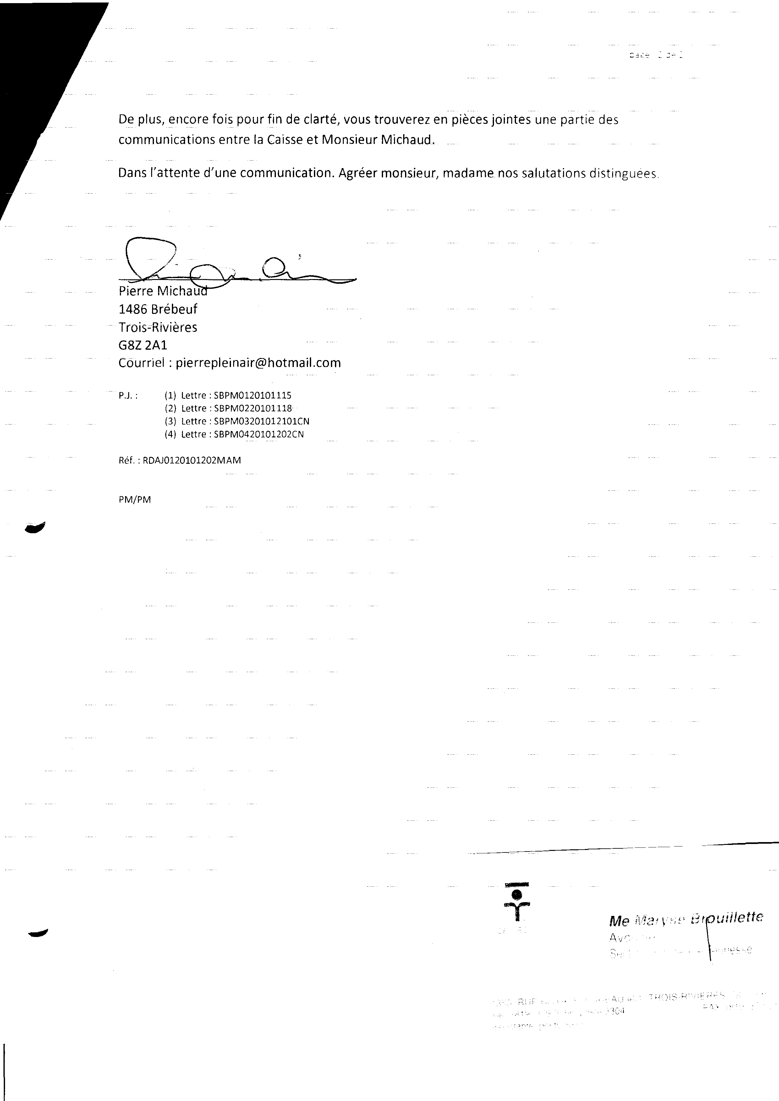 | 116 | Lettre de l'avocate voulant se retirer du dossier de monsieur Pierre Michaud daté du 10 décembre 2010 | TR116 |