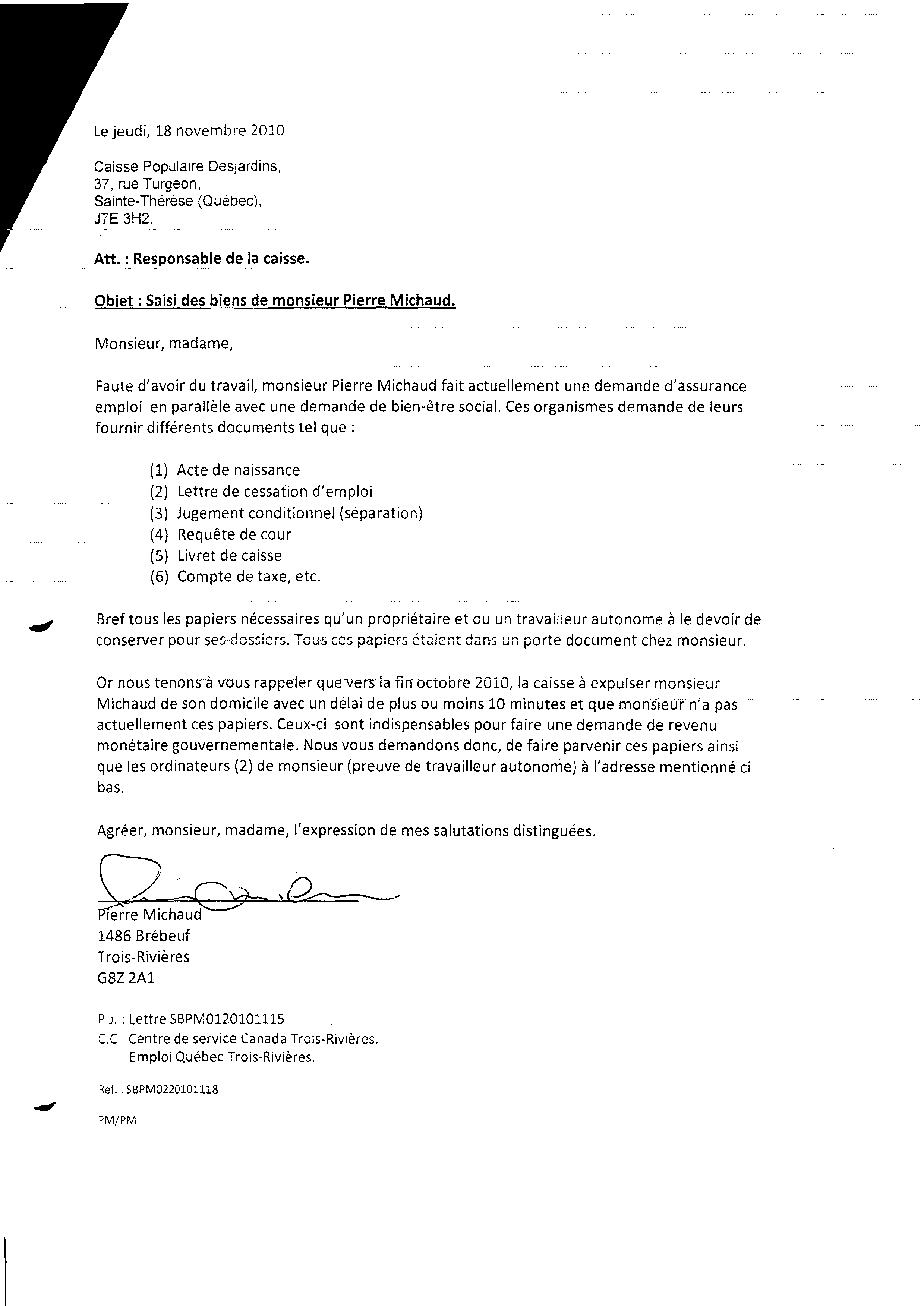 | 014 | Lettre du 18 novembre 2010 à la caisse populaire (saisi (vols) de biens de Pierre Michaud) | TR14 |