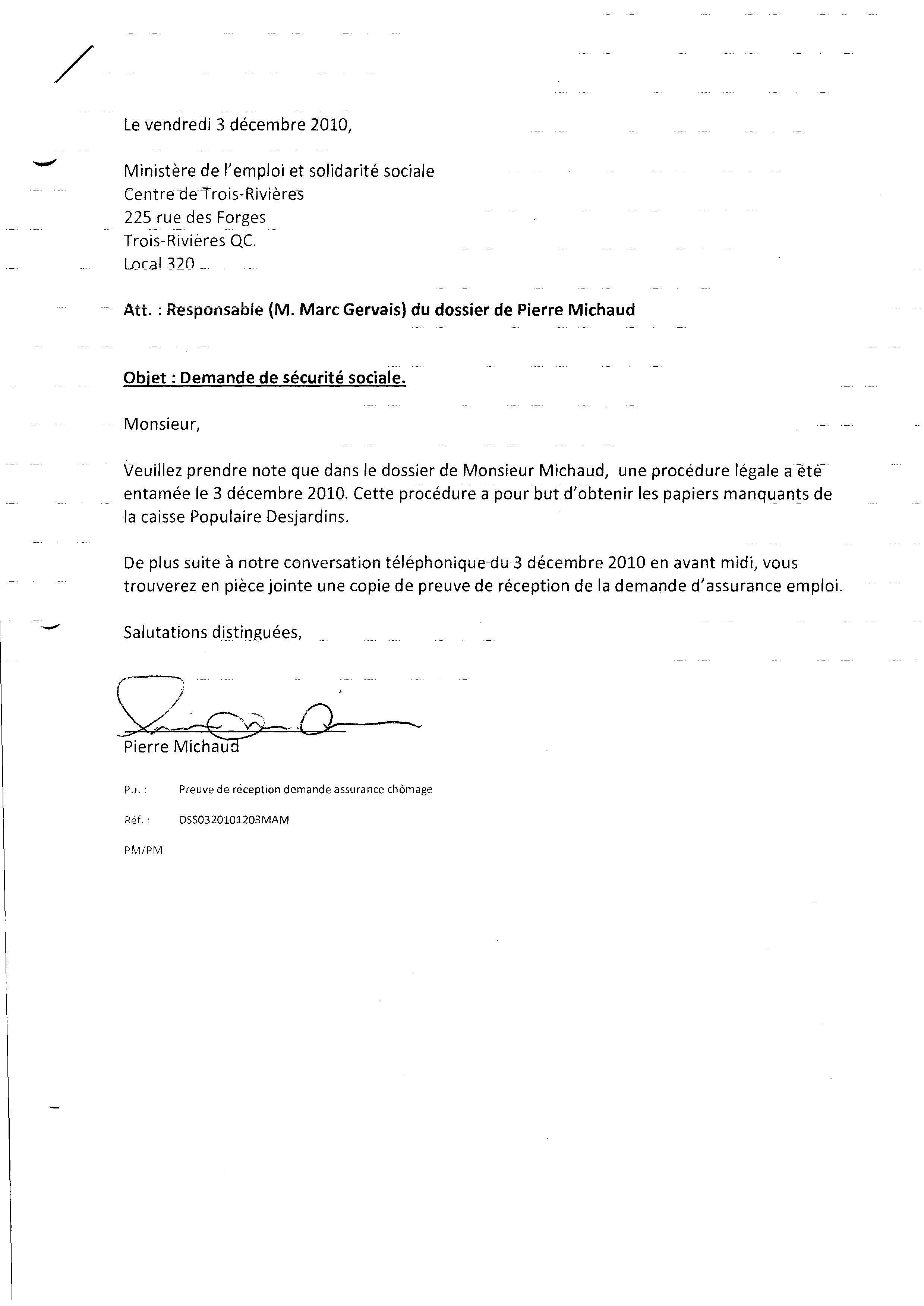 | 084 | Confirmation de la demande d'assurance chomage de Pierre Michaud auprès de Services Canada le 19 novembre 2010 | TR84 |