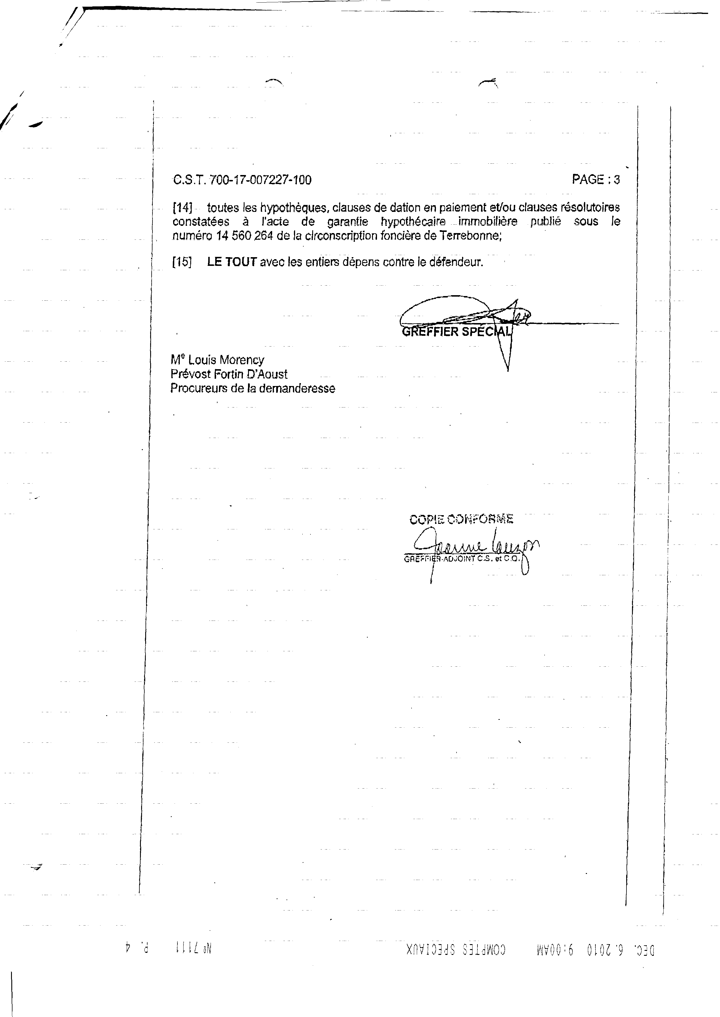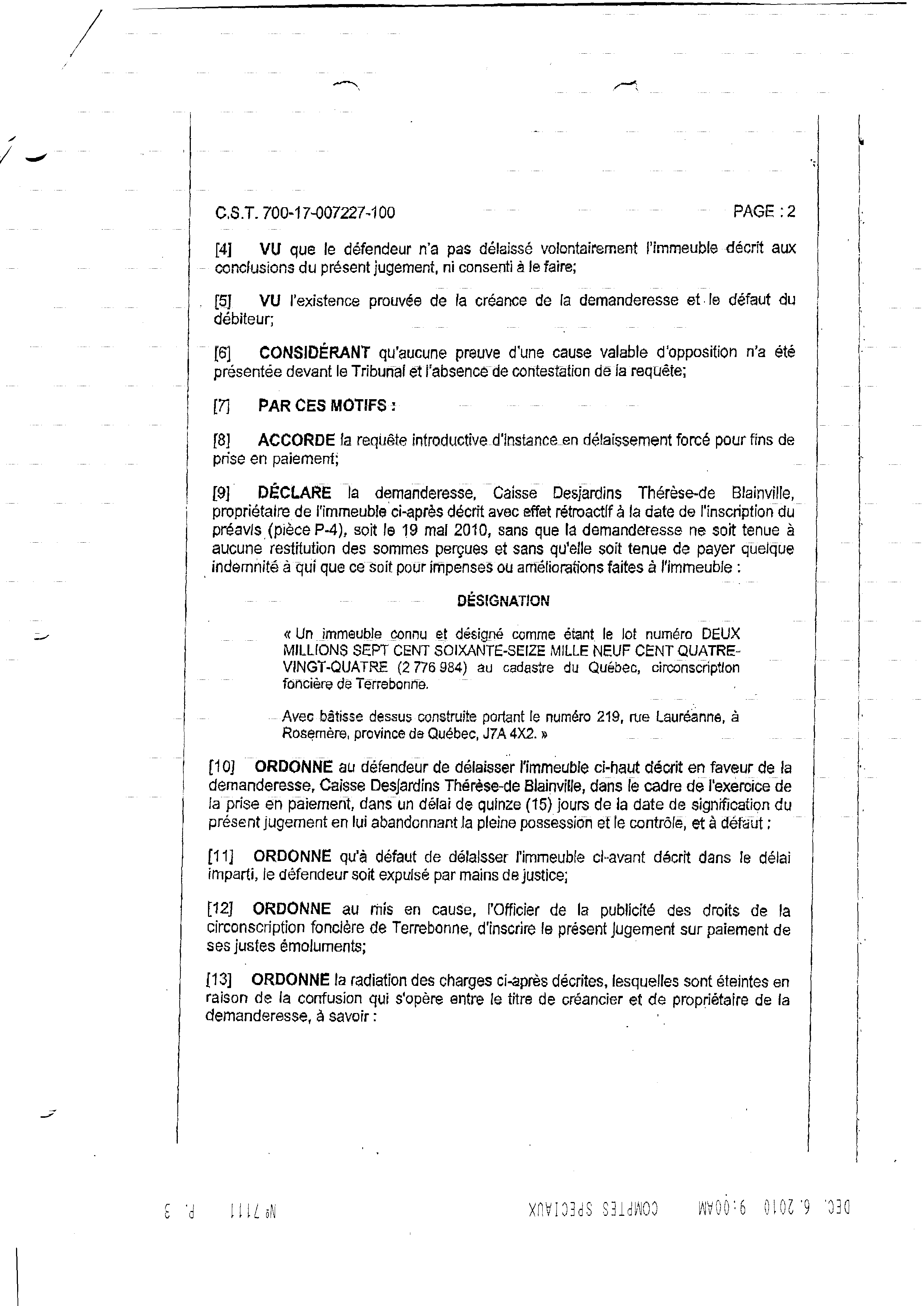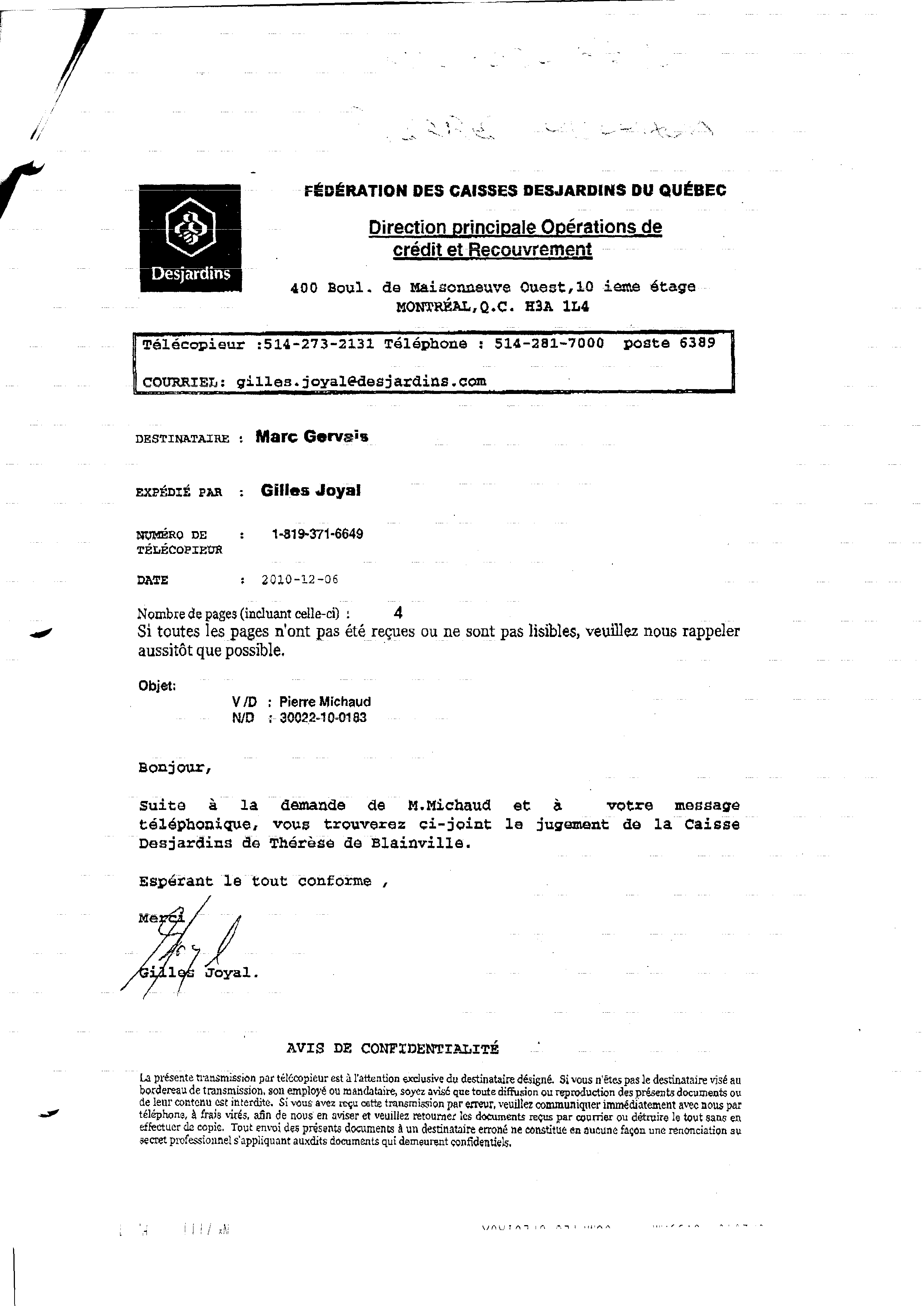 | 111 | Page de transmission de la Caisse populaire (envoi par télécopieur) LE JUGEMENT ce 09 décembre 2010 | TR111 |