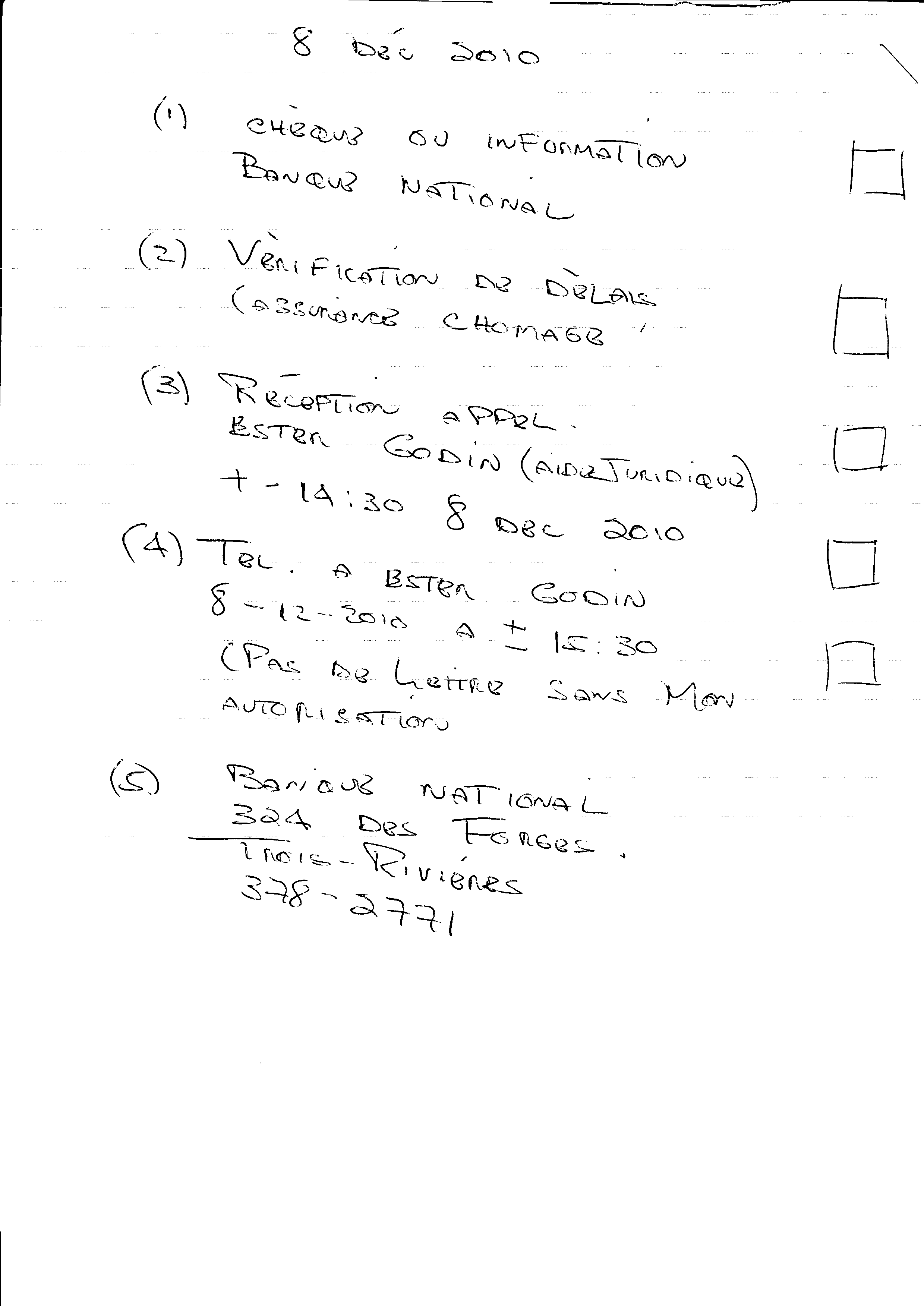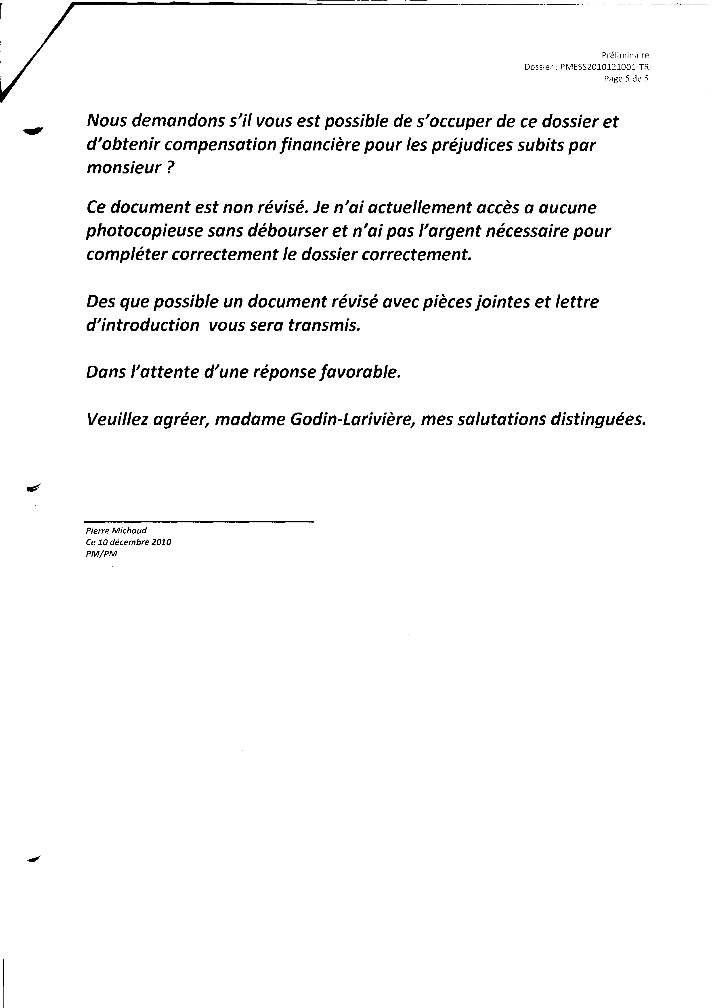 | 122 | Informations pour l'aide juridique et avis de plainte contre M. Marc Gervais du CLE de Trois-Rivières le 10 décembre 2010 5 de 5 | TR122 |