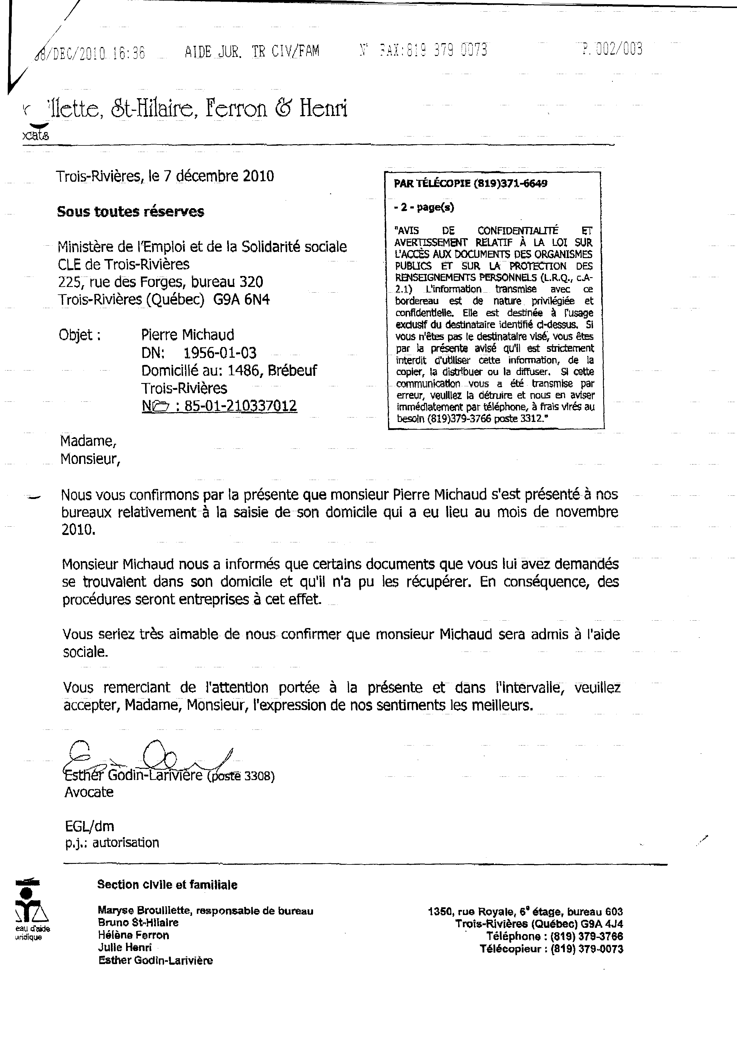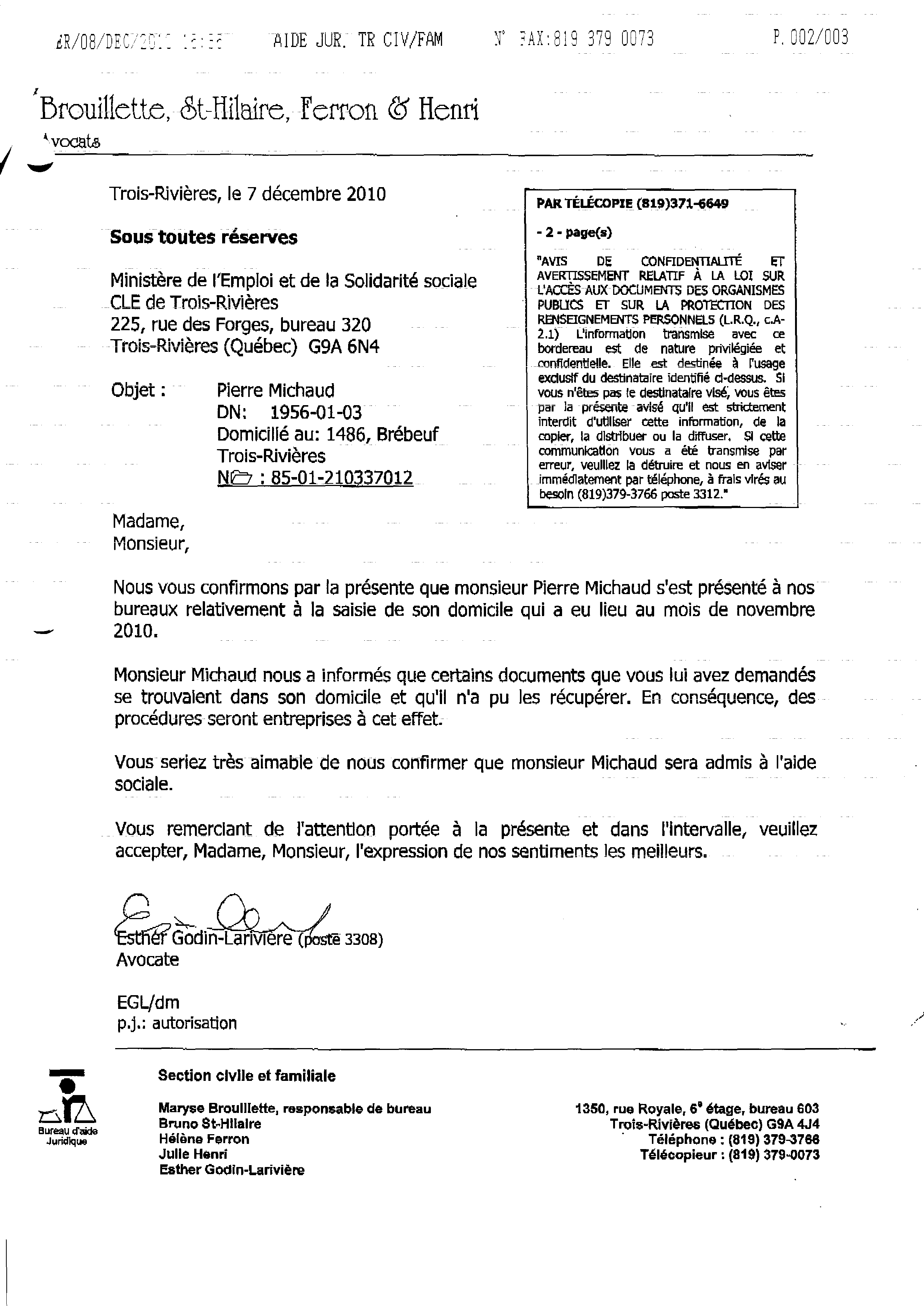 | 103 | Lettre d'avocate de l'aide juridique de Trois-Rivières pour obtenir mes documents personnel le 07 décembre 2010 | TR103 |
