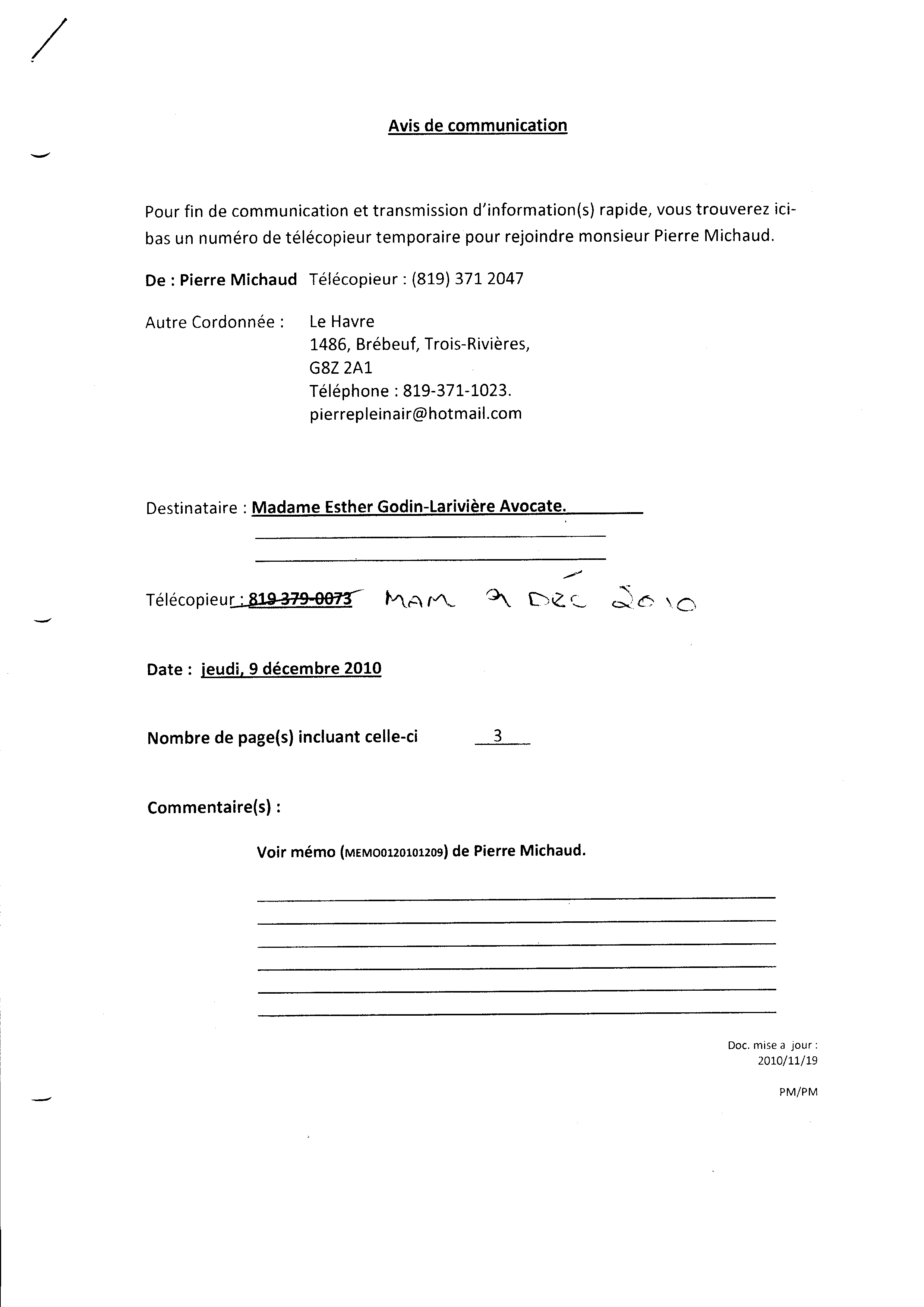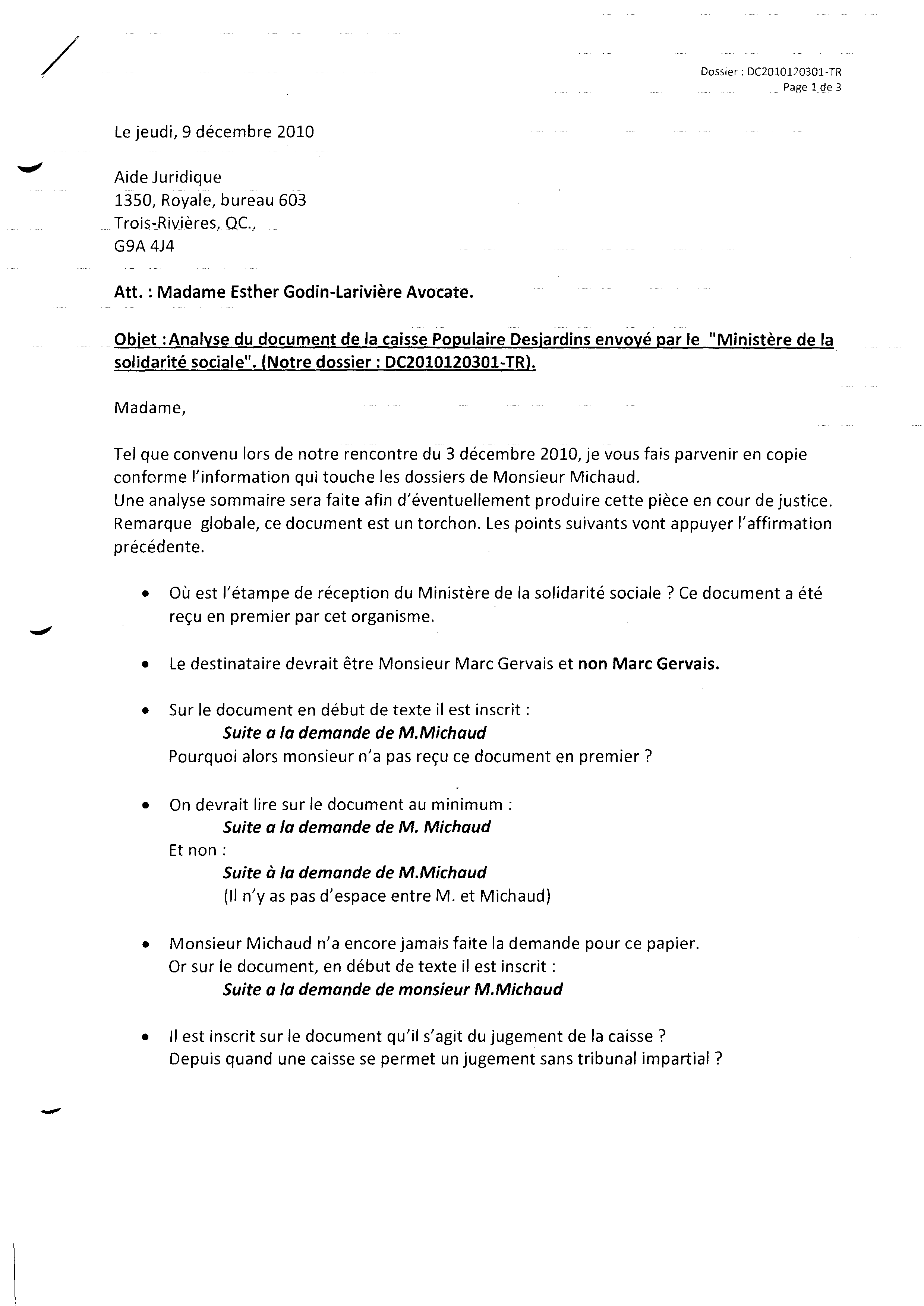 | 120 | Informations pour l'aide juridique et avis de plainte contre M. Marc Gervais du CLE de Trois-Rivières le 10 décembre 2010 3 de 5 | TR120 |