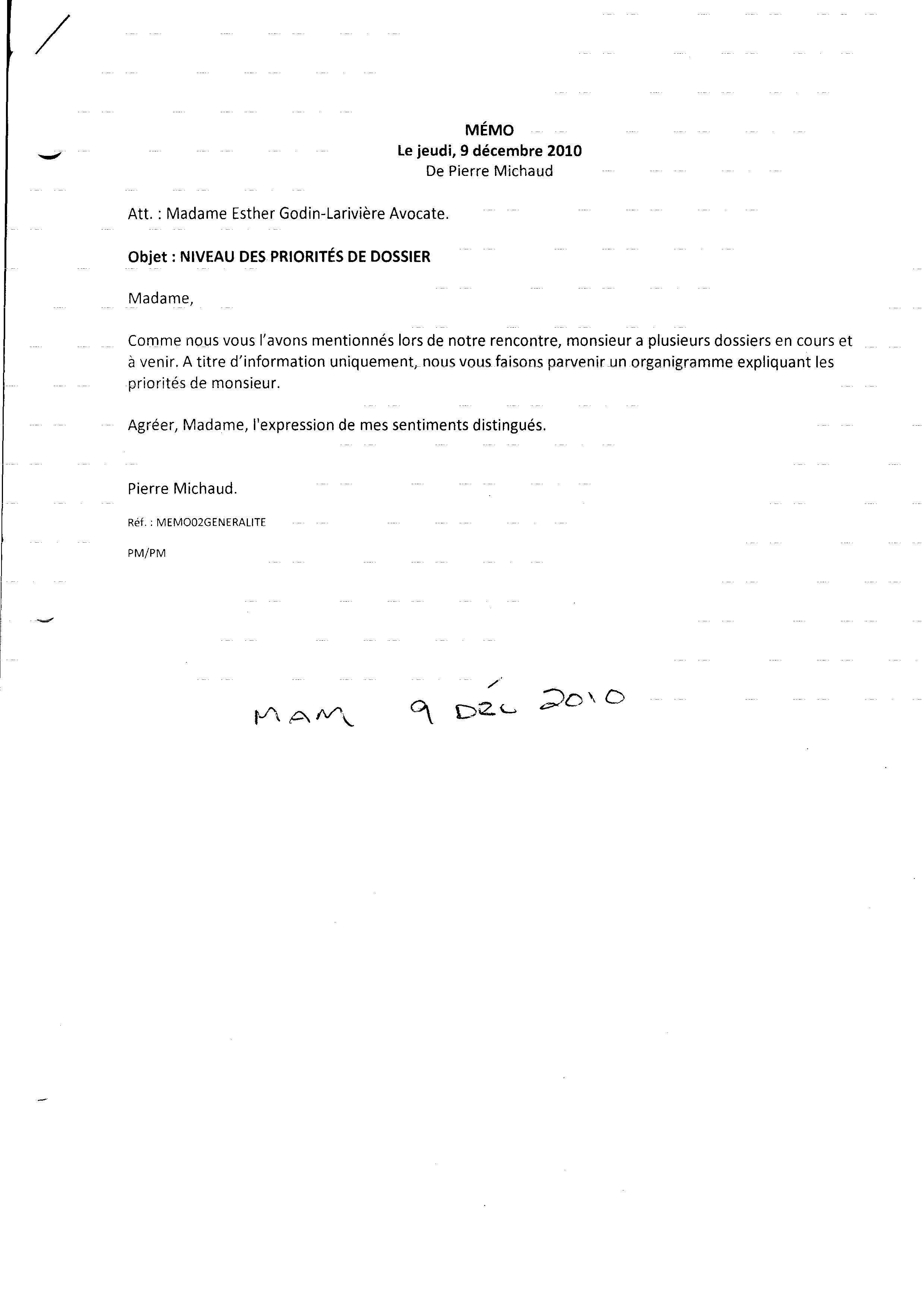 | 104 | Mémo de Pierre Michaud expliquant la priorité des dossier de Pierre Michaud le 09 décembre 2010 1 de 2 | TR104 |