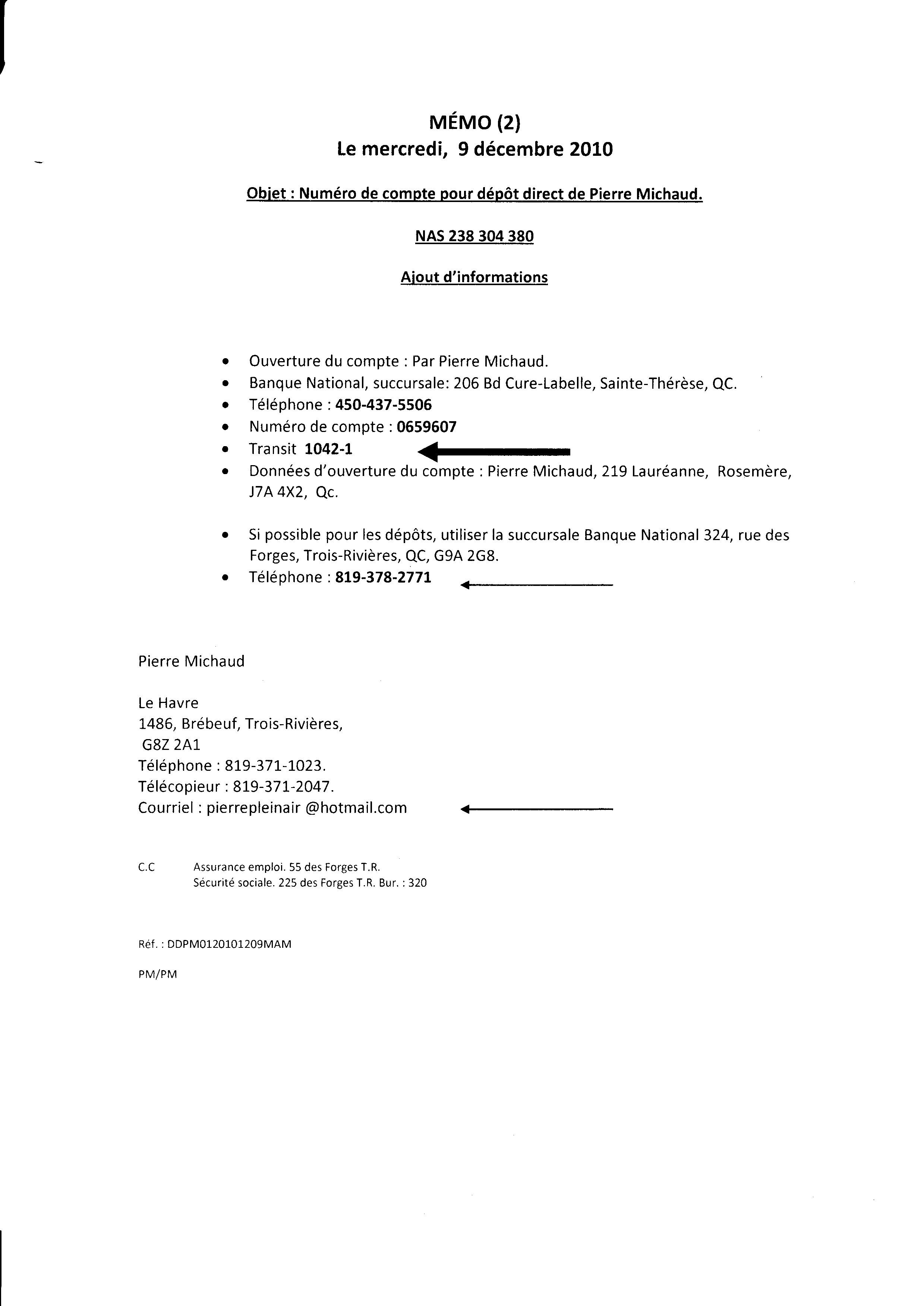 | 032 | Informations du compte de Pierre Michaud Banque National de Rosemère | TR32 |