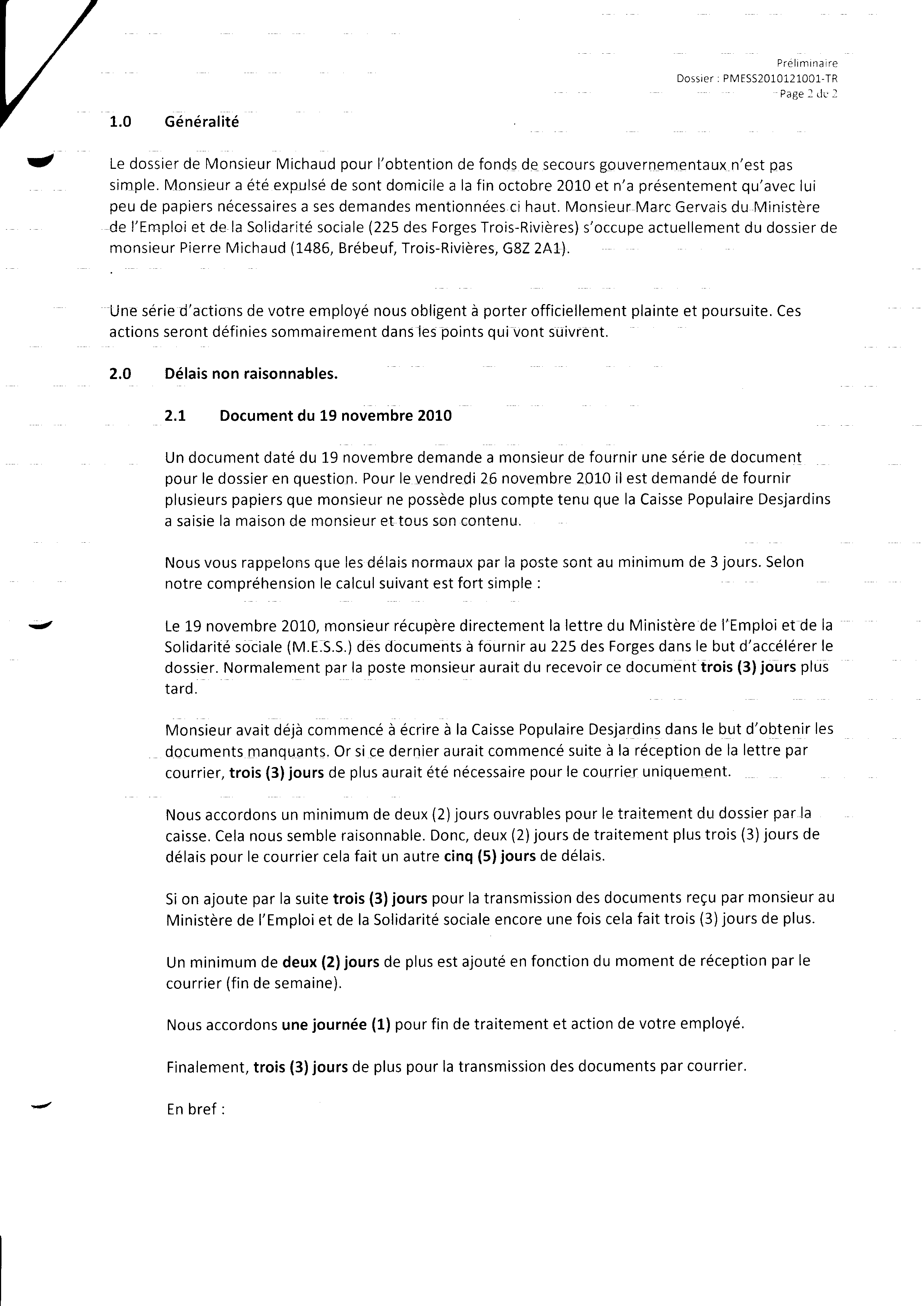 | 119 | Informations pour l'aide juridique et avis de plainte contre M. Marc Gervais du CLE de Trois-Rivières le 10 décembre 2010 2 de 5 | TR119 |