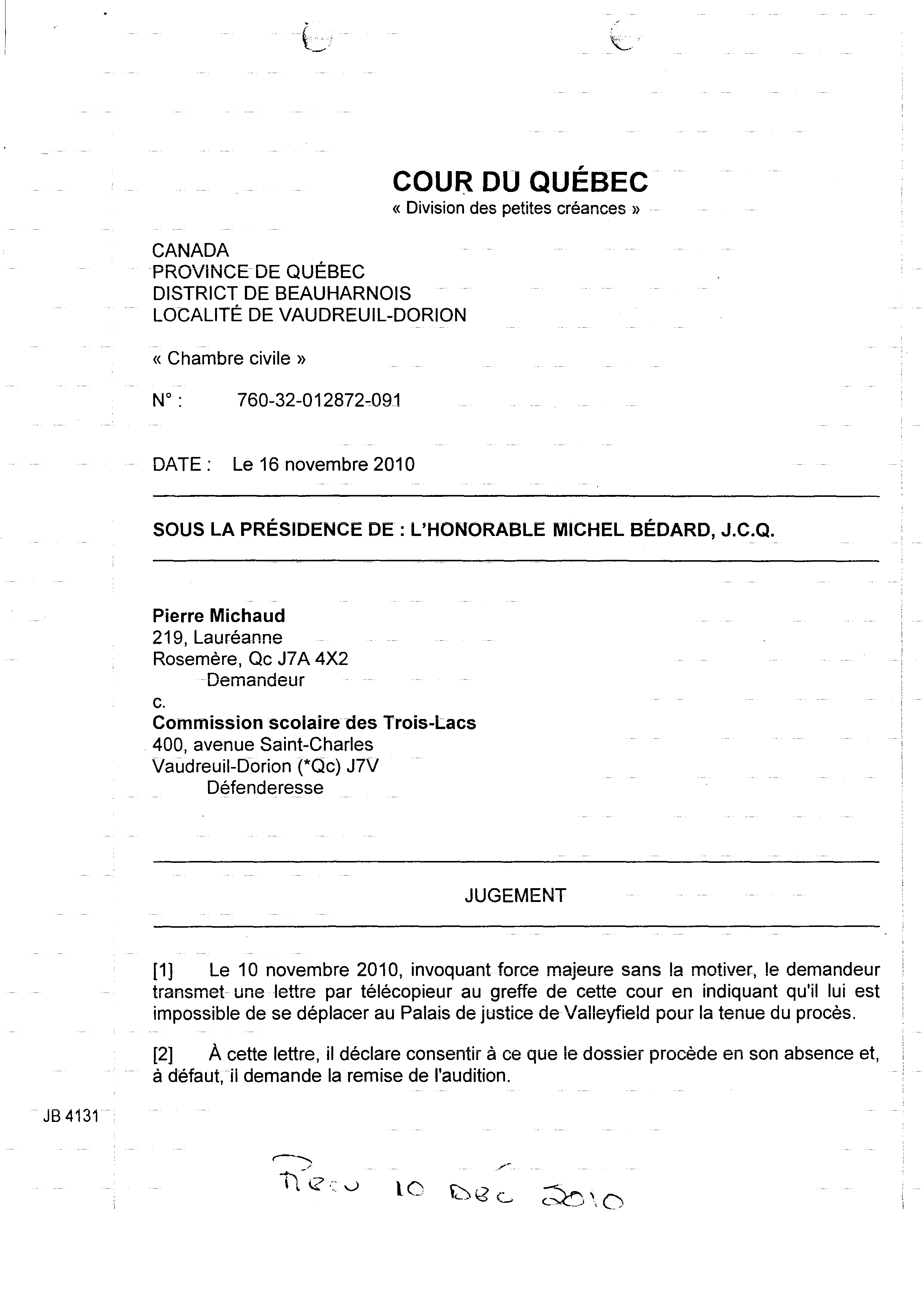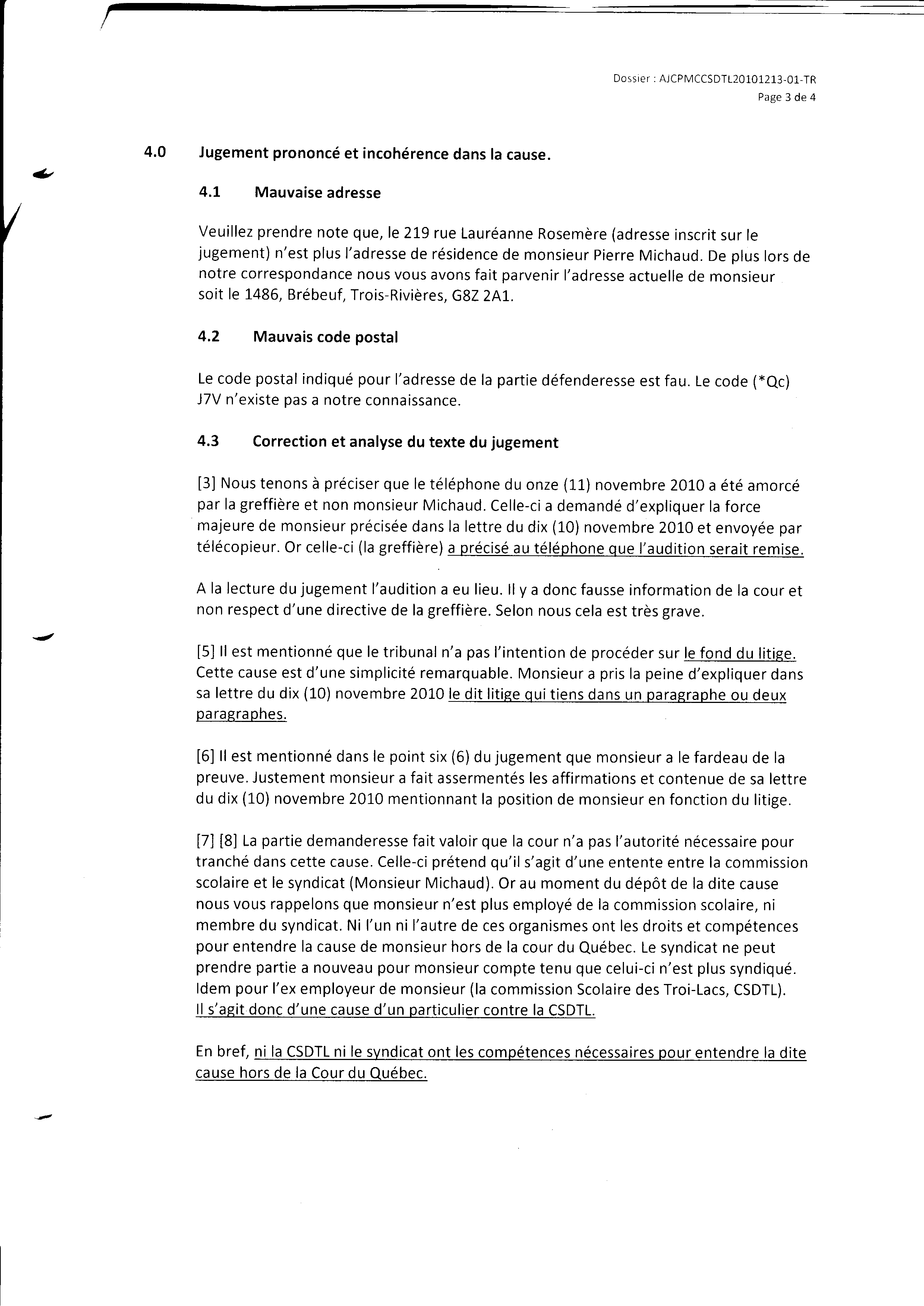 | 124 | Jugement des petites créances suite a ma demande de poursuite (la première) contre la commission Scolaire des Trois-Lacs le 16-11-2010 2 de 4 | TR124 |