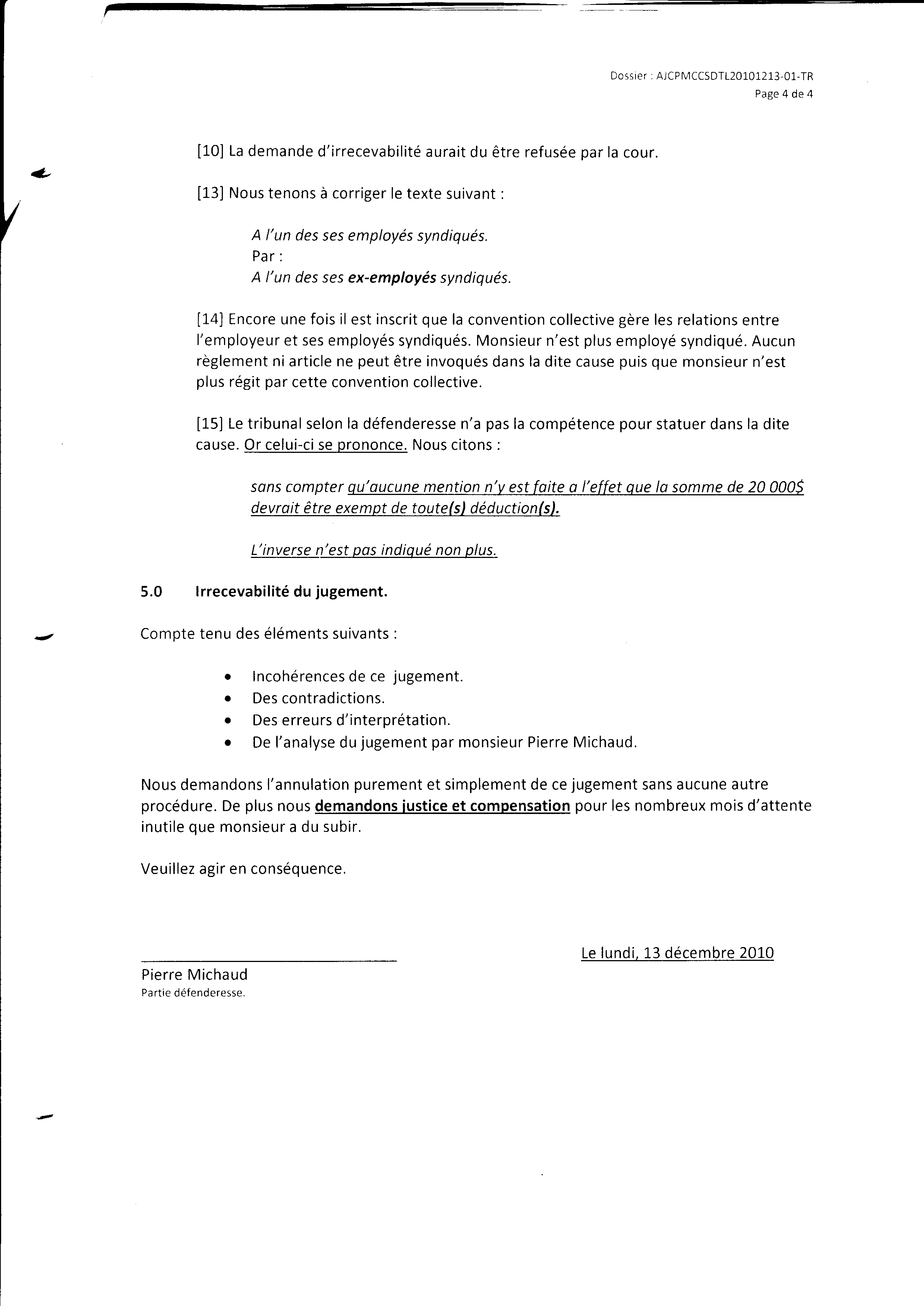 | 131 | Analyse de cet autre torchon par Pierre Michaud le 13 décembre 2010 page 4 de 4 (une sanction d'emprisonnement doit être envisagé contre ces gens) | TR130 |