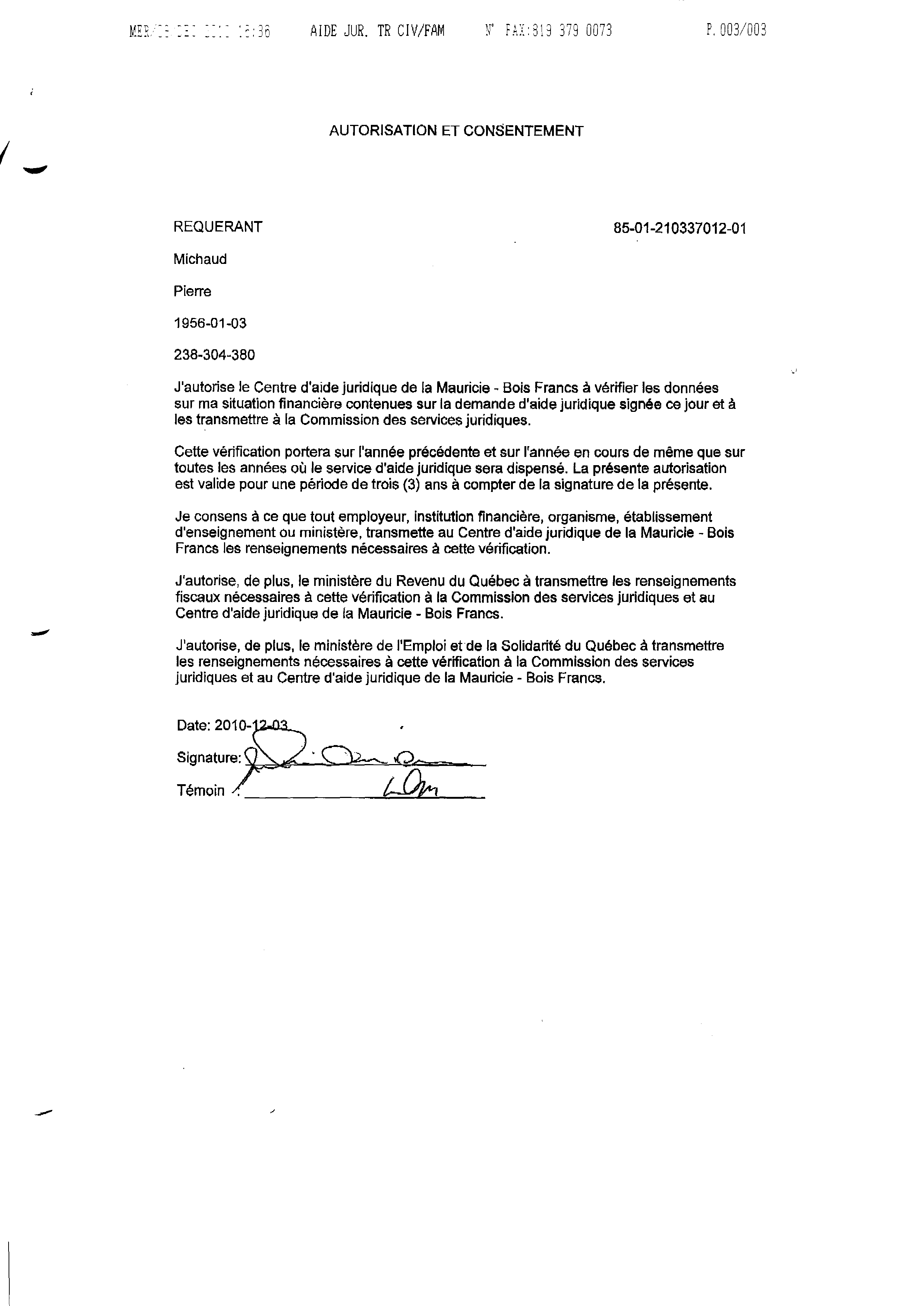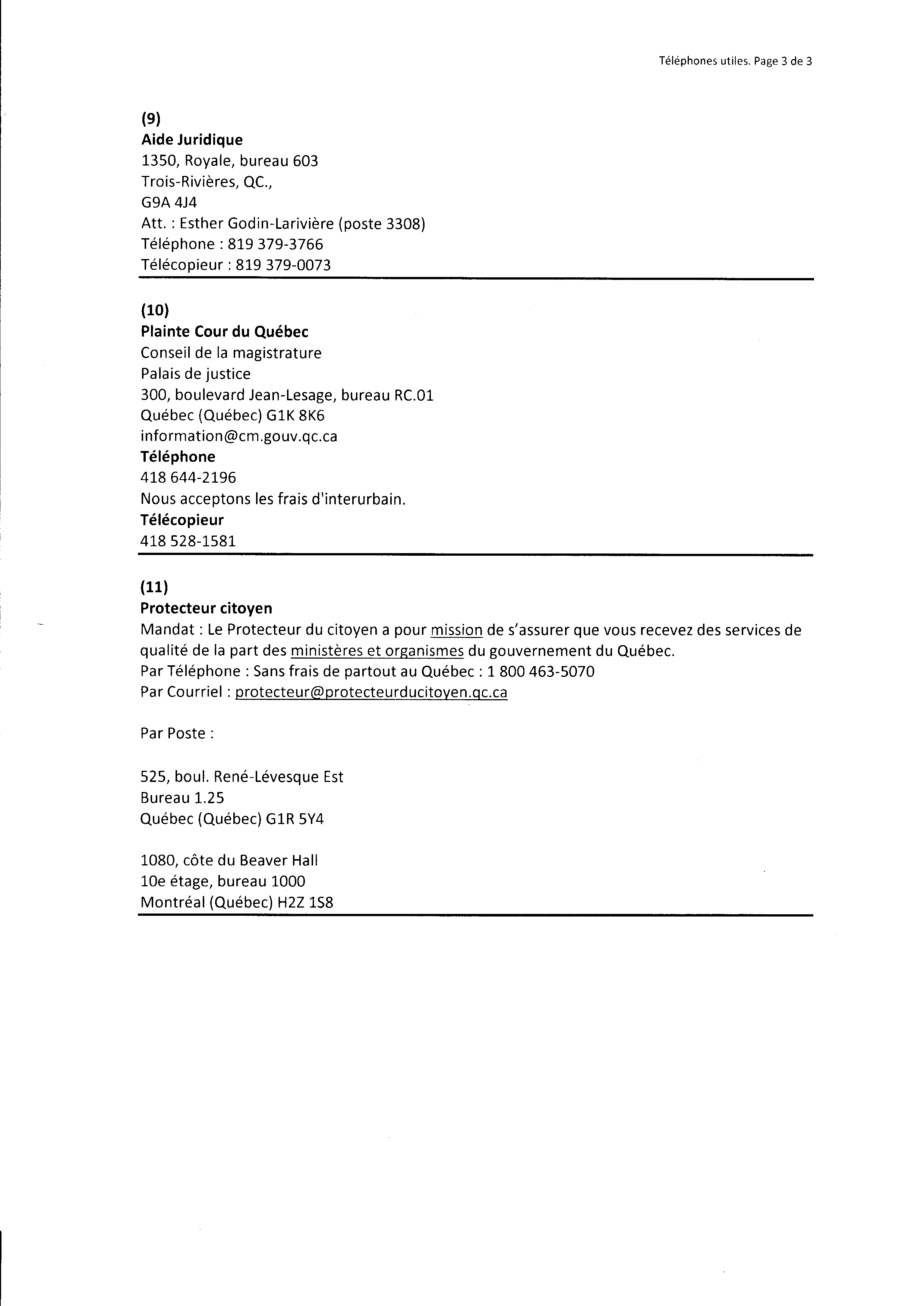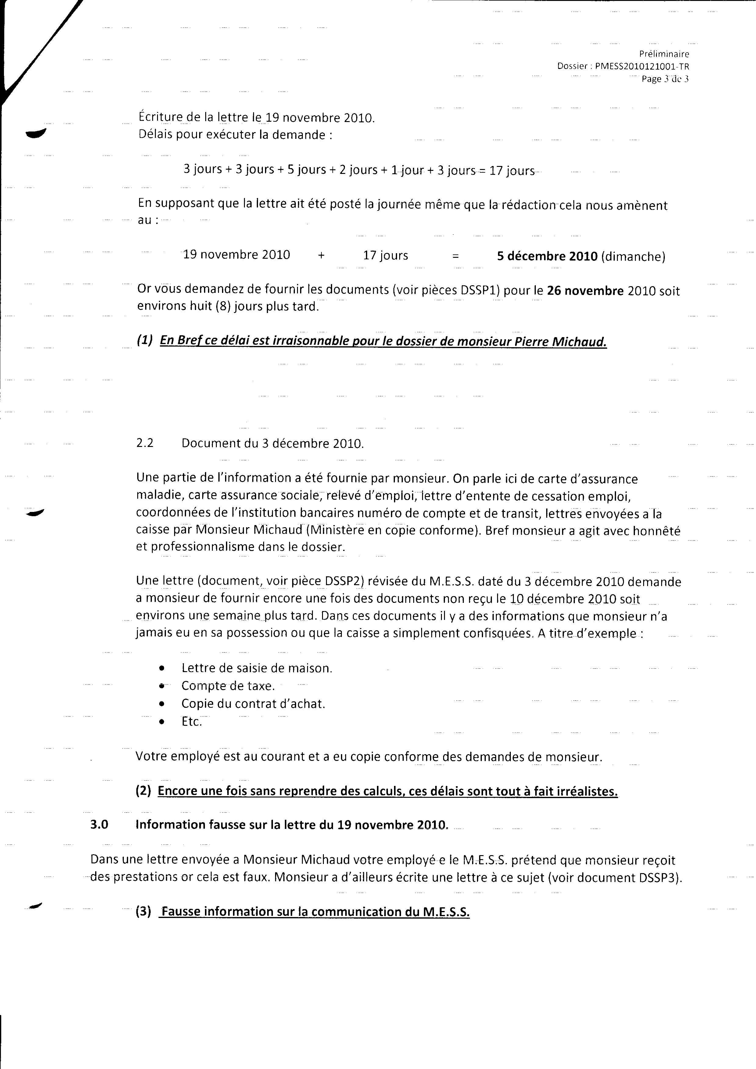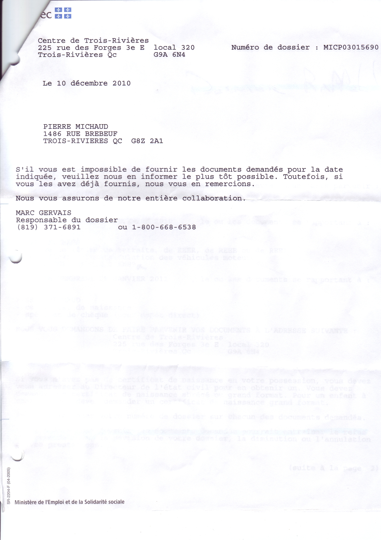 | 120 | Informations pour l'aide juridique et avis de plainte contre M. Marc Gervais du CLE de Trois-Rivières le 10 décembre 2010 3 de 5 | TR120 |