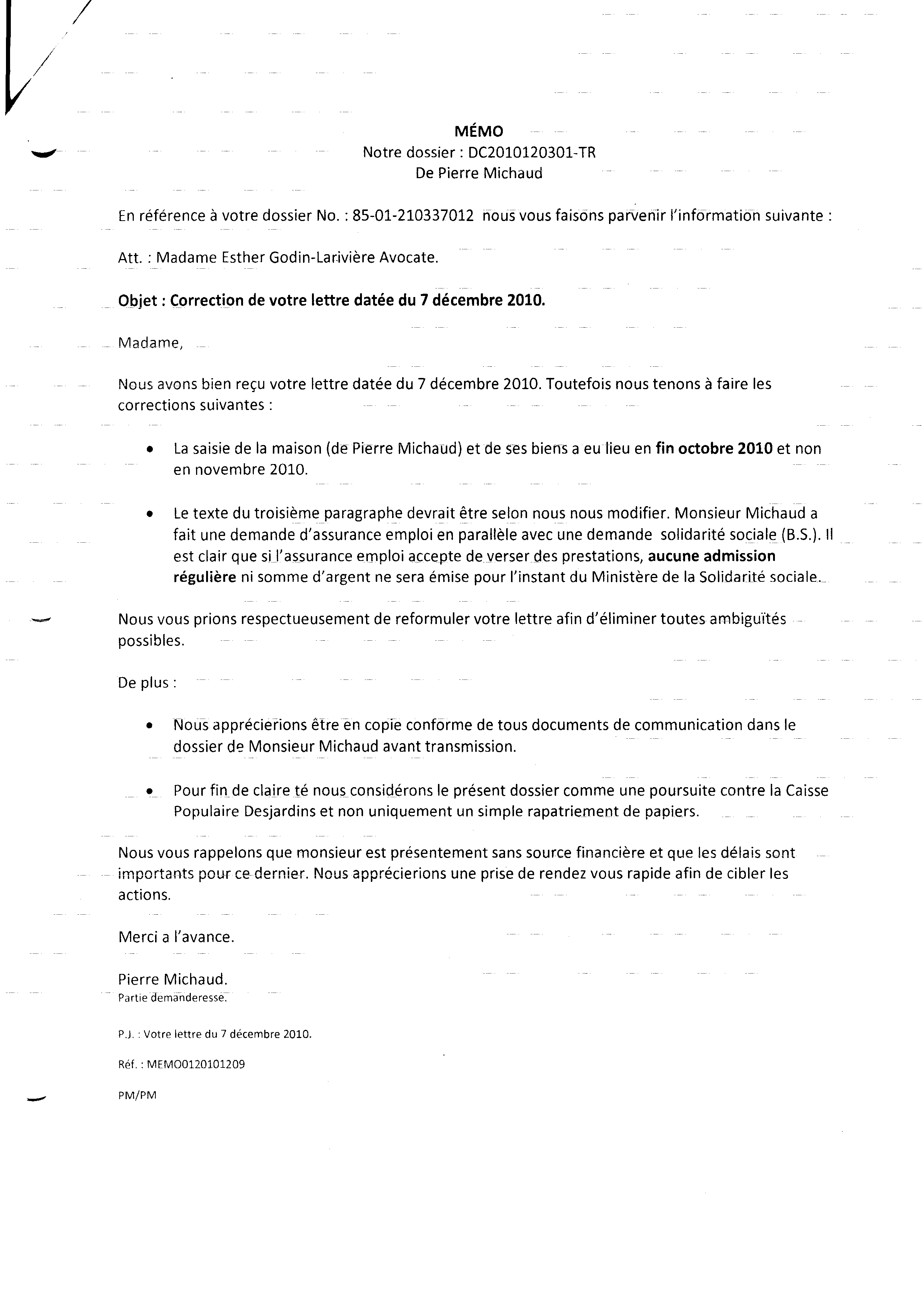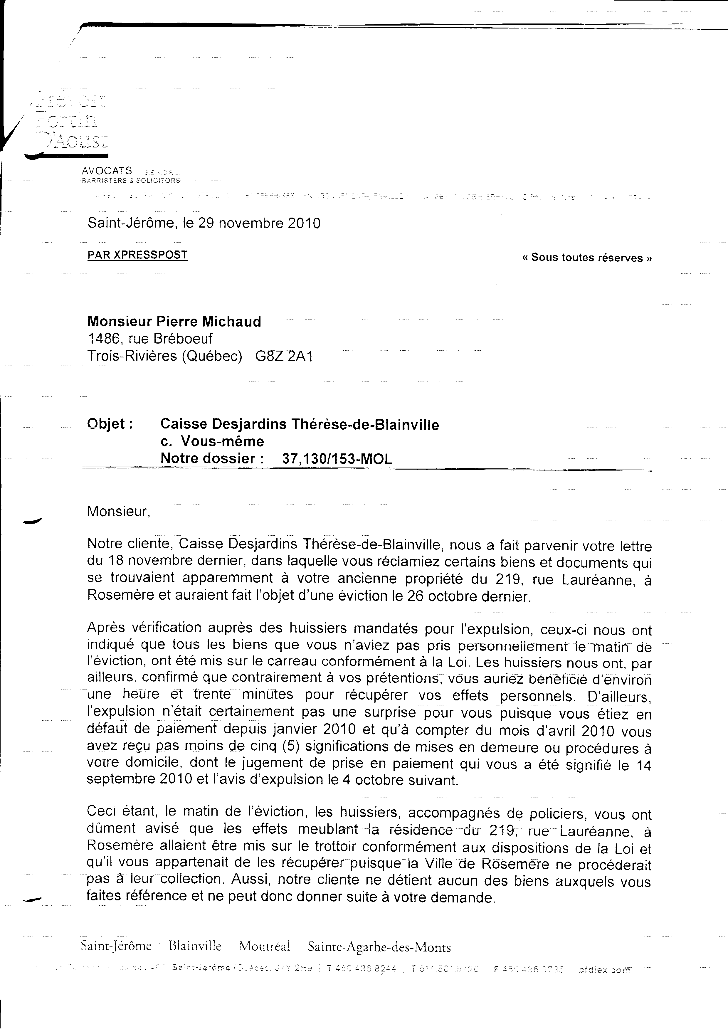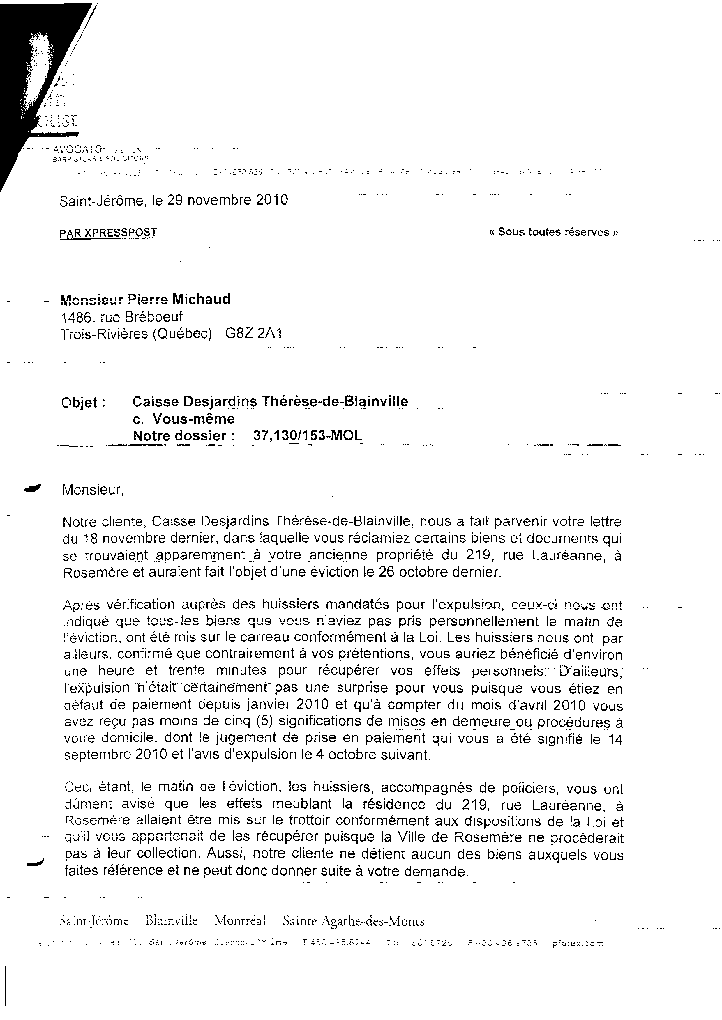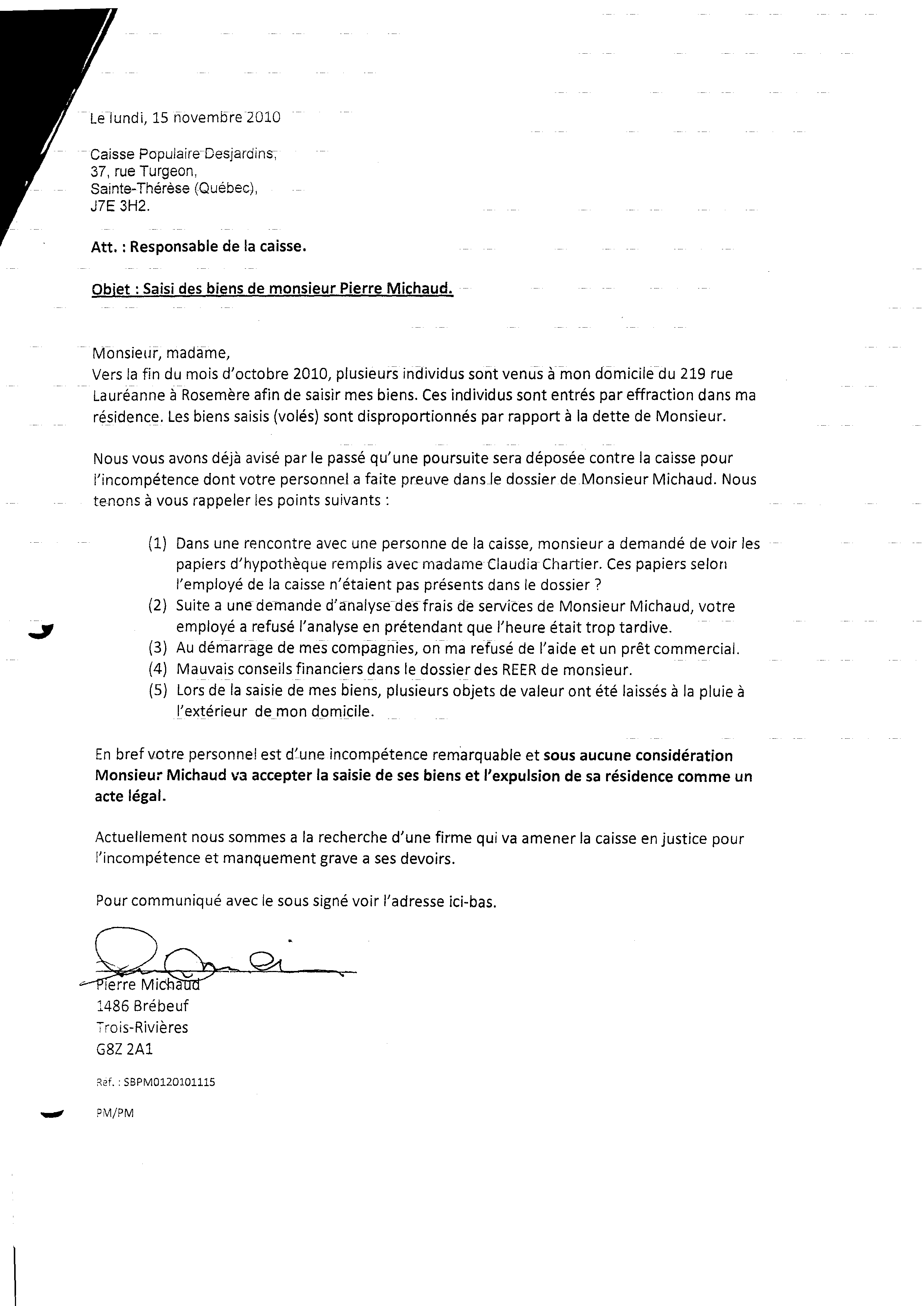 | 014 | Lettre du 18 novembre 2010 à la caisse populaire (saisi (vols) de biens de Pierre Michaud) | TR14 |