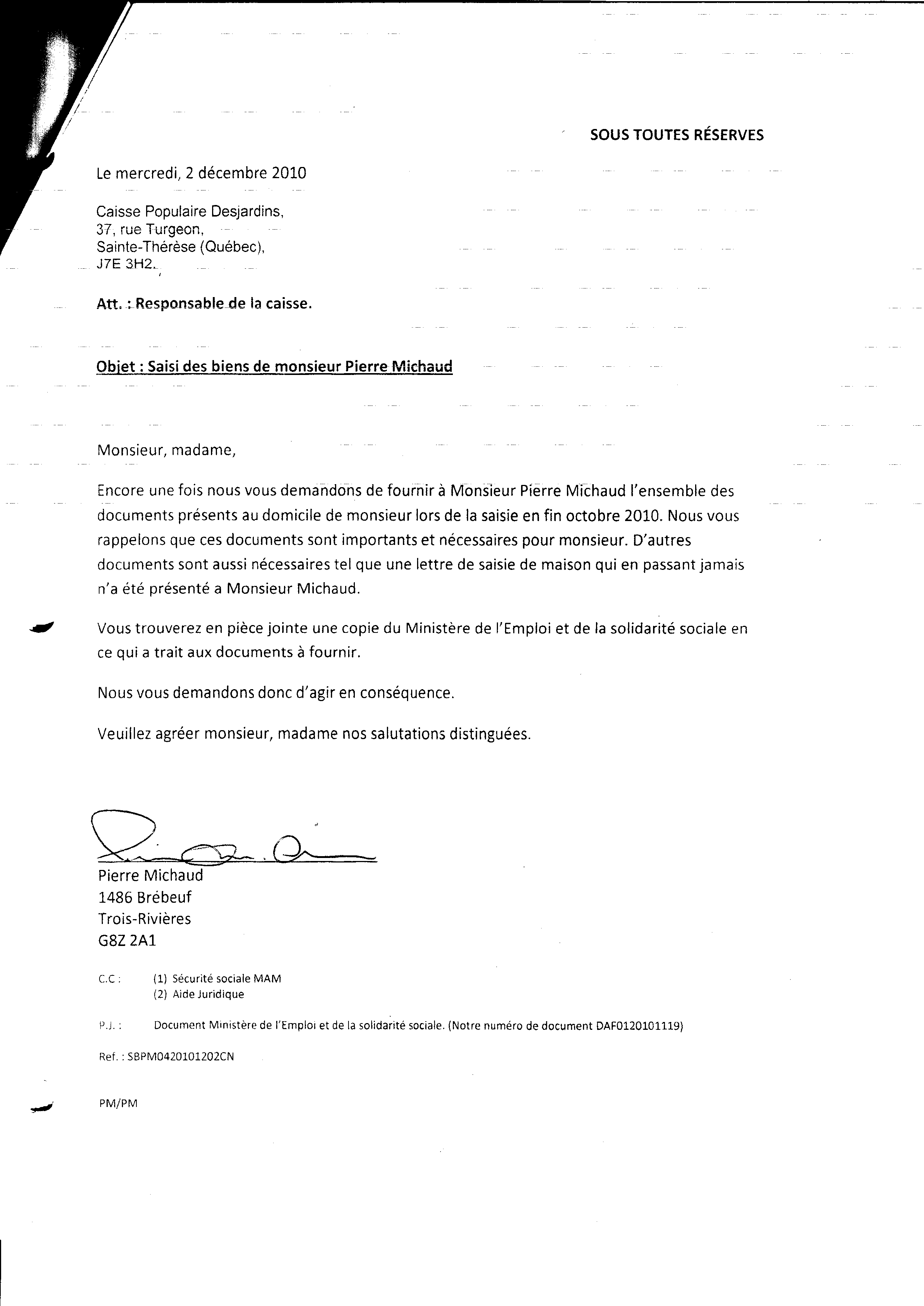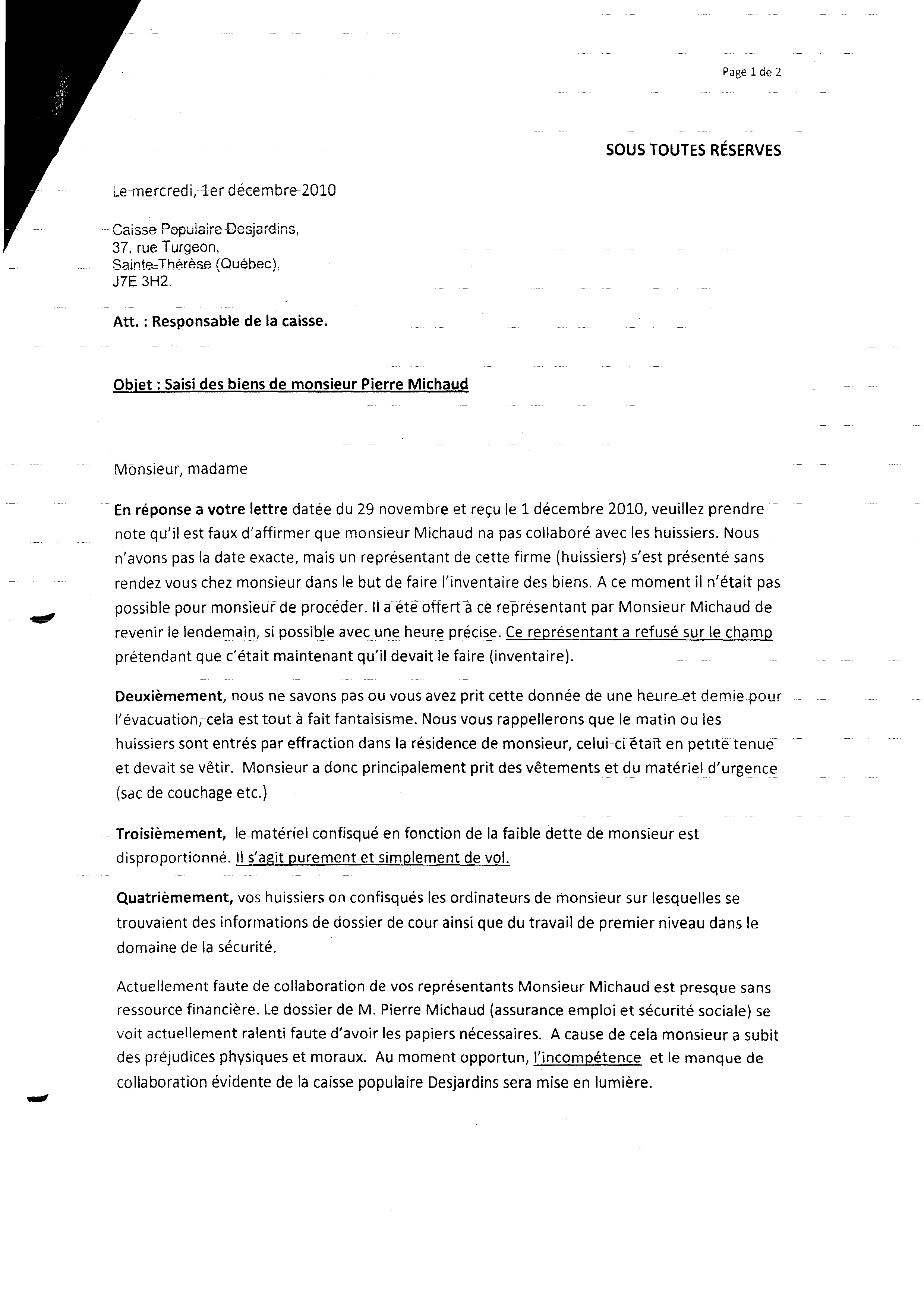 | 073 | Lettre de réponse a la lettre daté du 29 novembre 2010 de la caisse populaire le 01 décembre 2010 1 de 2 (saisie des biens) | TR73 |