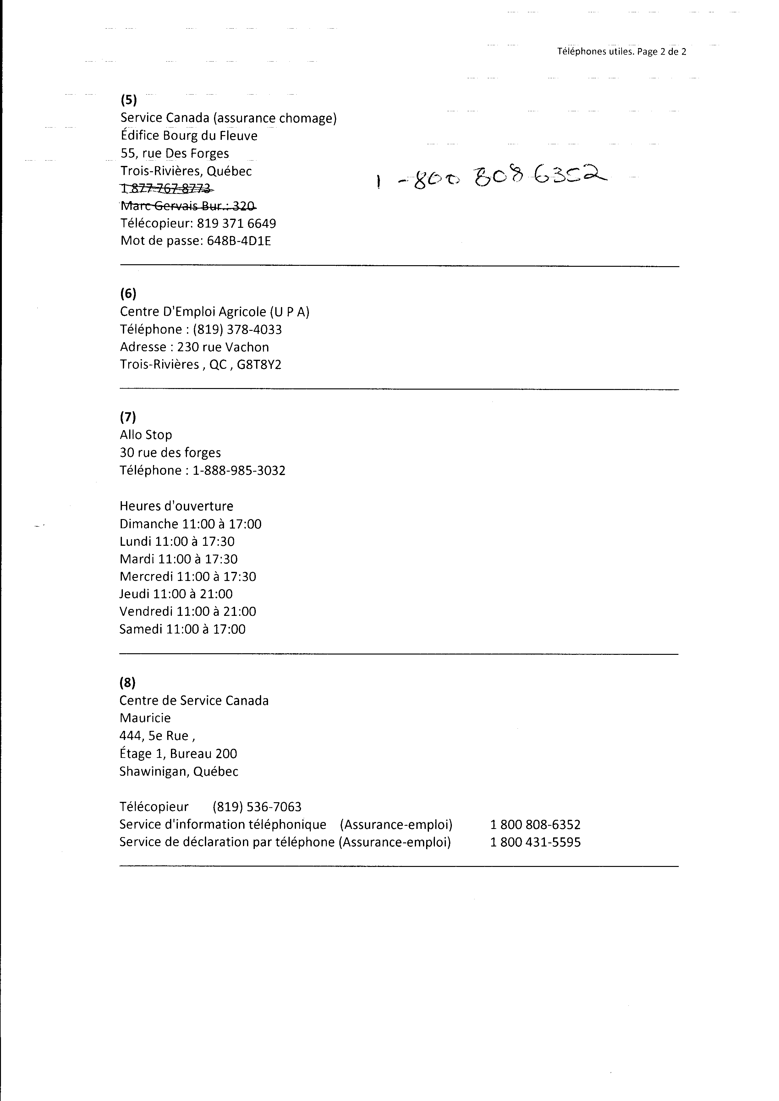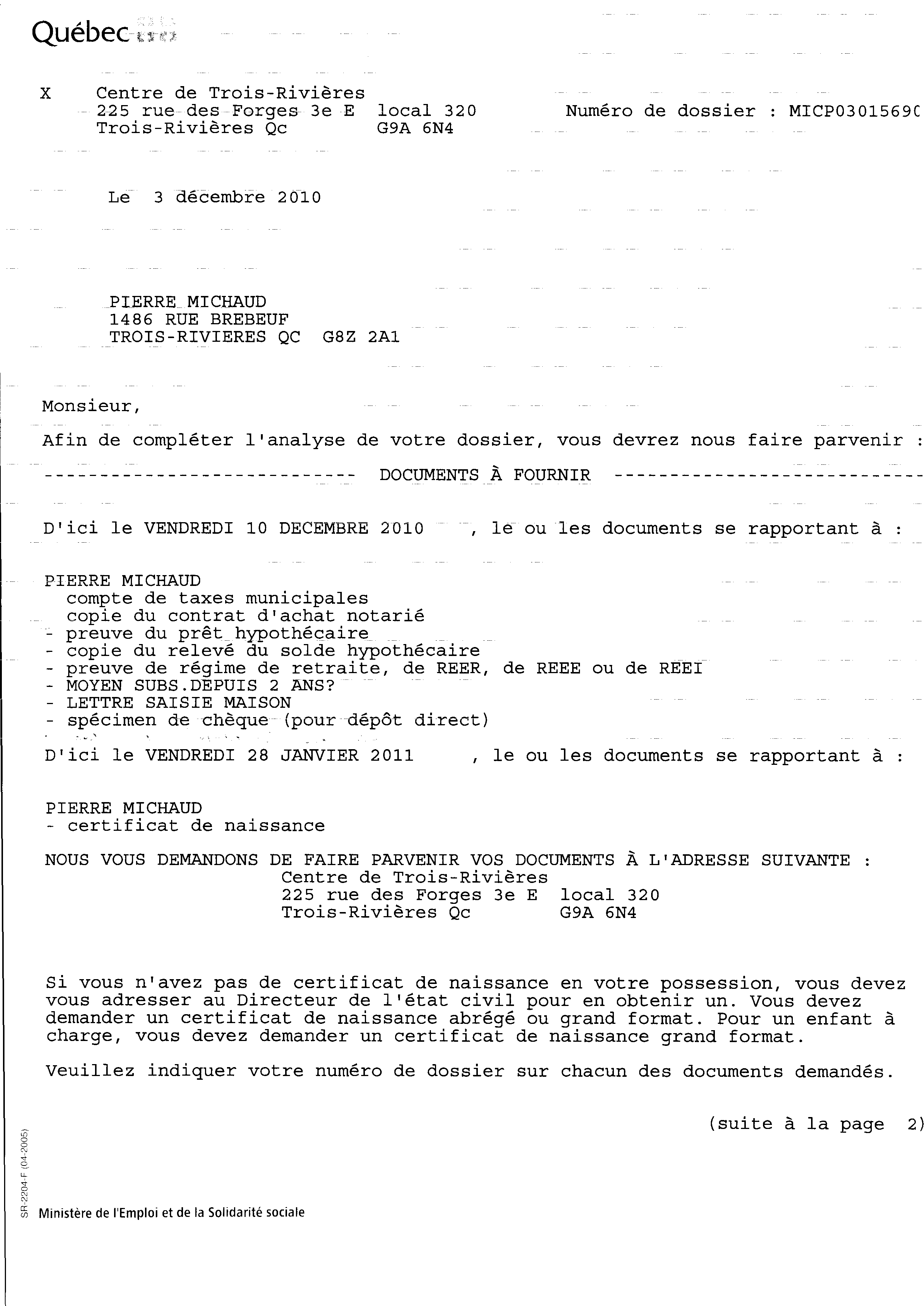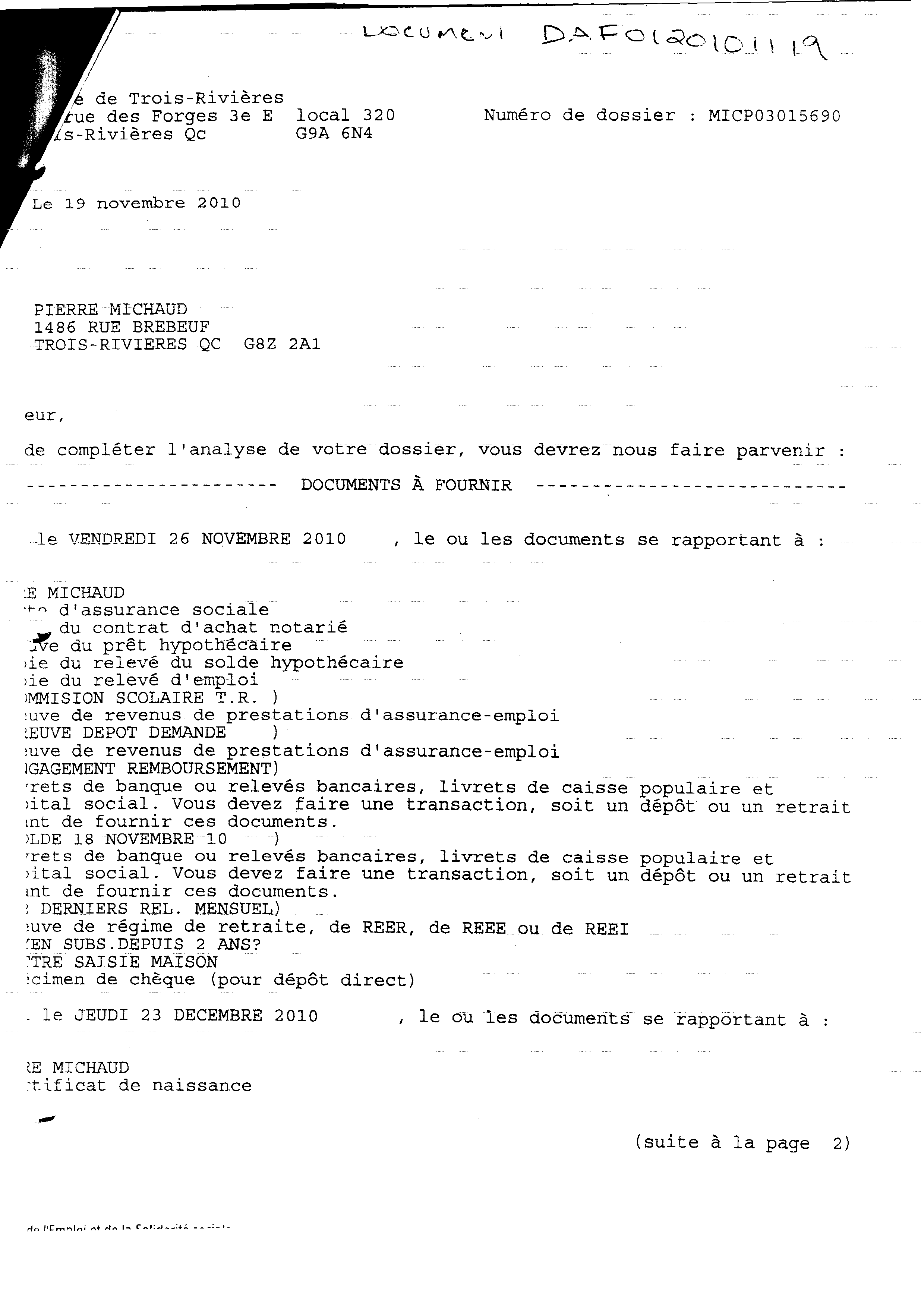| 019 | Demande de documents du centre local d'emploi de Trois-Rivières daté du 19 novenbre 2010. Voir note de document de la référence 012 (page 2 de 2) | TR19 |