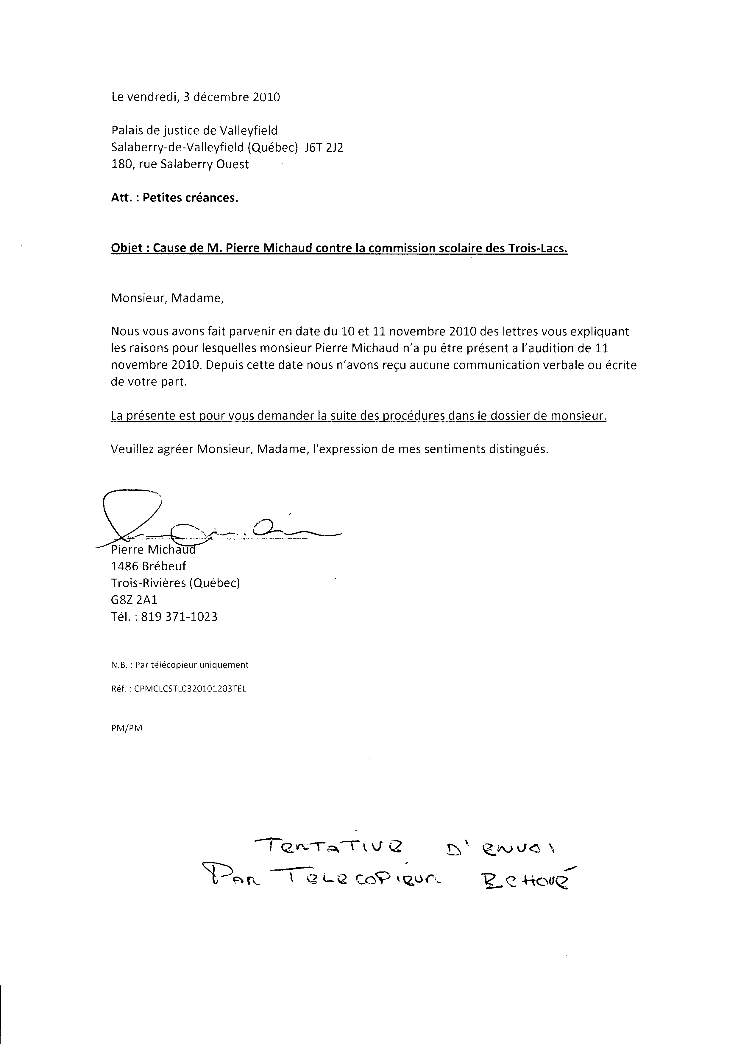 | 080 | Lettre au Palais de justice de Valleyfield pour fraude de la Commission Scolaire des Trois-Lacs le 03 décembre 2010 | TR80 |
