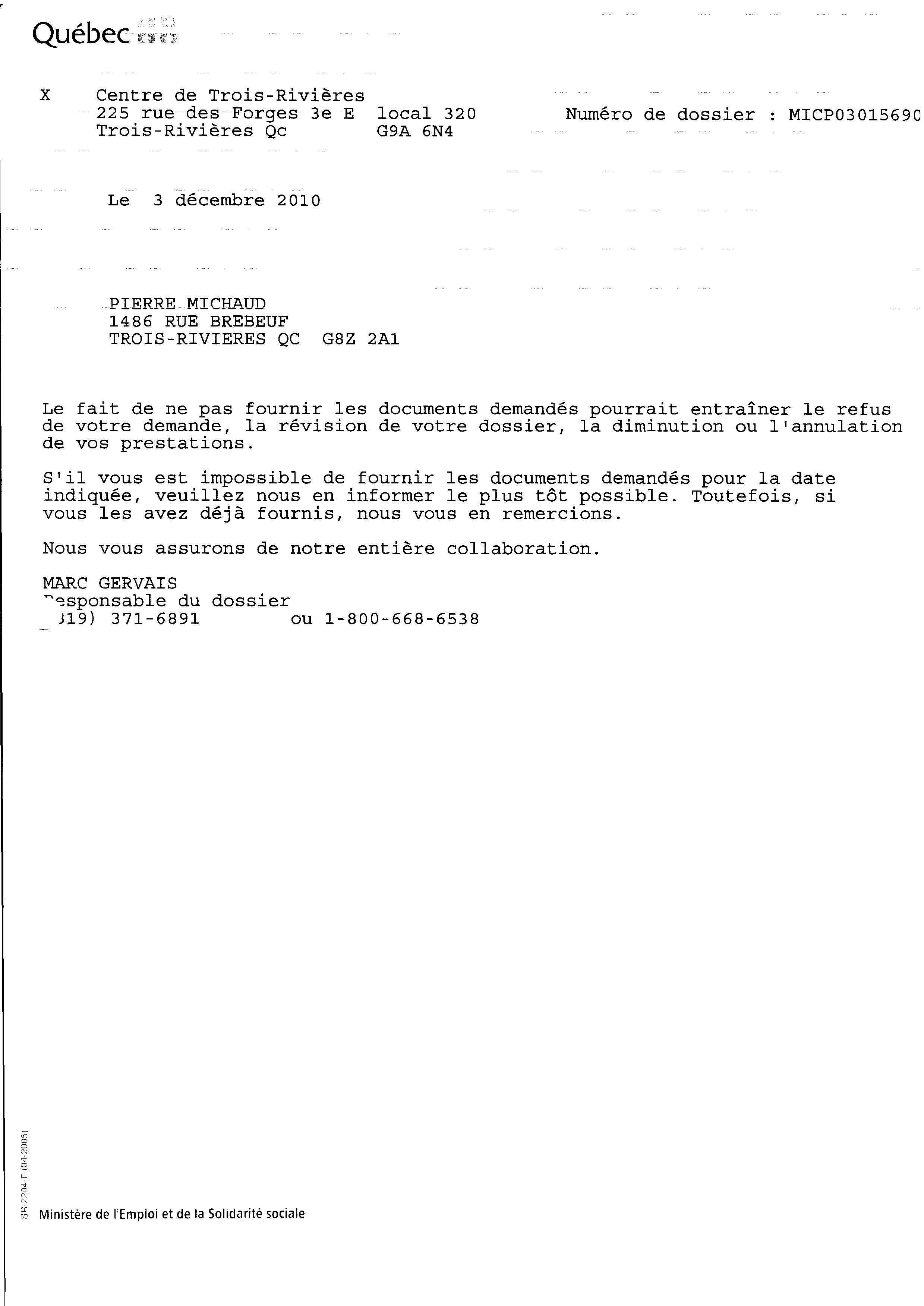 | 048 | Lettre de correction d'informations de l'aide social de Trois-Rivières émis par Pierre Michaud le 29 novembre 2010. | TR48 |
