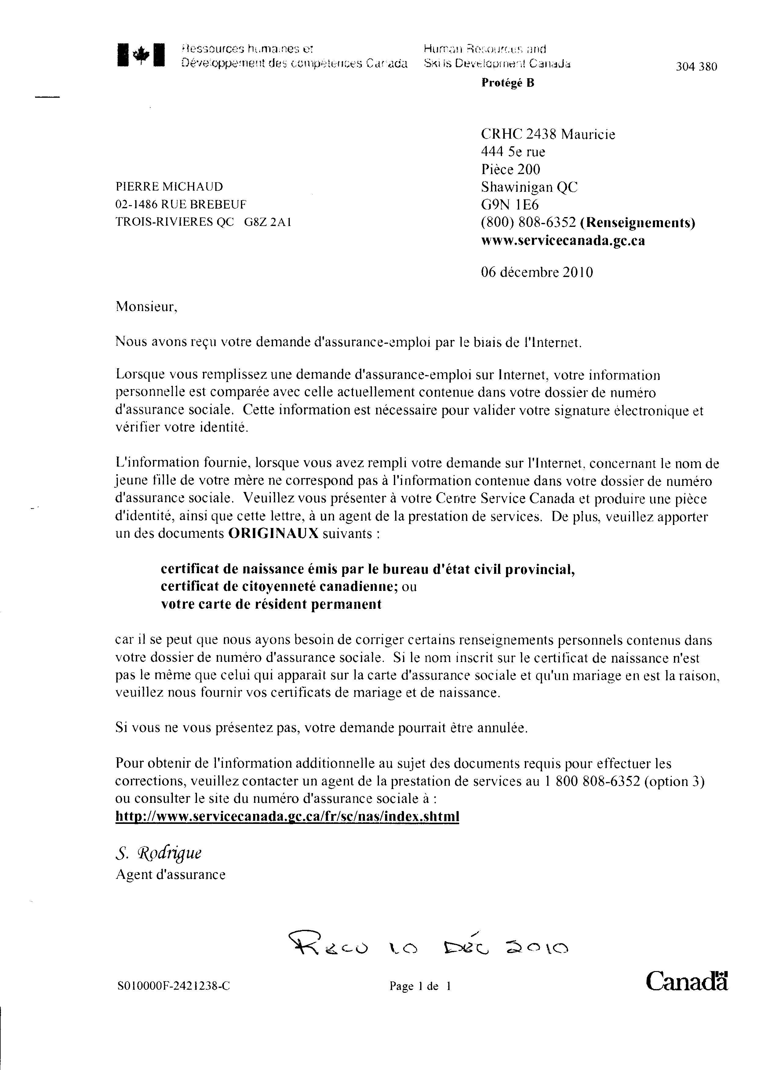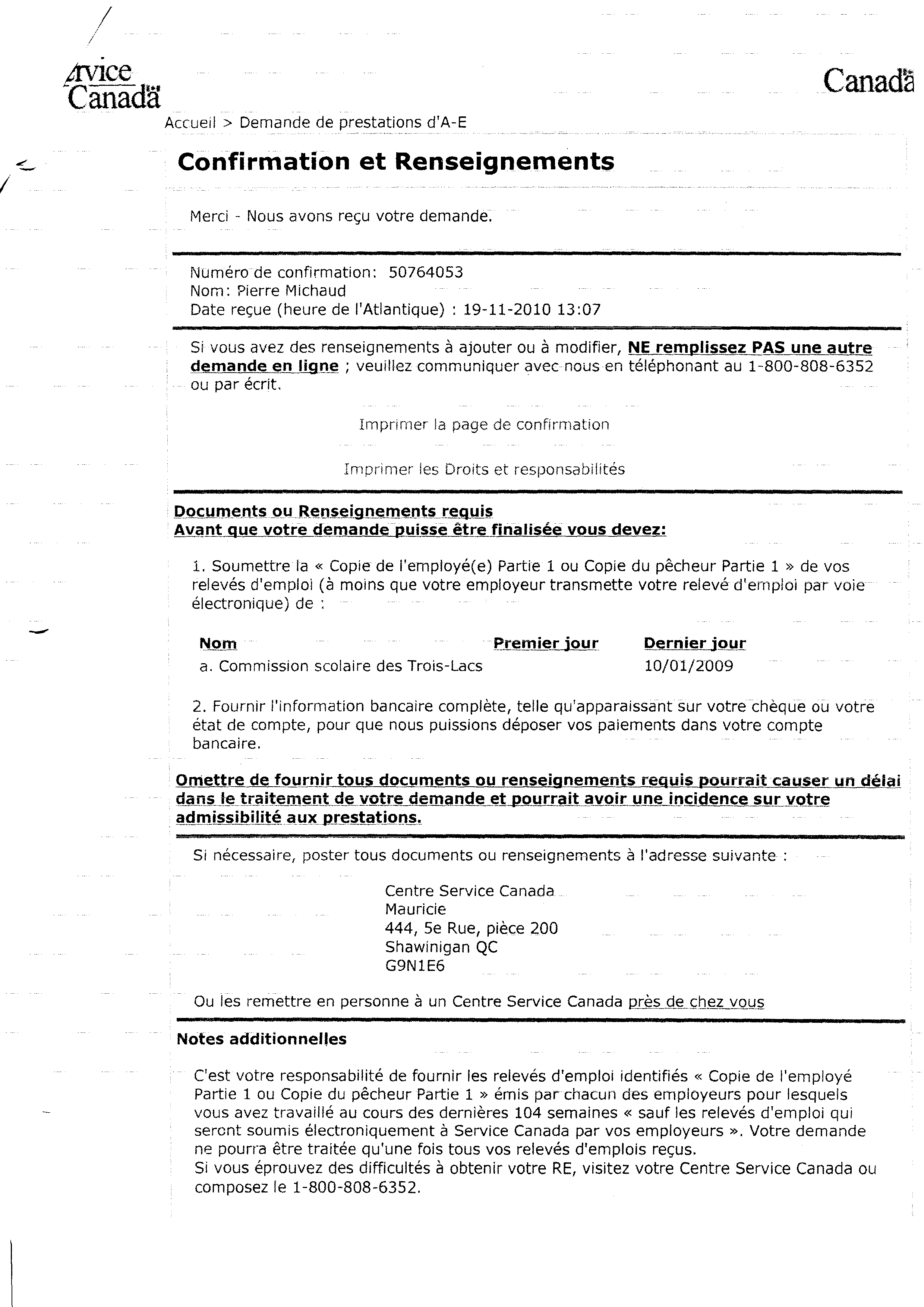 | 084 | Confirmation de la demande d'assurance chomage de Pierre Michaud auprès de Services Canada le 19 novembre 2010 | TR84 |