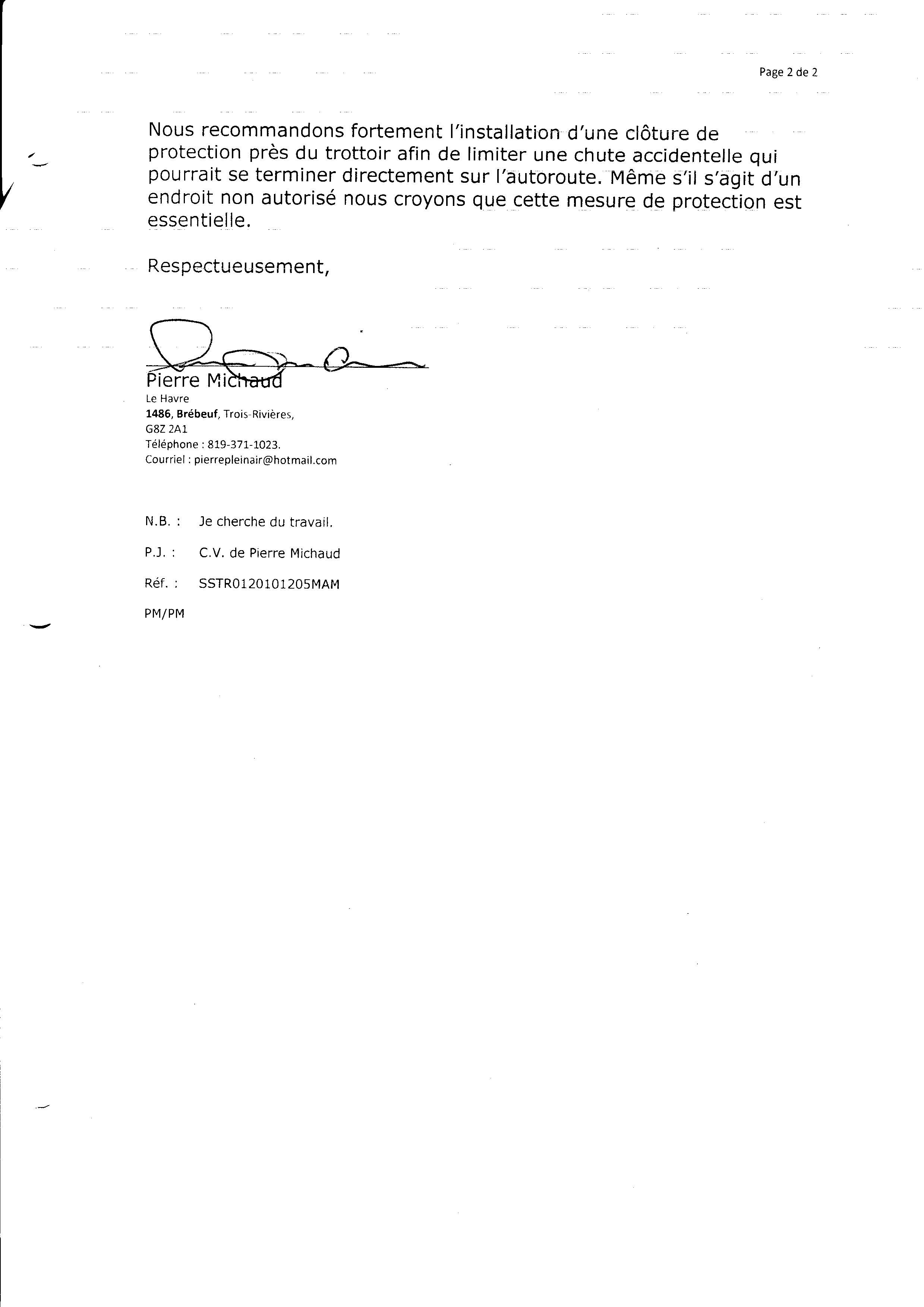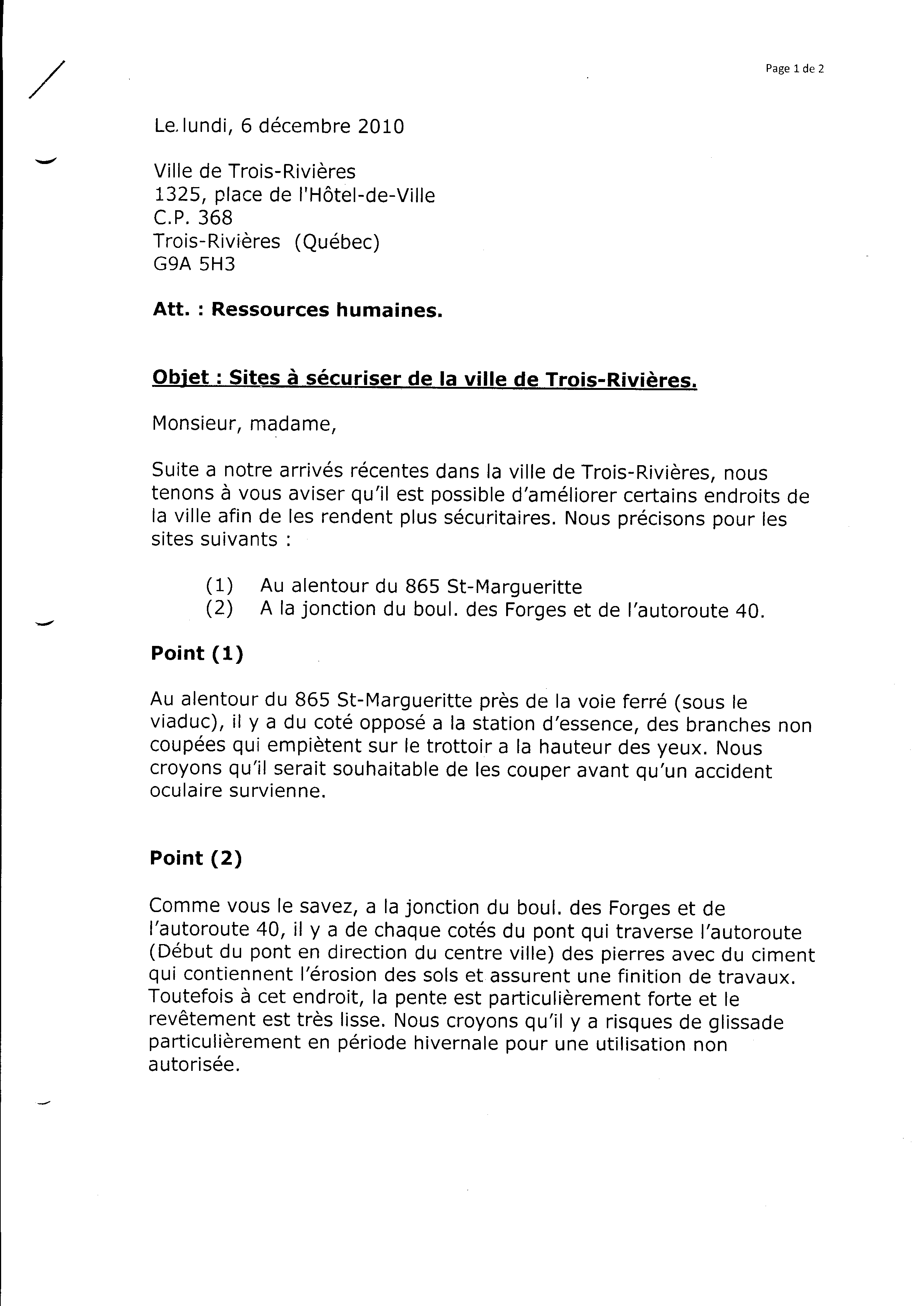 | 086 | Lettre qui avise et demande a l'hôtel de Ville de Trois-Rivières de sécuriser un endroit dangereux pour les piétons 2 de 2 | TR86 |