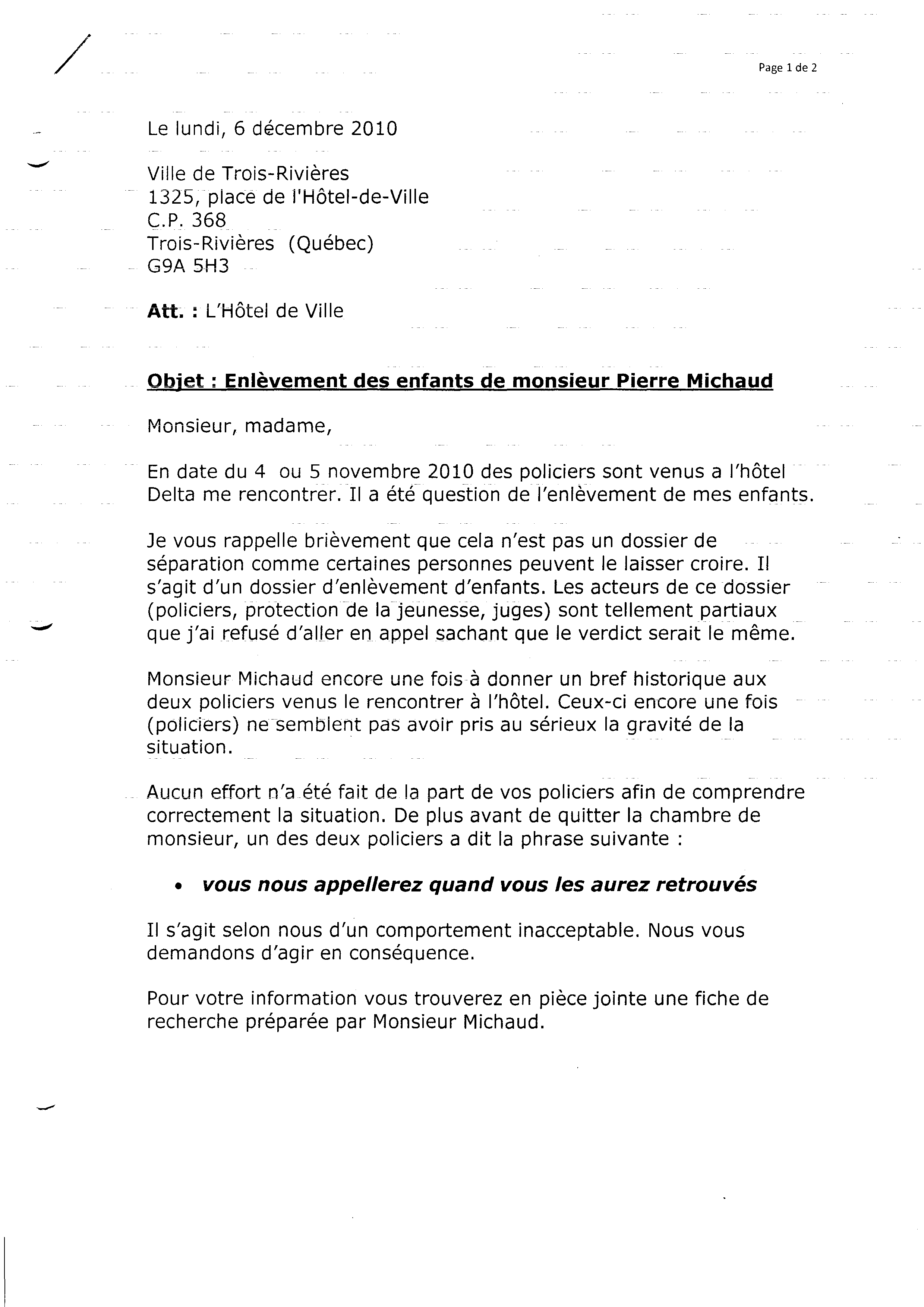 | 087 | Lettre qui avise la corruption de deux policiers, et demande a l'hôtel de Ville de Trois-Rivières pour de l'aide dans le dossier de enfants de Pierre Michaud 1 de 3 | TR87 |