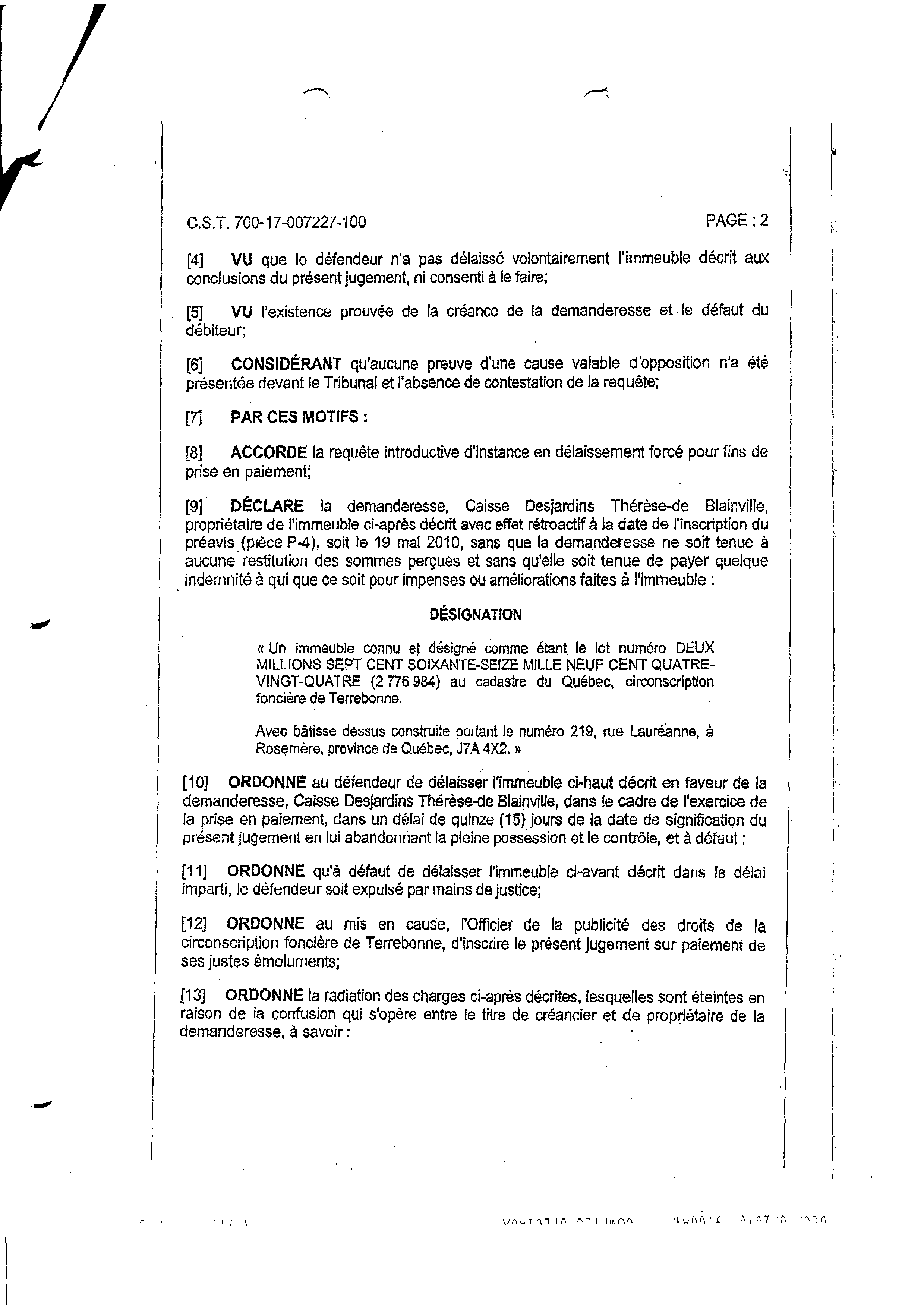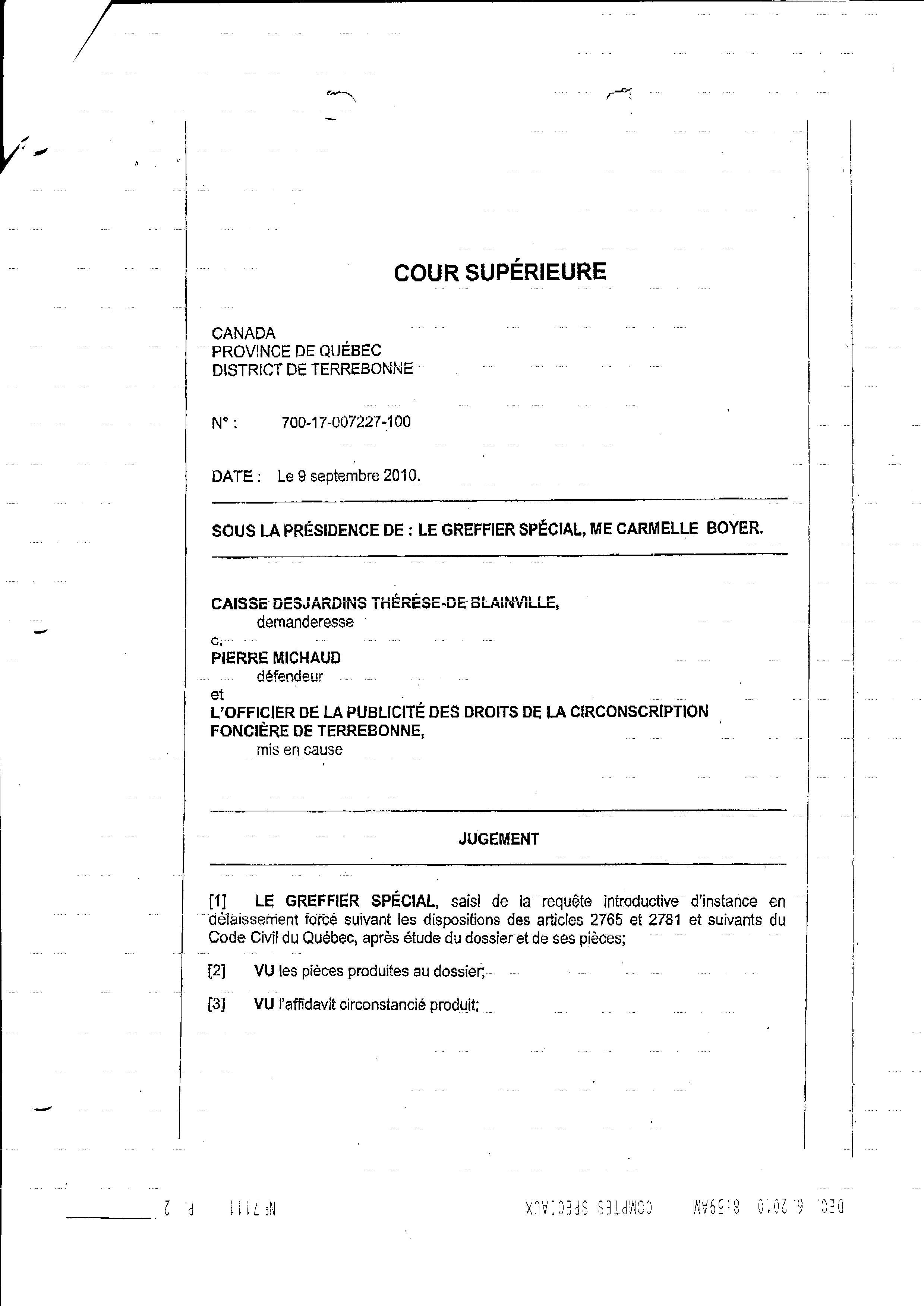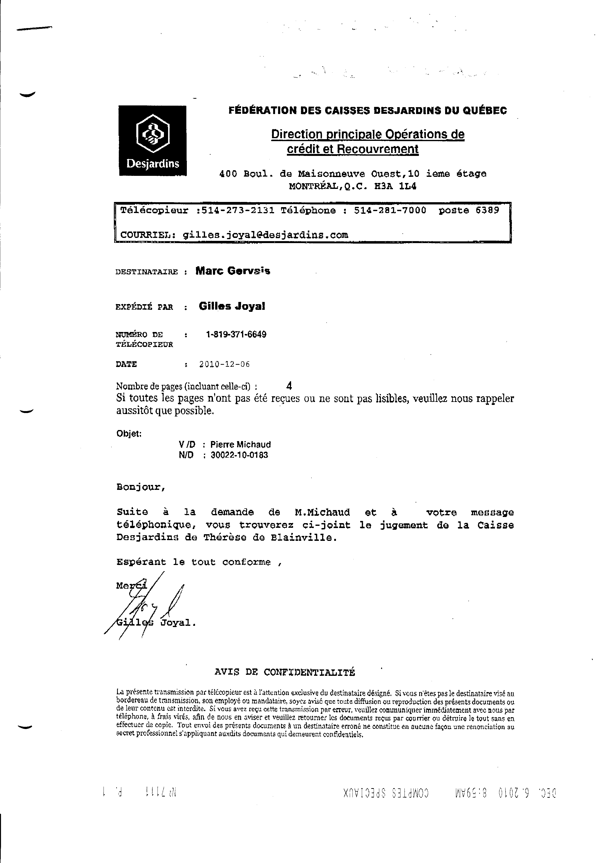| 111 | Page de transmission de la Caisse populaire (envoi par télécopieur) LE JUGEMENT ce 09 décembre 2010 | TR111 |