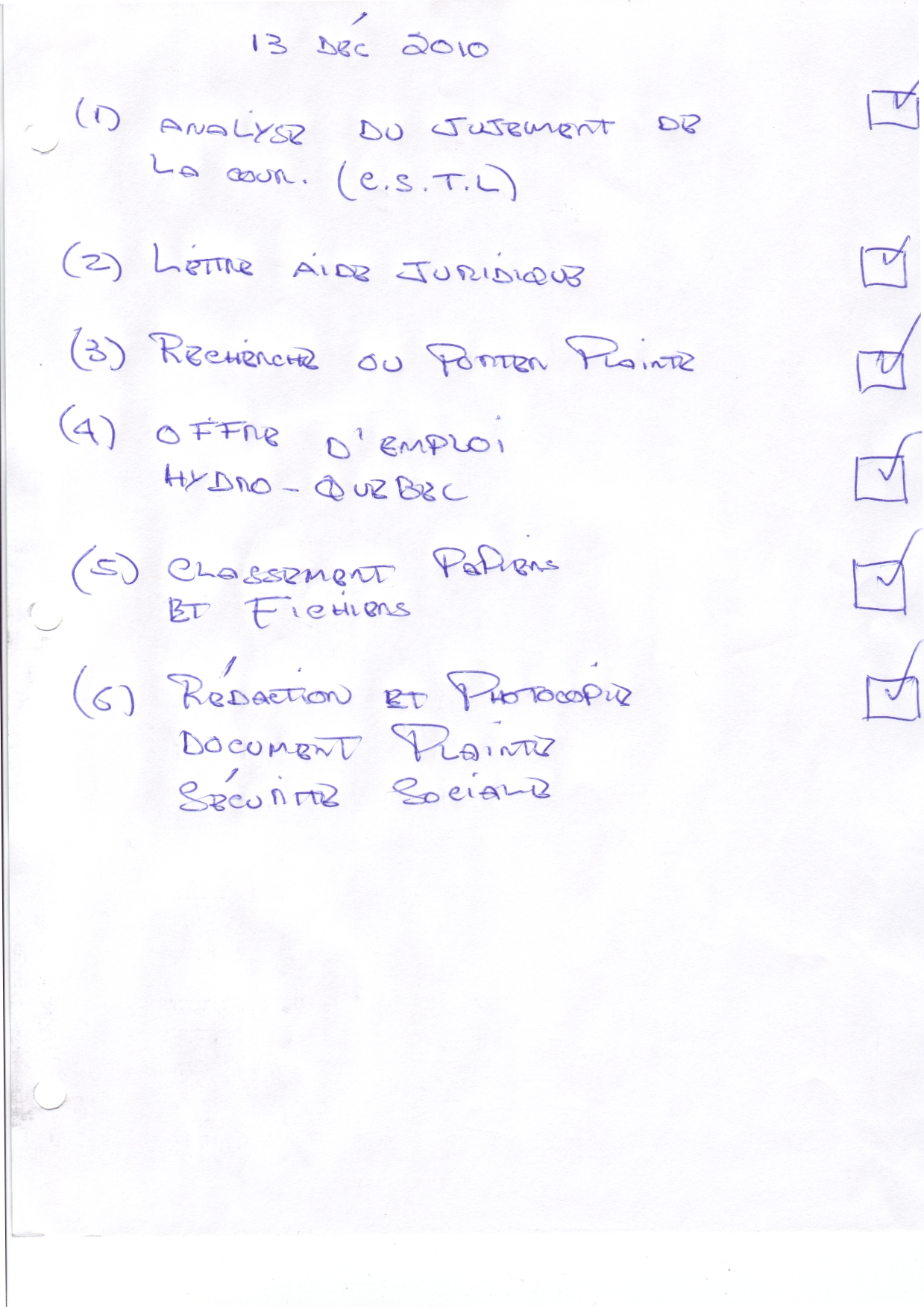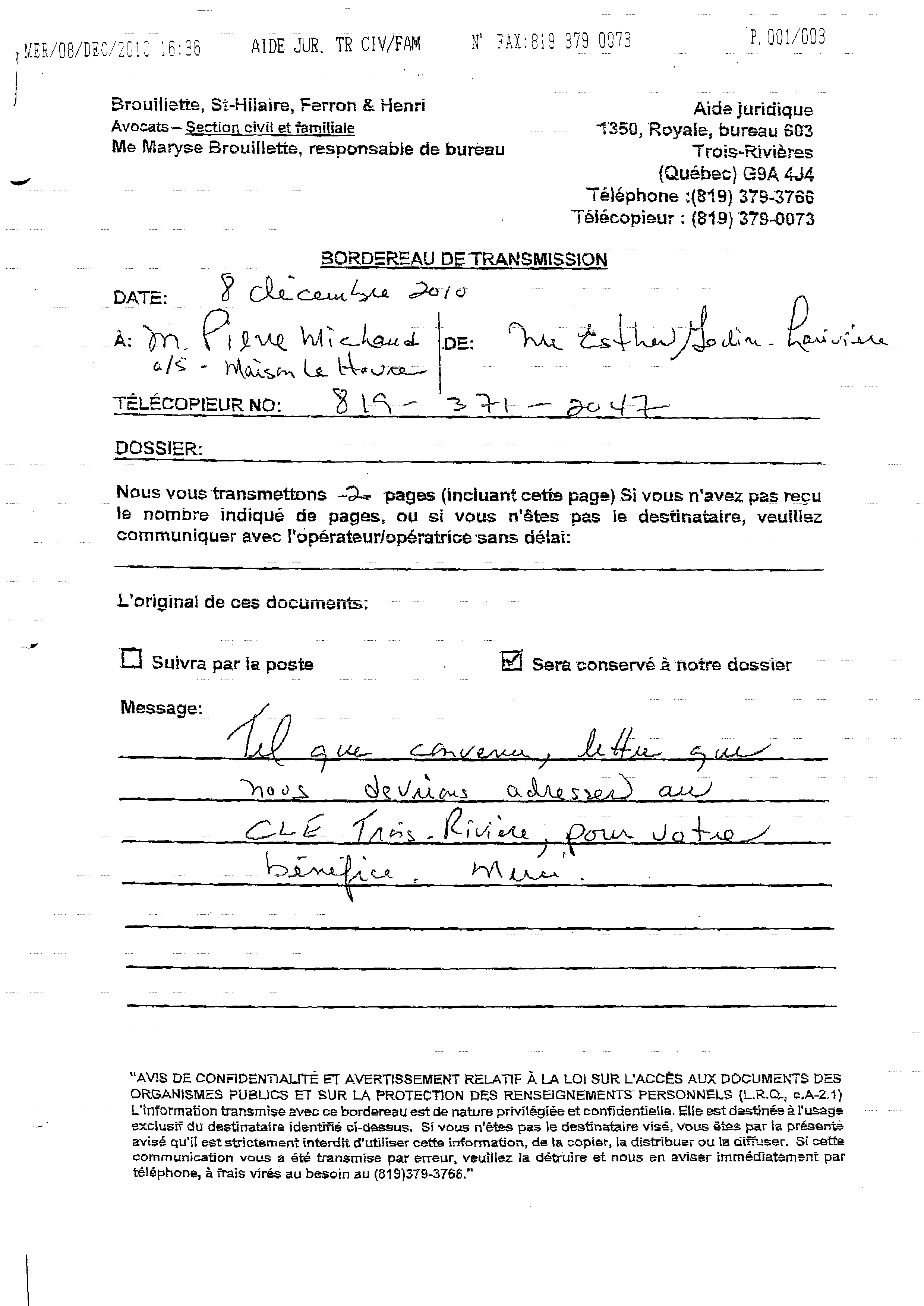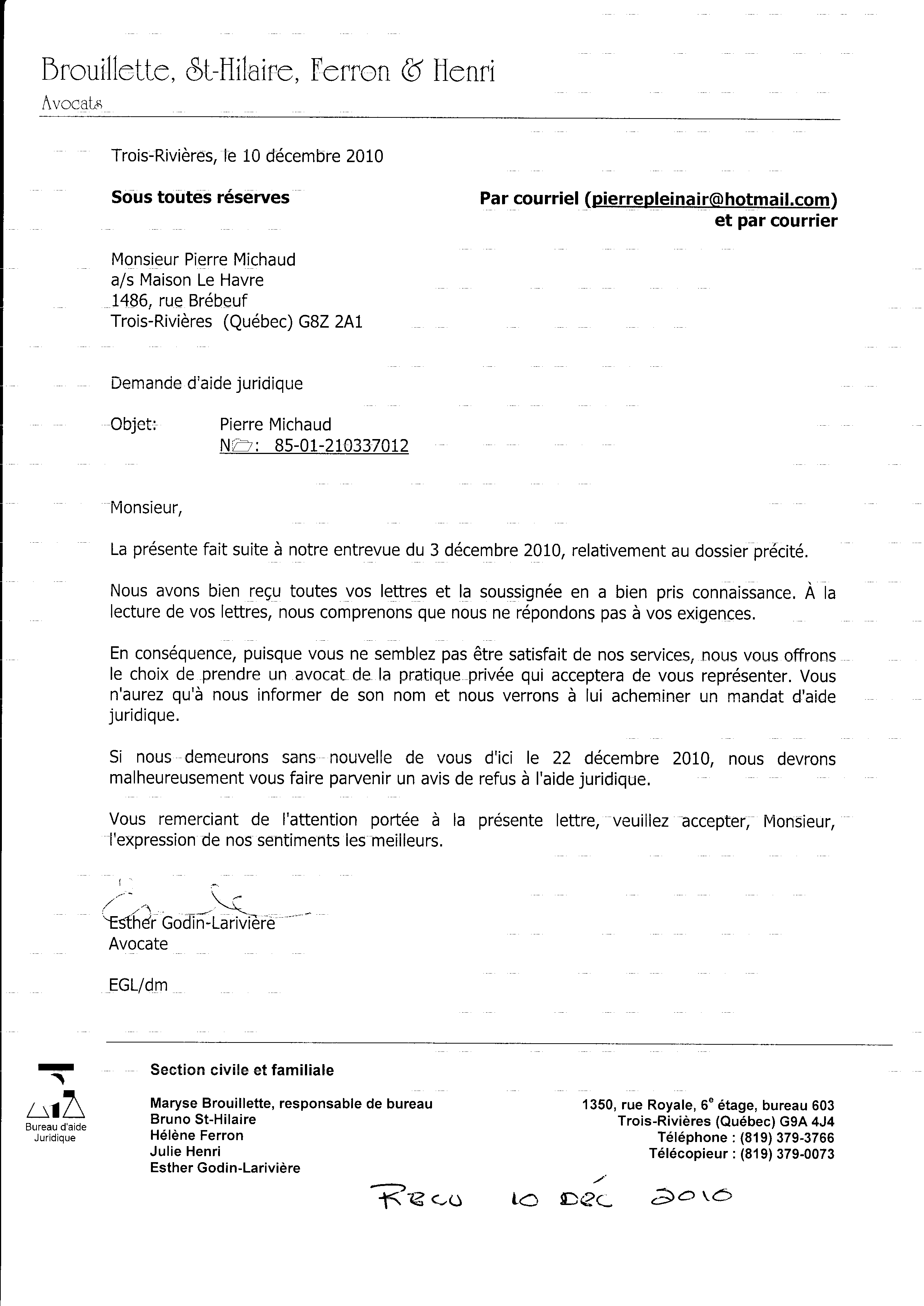 | 070 | Lettre de demande d'aide juridique au 1350 Royale Trois-Rivières le 2 décembre 2010 2 de 2 | TR70 |