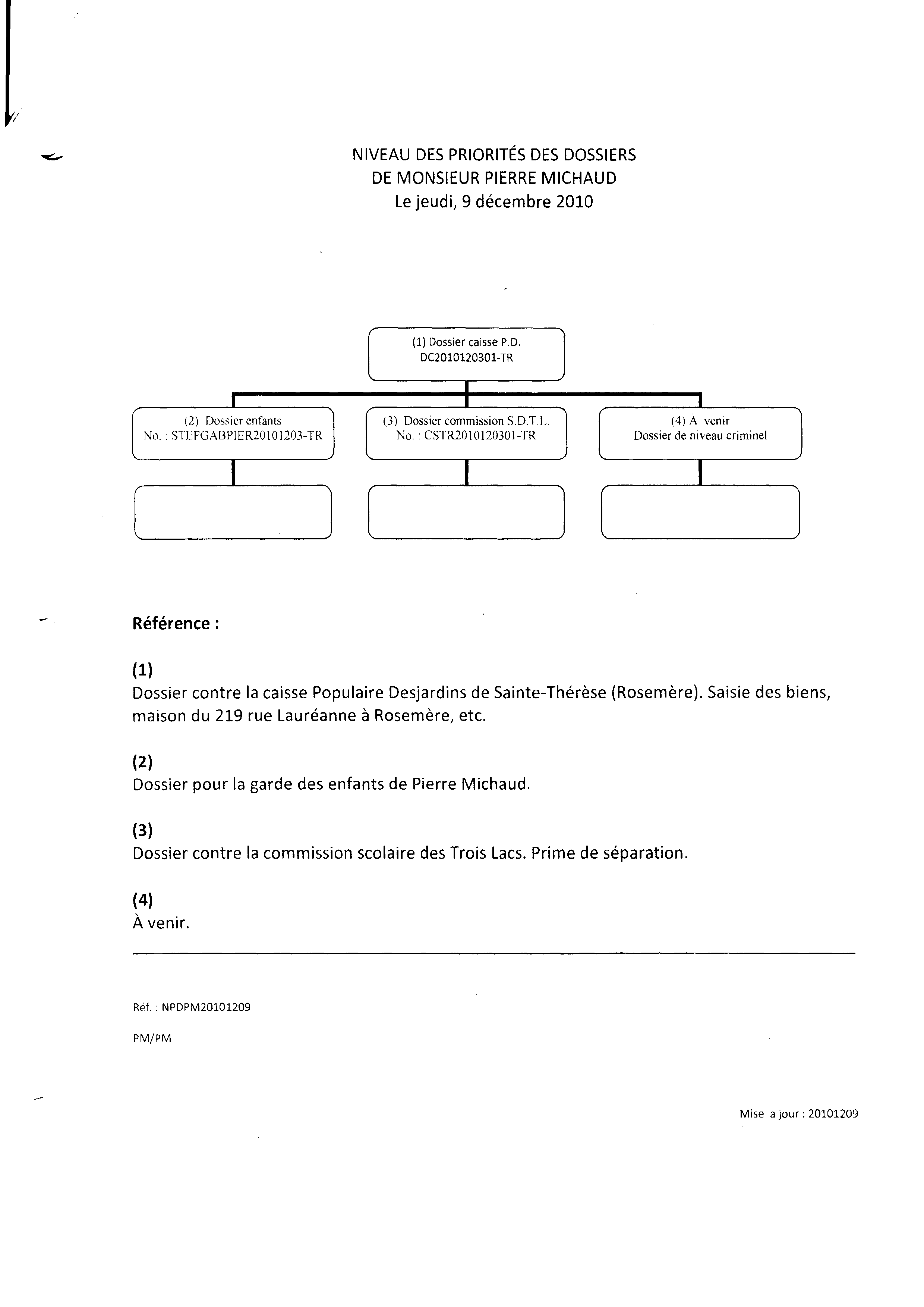 | 104 | Mémo de Pierre Michaud expliquant la priorité des dossier de Pierre Michaud le 09 décembre 2010 1 de 2 | TR104 |