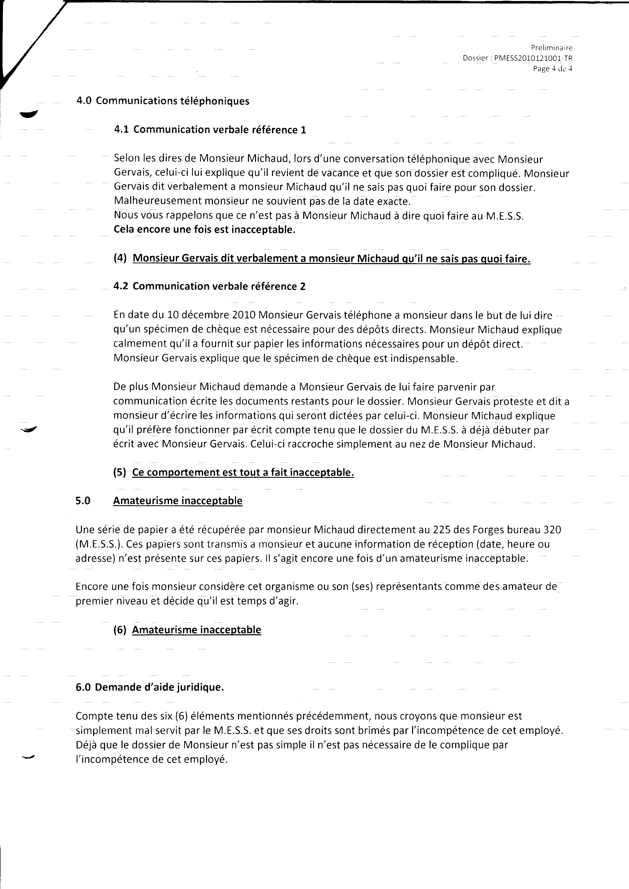 | 121 | Informations pour l'aide juridique et avis de plainte contre M. Marc Gervais du CLE de Trois-Rivières le 10 décembre 2010 4 de 5 | TR121 |