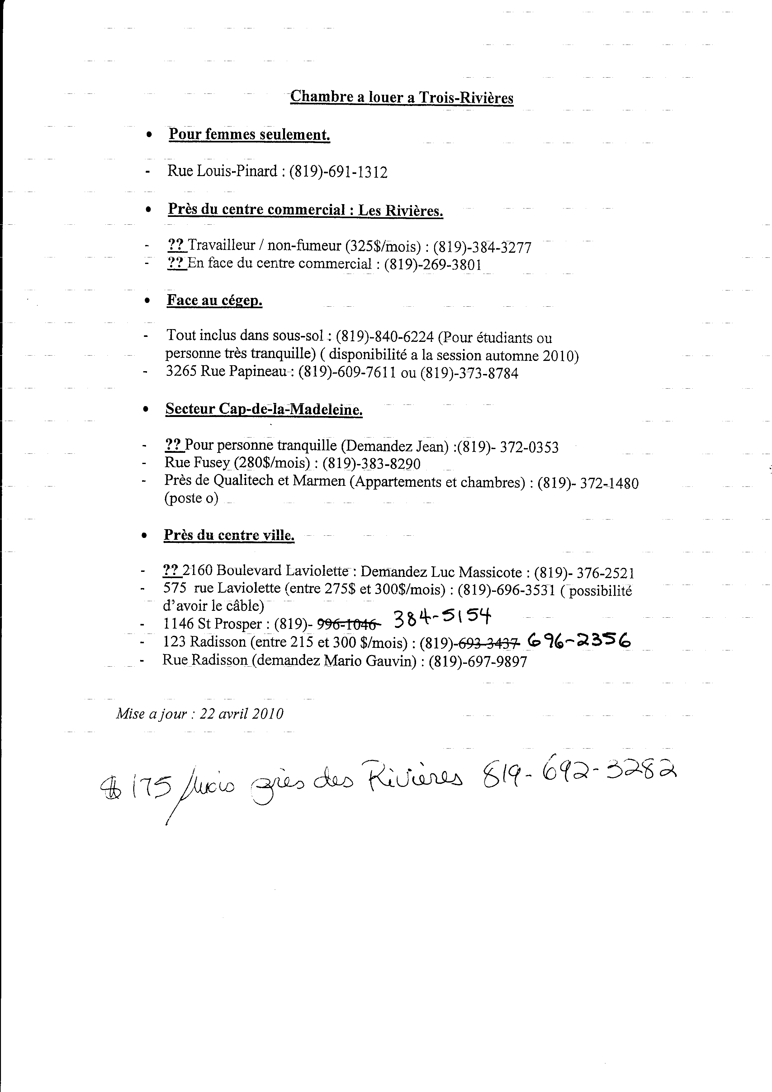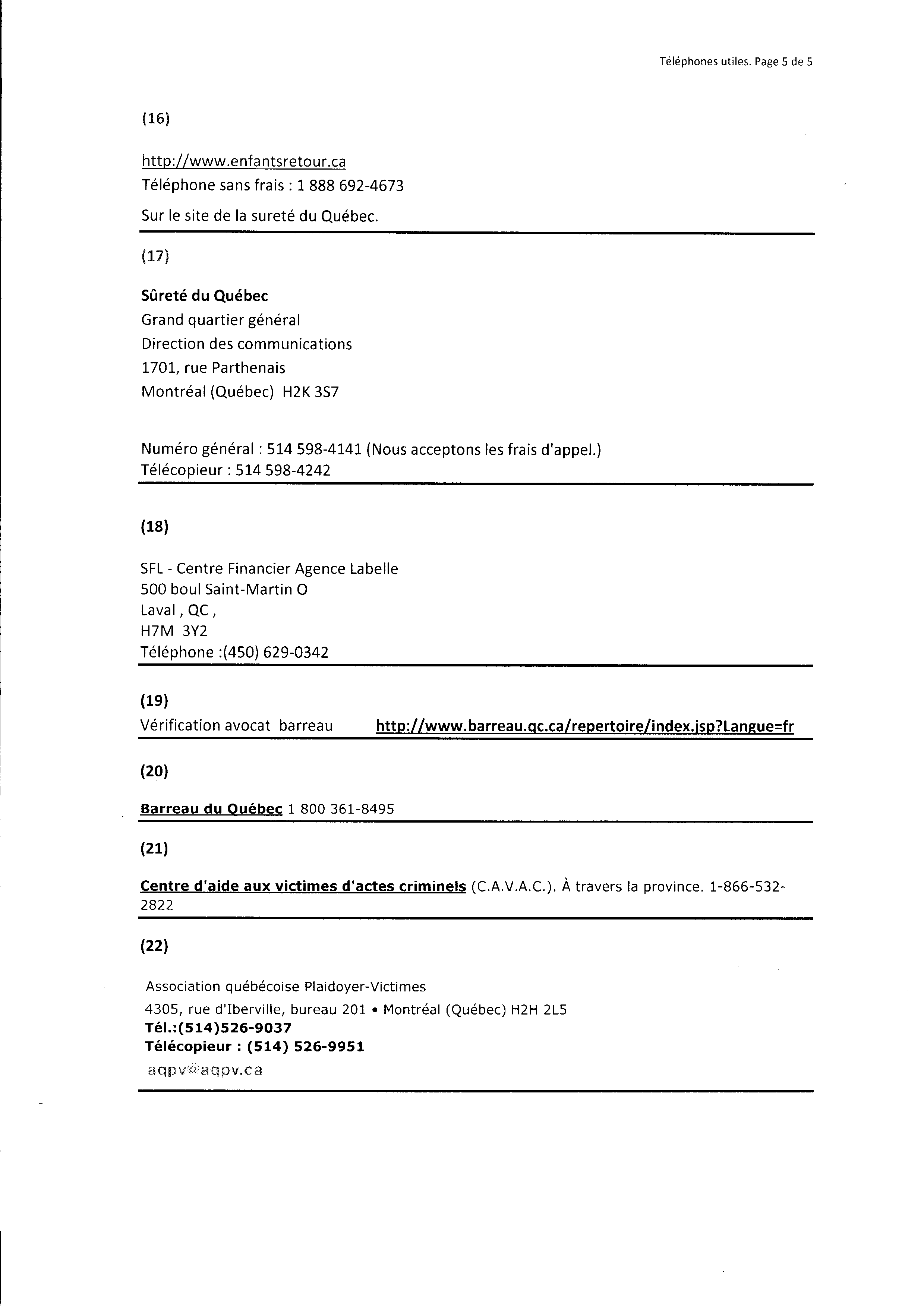 | 134 | Document avec des adresses fournies par le HAVRE de Trois-Rivières¸(1486 Brébeuf) ou j'ai été agressé physiquement (575 Laviolette Trois-Rivières) | TR133 |